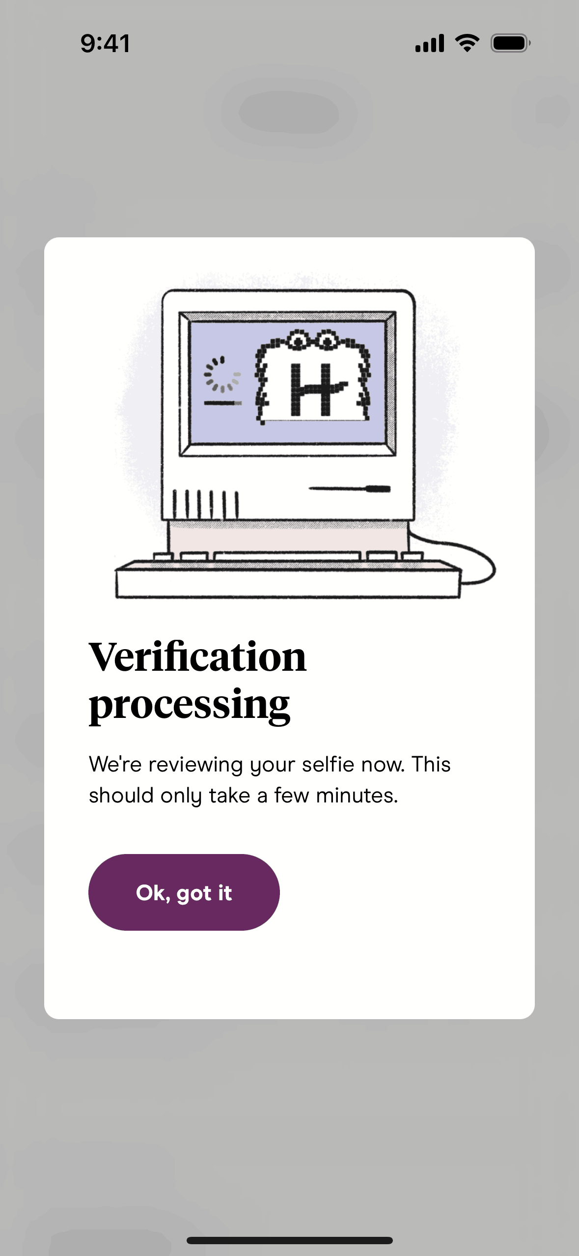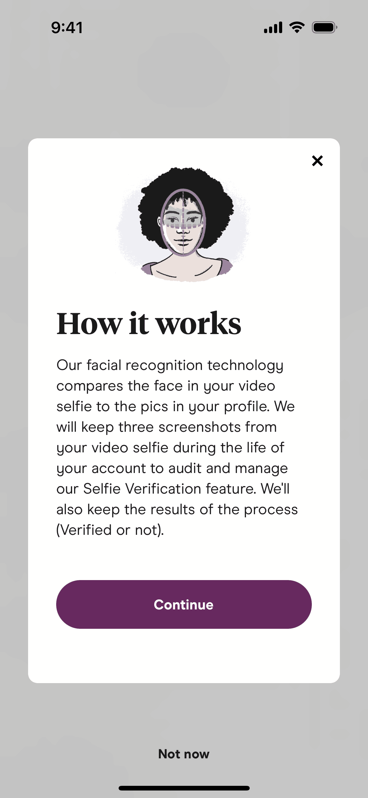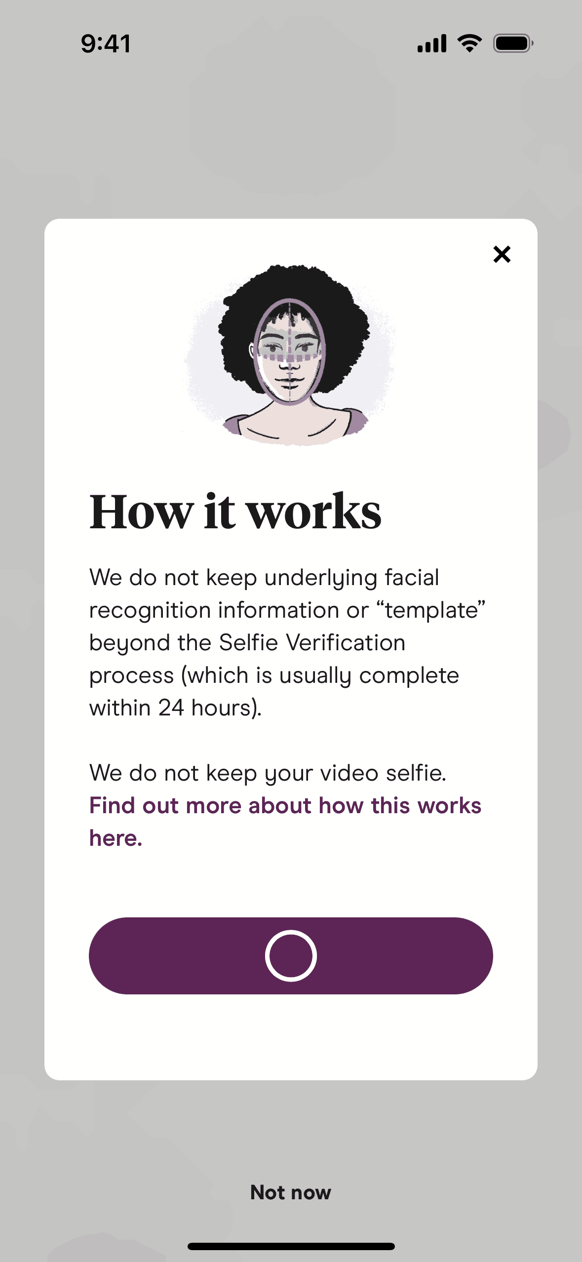 The user initiates selfie verification from the settings, views informational modals, and submits a video selfie. The app then processes the selfie for verification.