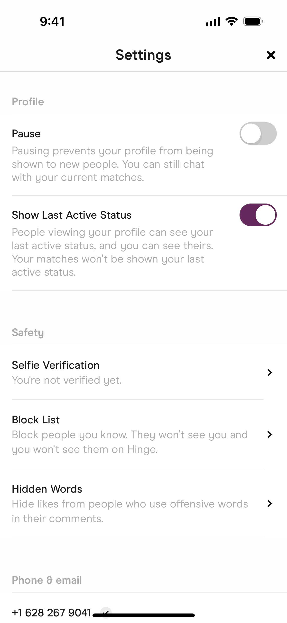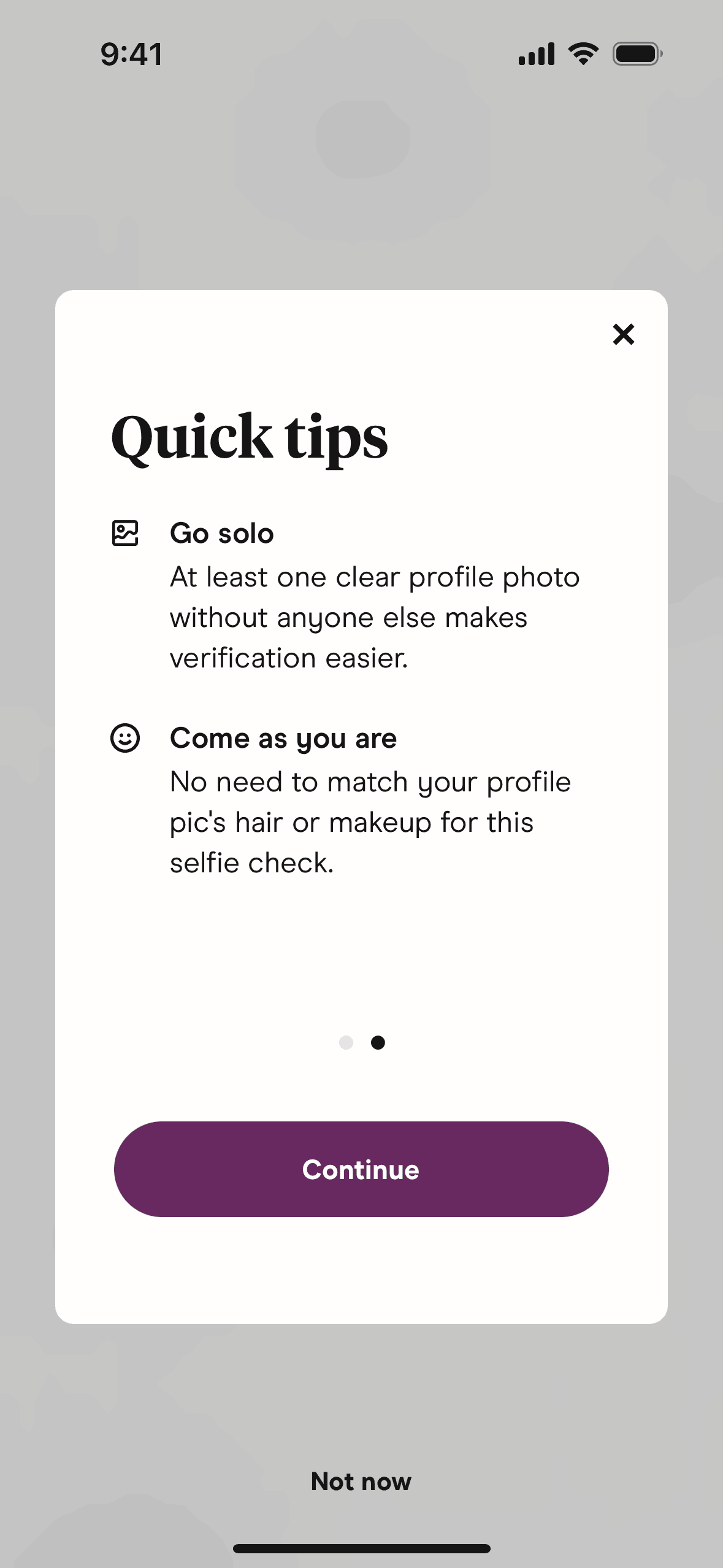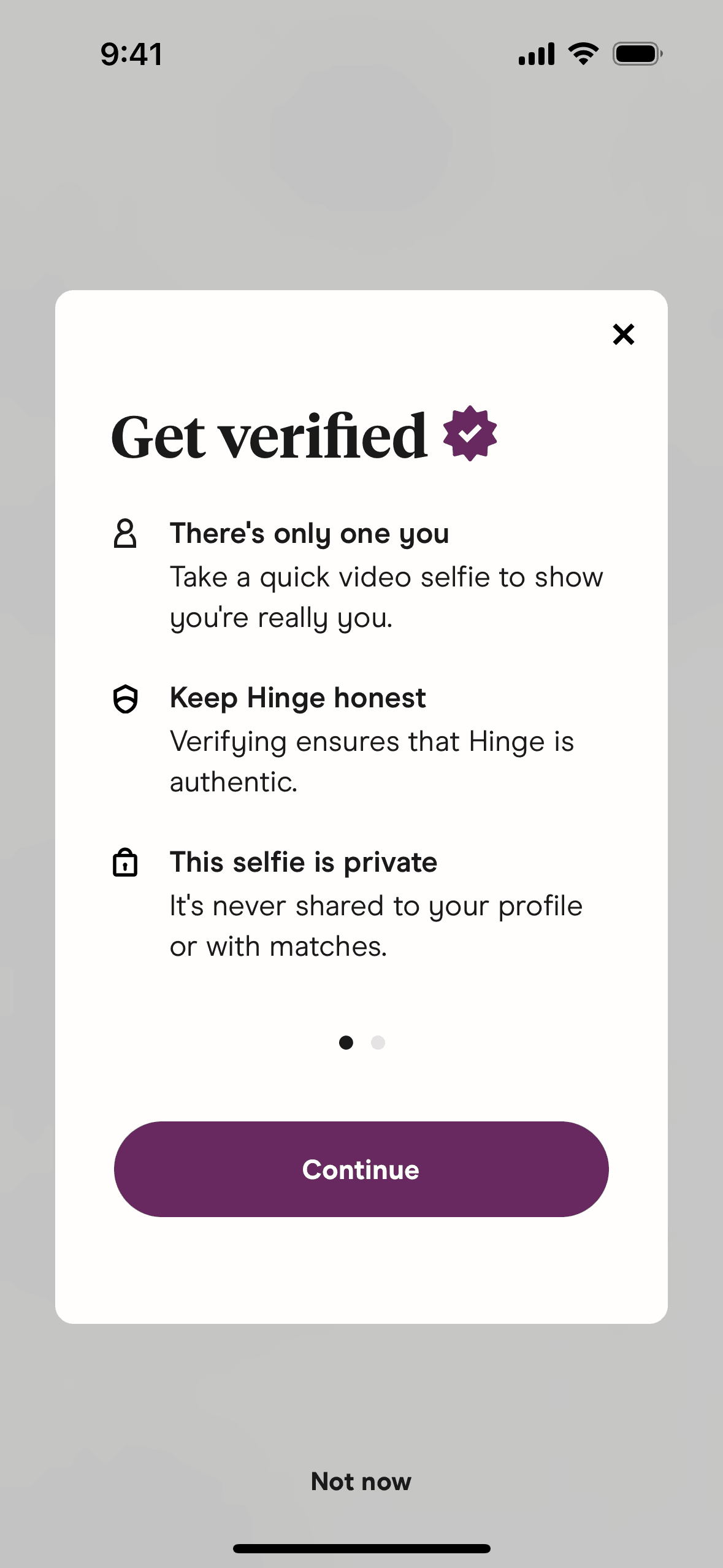 The user initiates selfie verification from the settings, views informational modals, and submits a video selfie. The app then processes the selfie for verification.