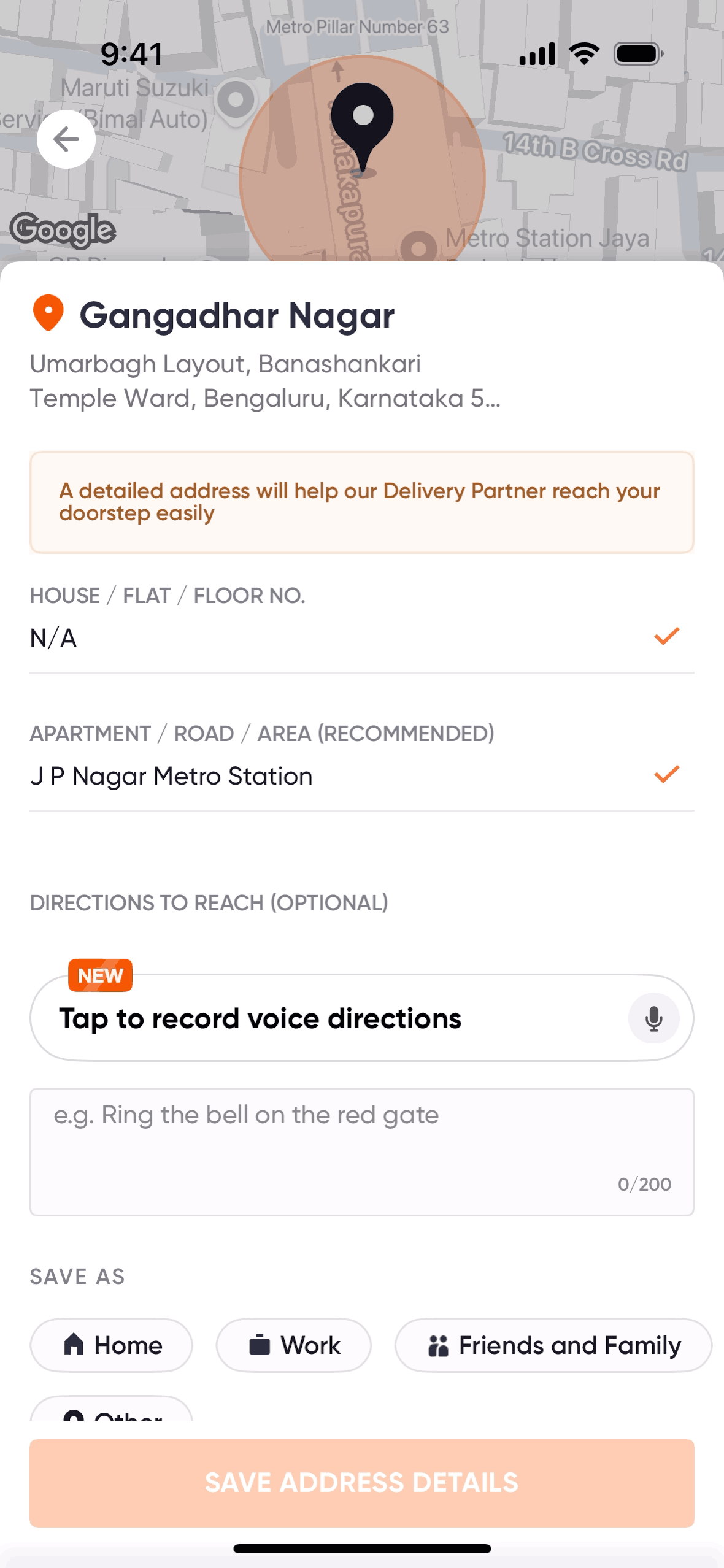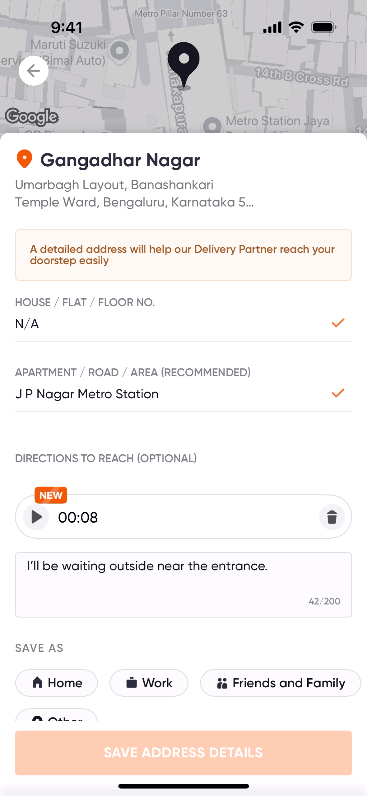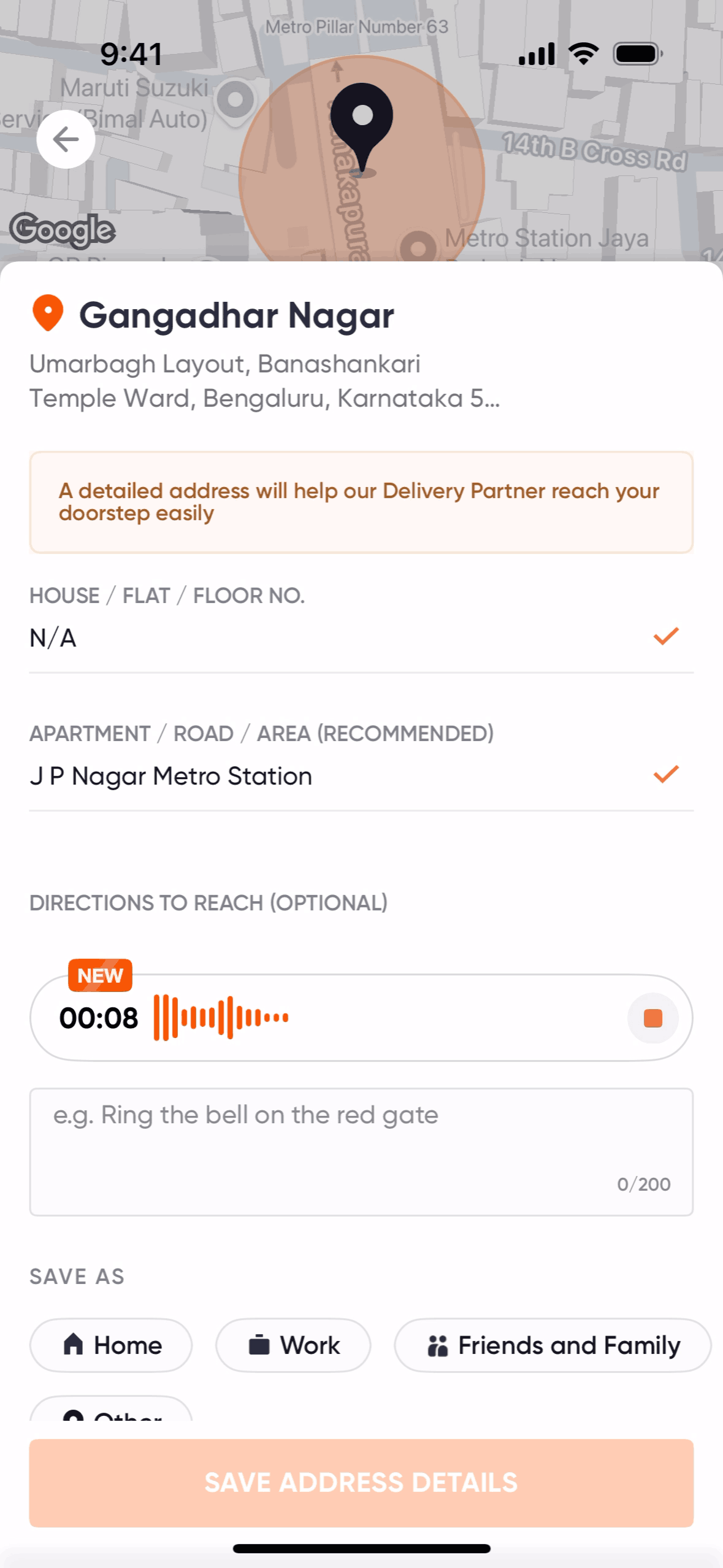 The user flow demonstrates recording voice directions for an address. It involves initiating, recording, and reviewing the voice instructions.