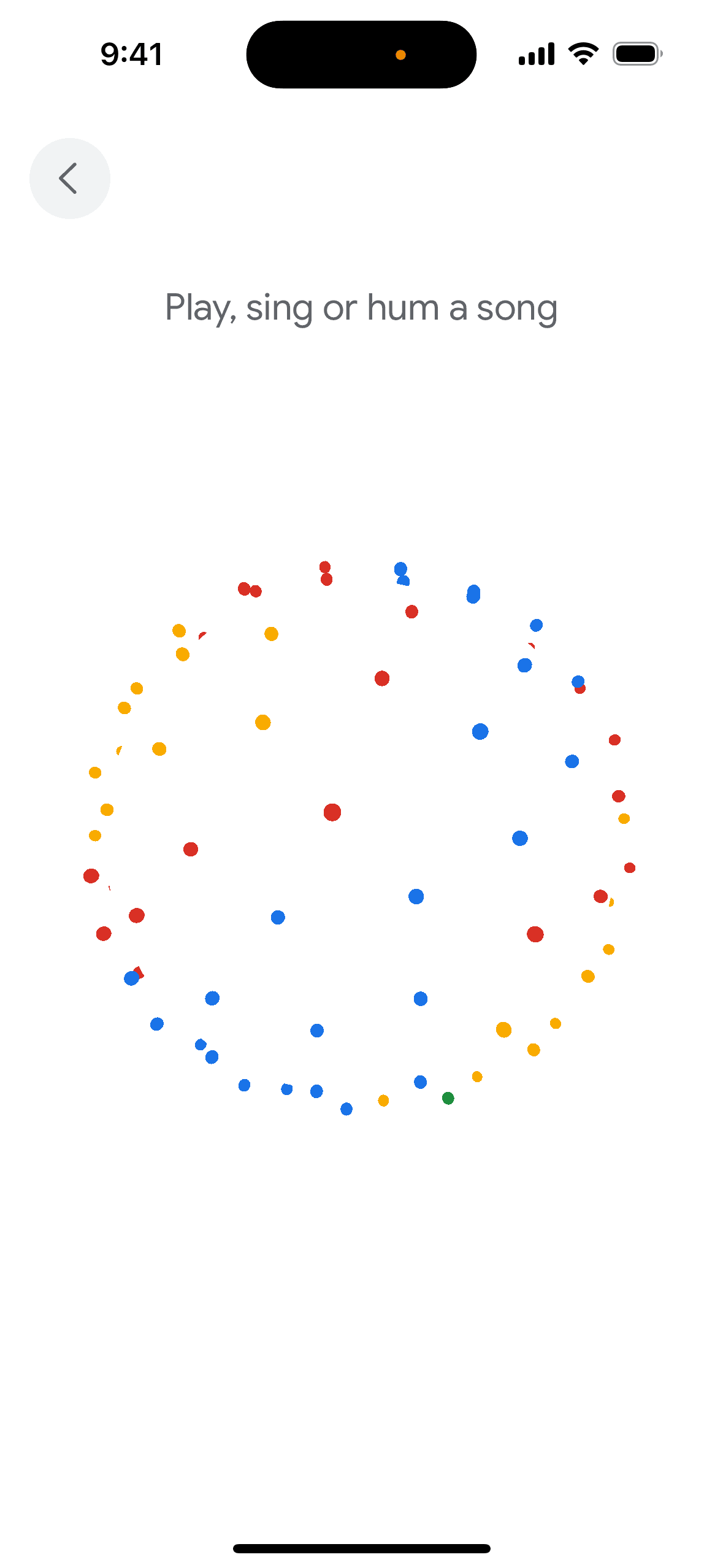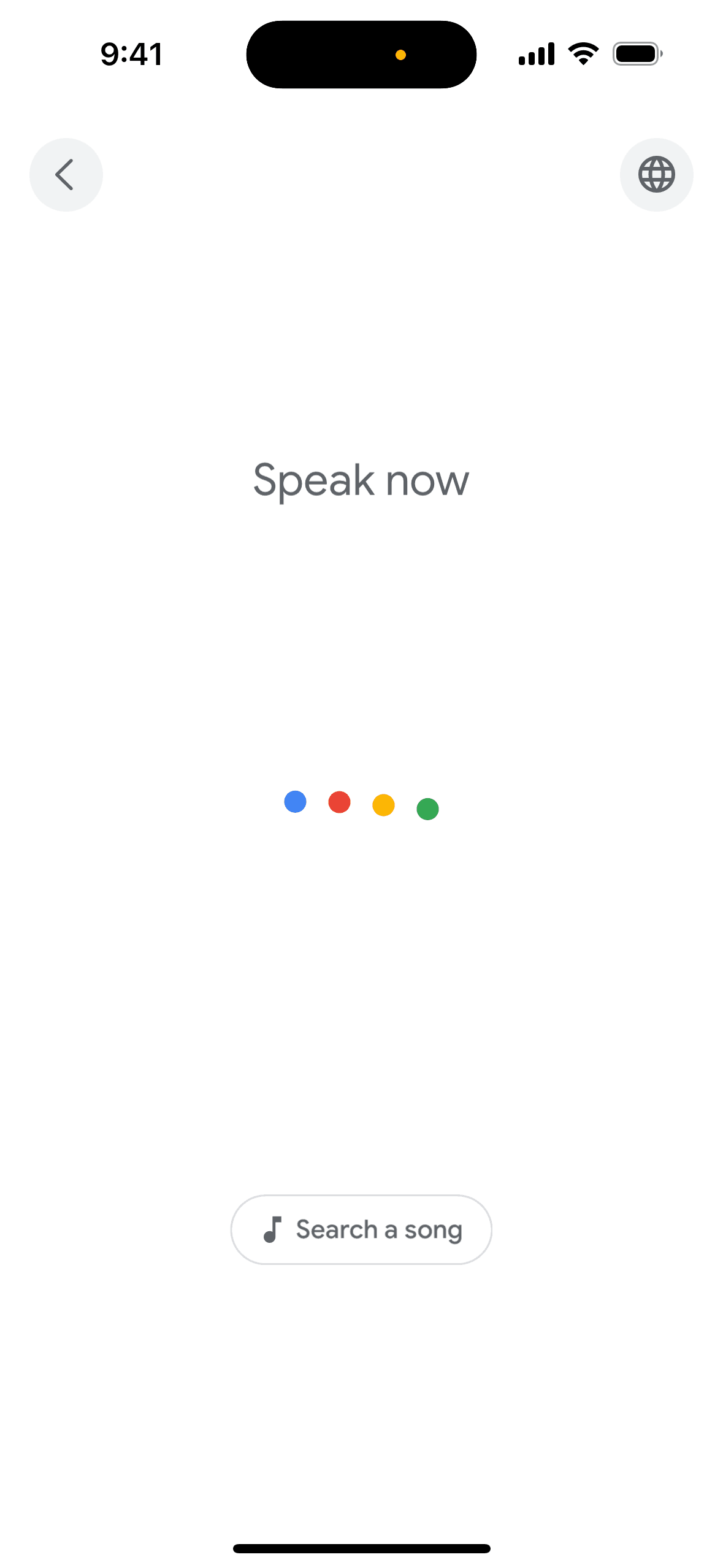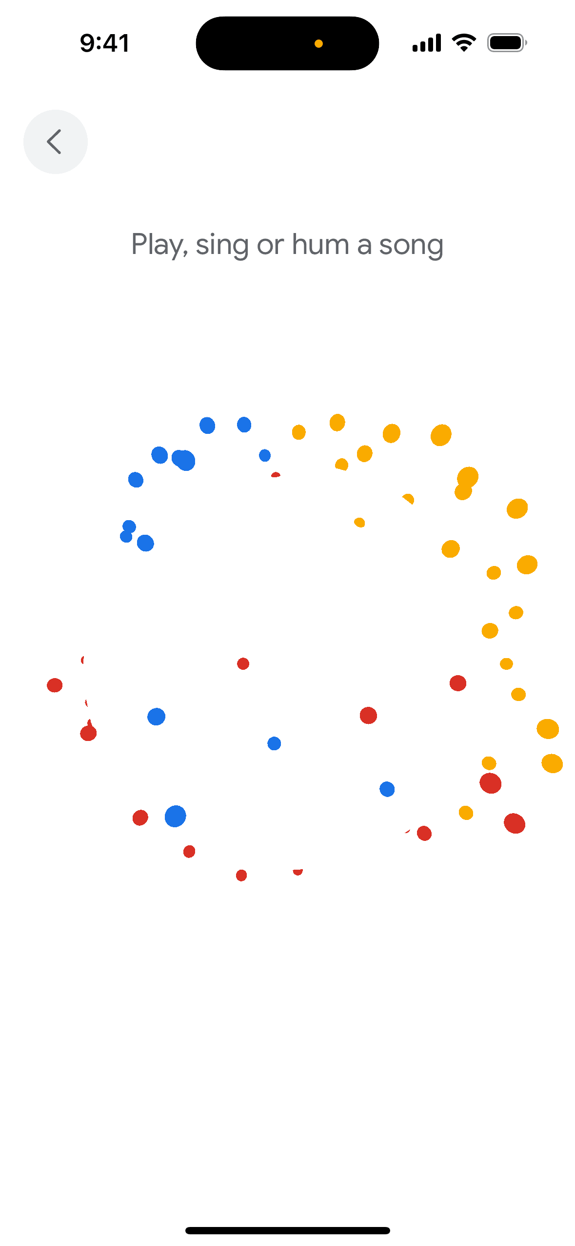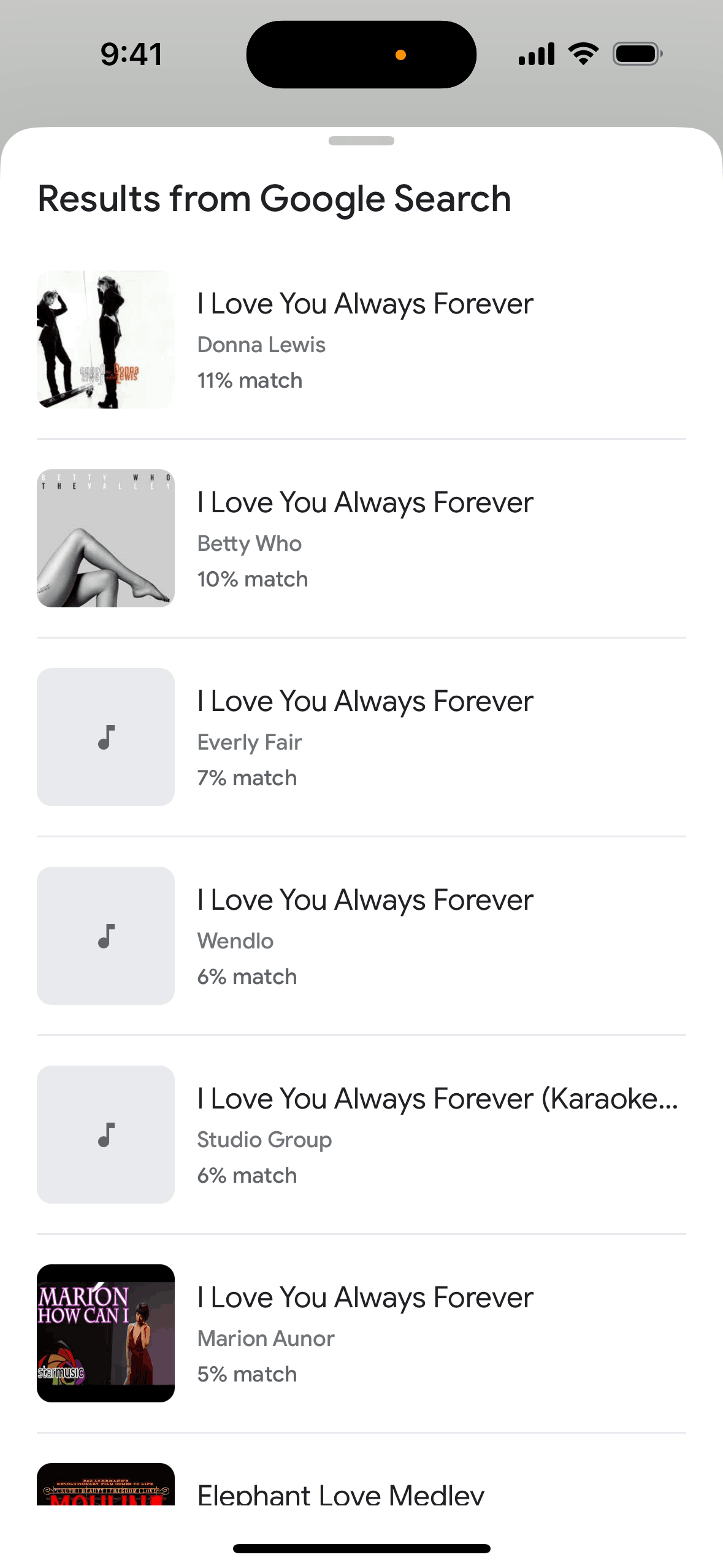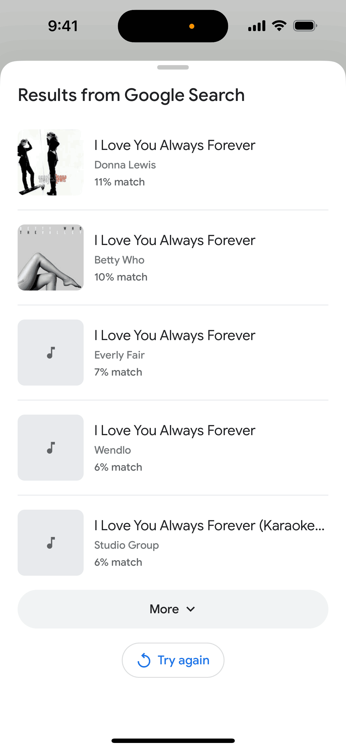 The user initiates a song search, provides audio input, and then views a list of potential song matches. The user can then view more results.
