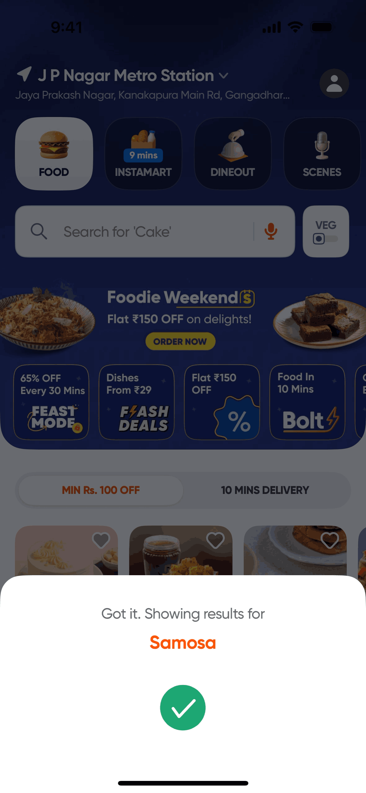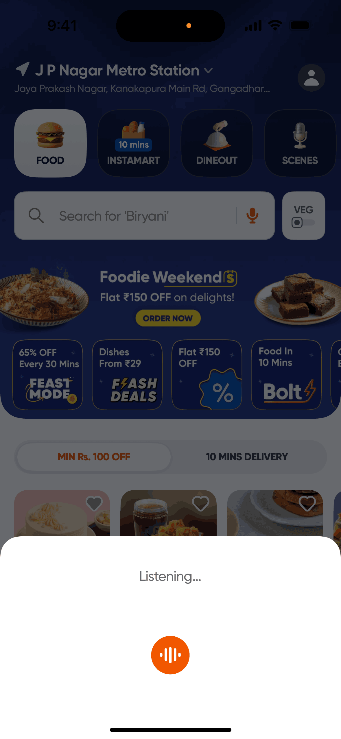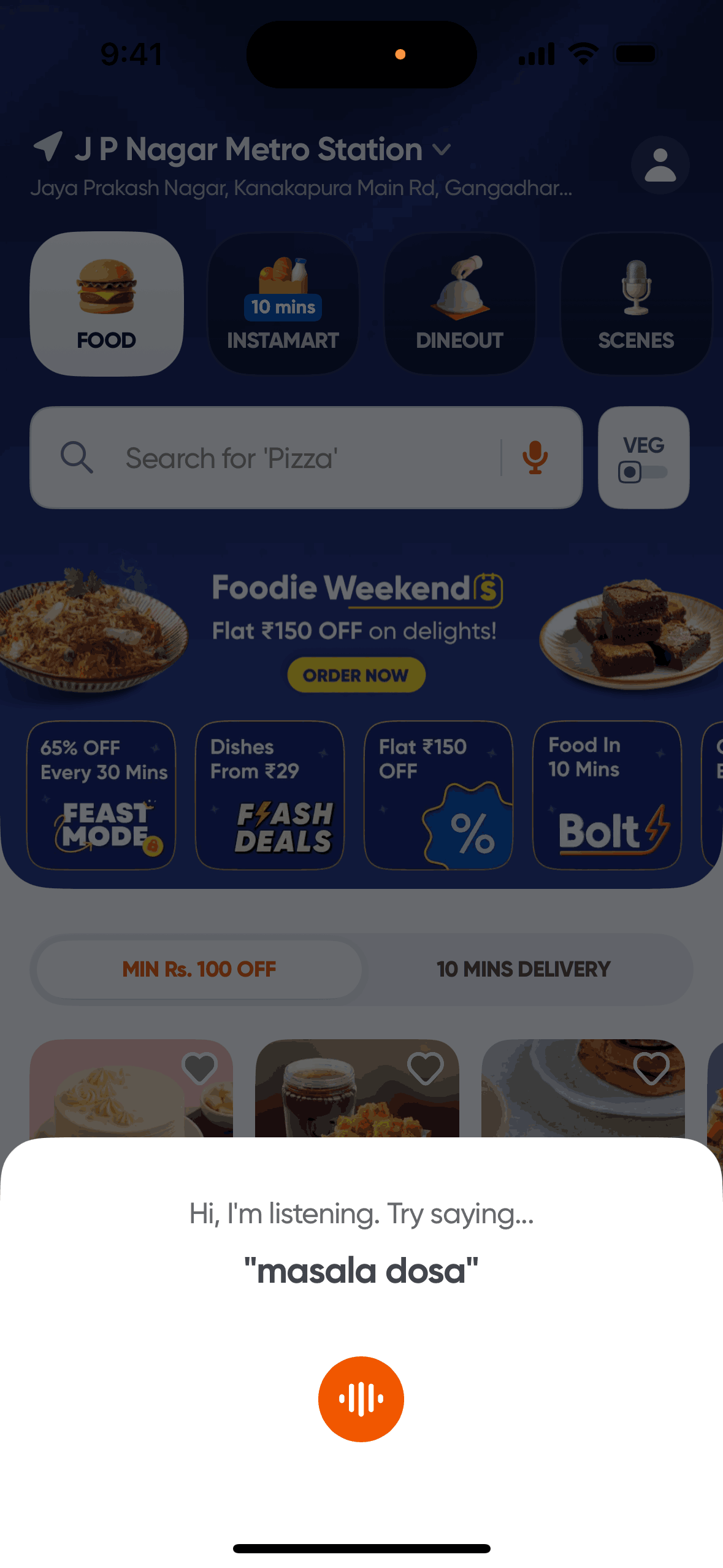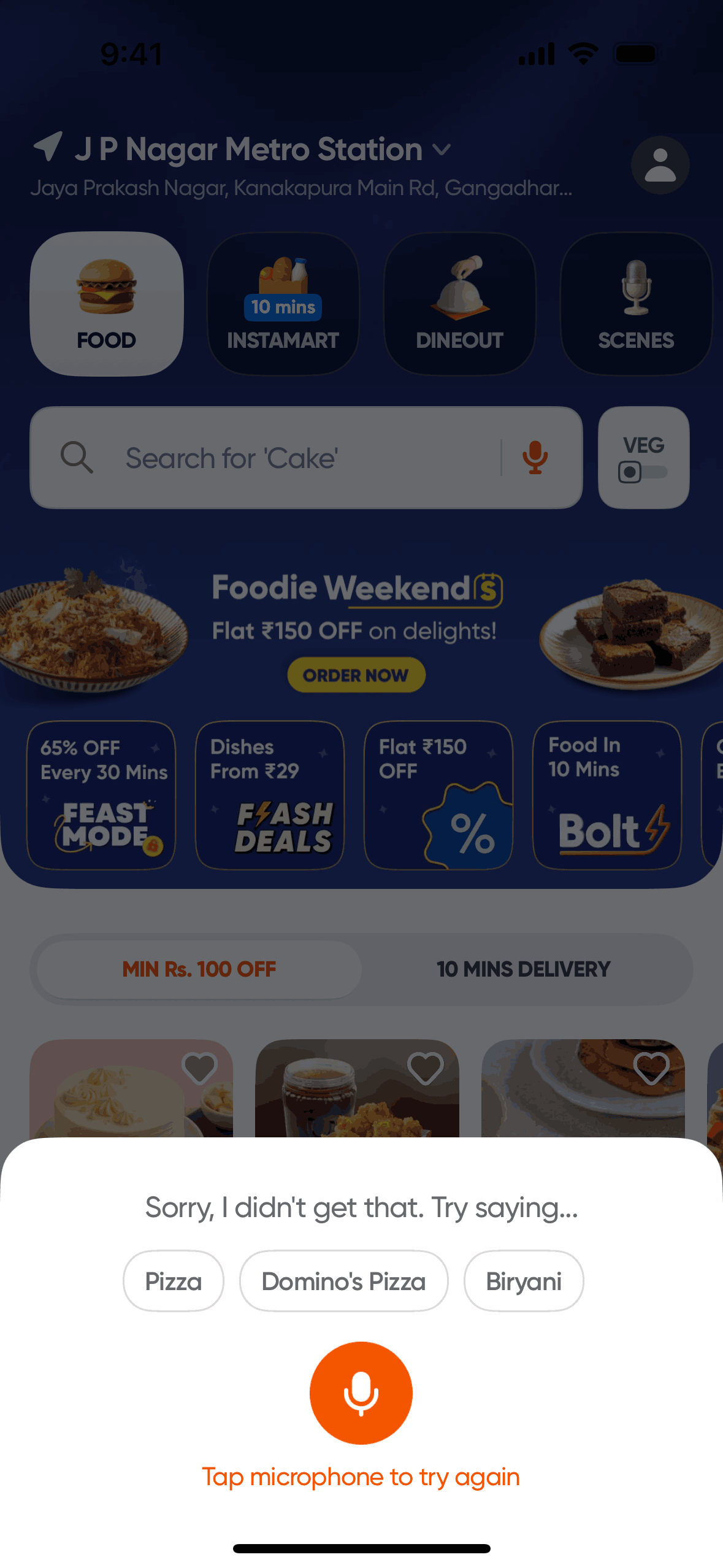 The user initiates a voice search for a dish. After a possible error, the app successfully recognizes the input and displays the corresponding search results.