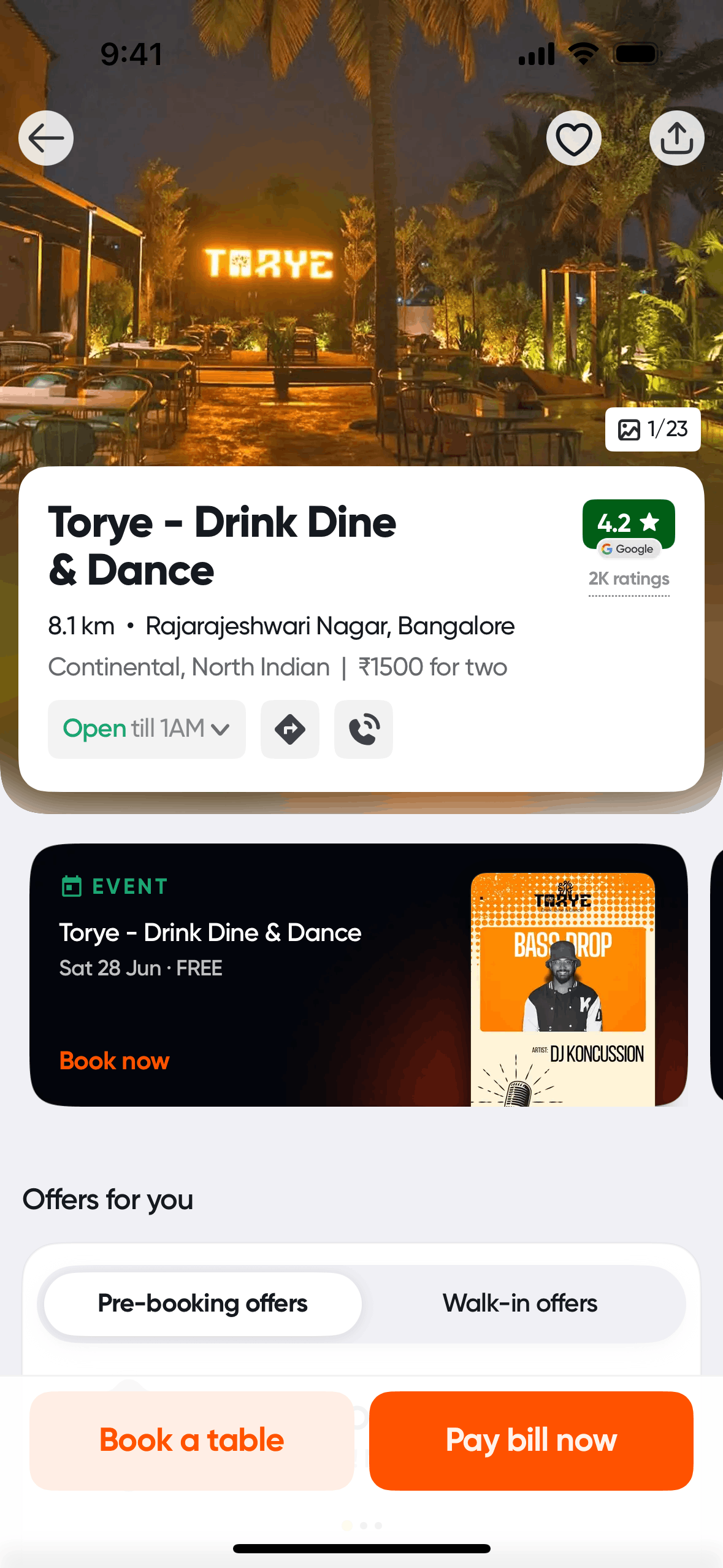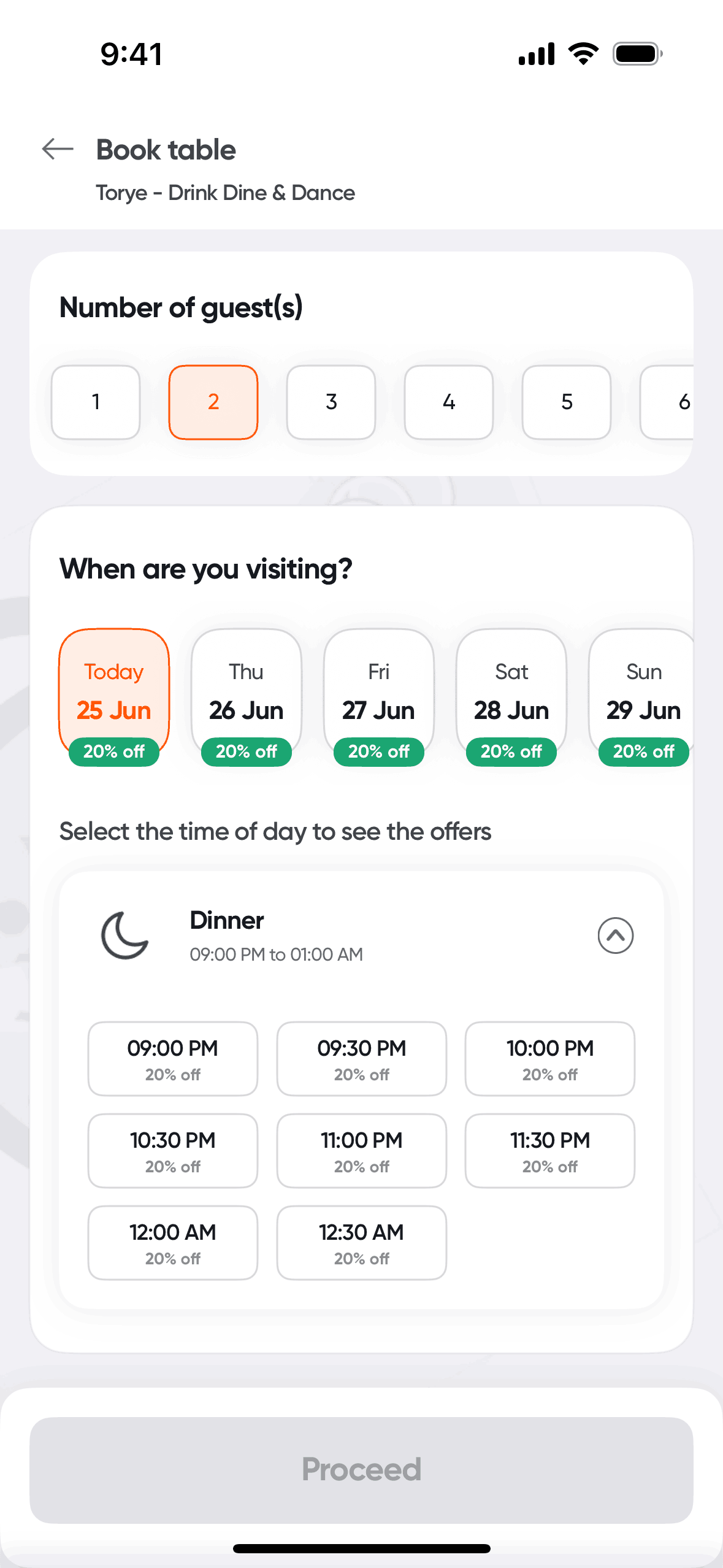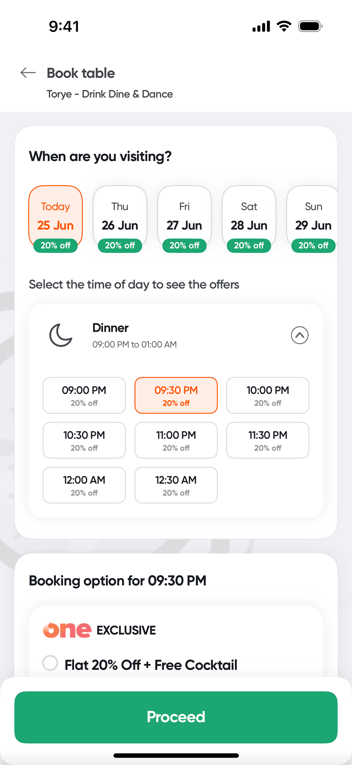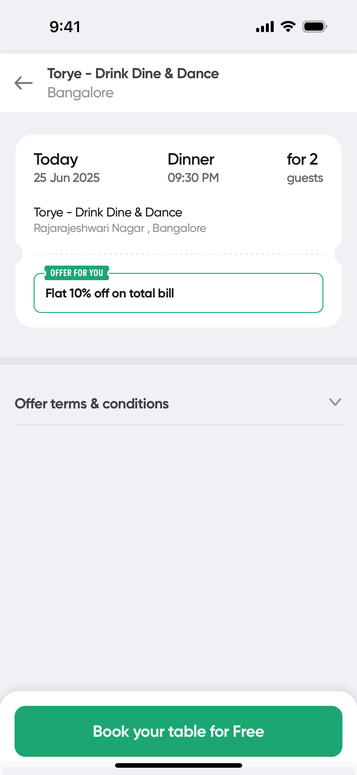 The user flow showcases booking a table at a restaurant. It involves selecting booking details, choosing an offer, and confirming the reservation.