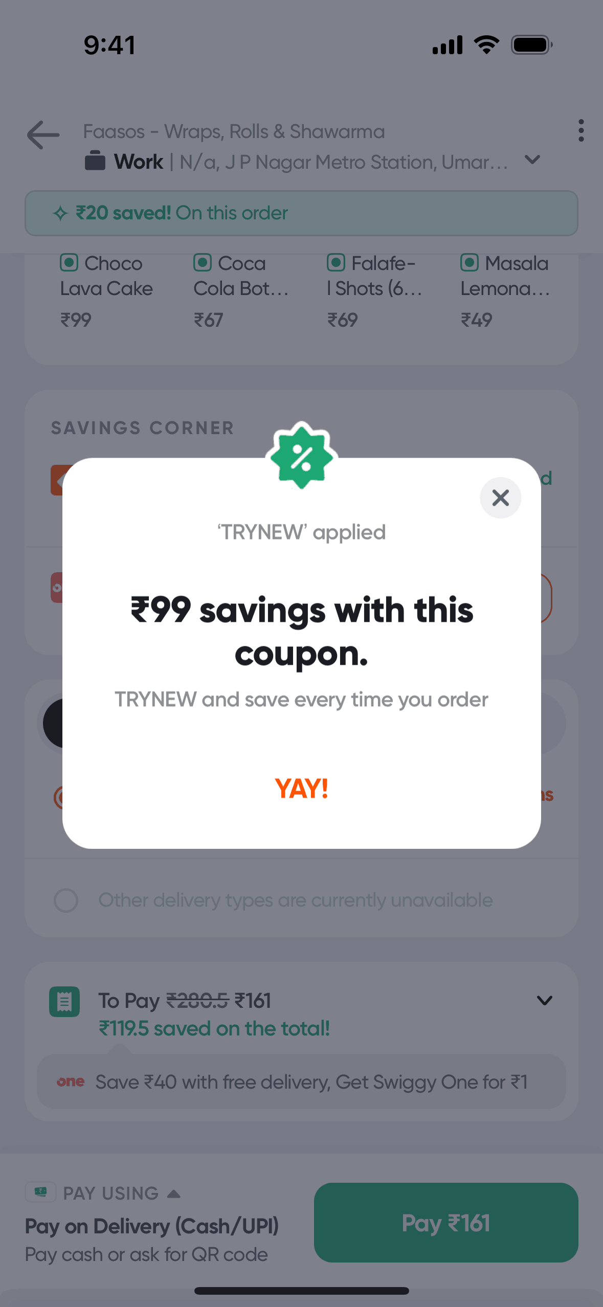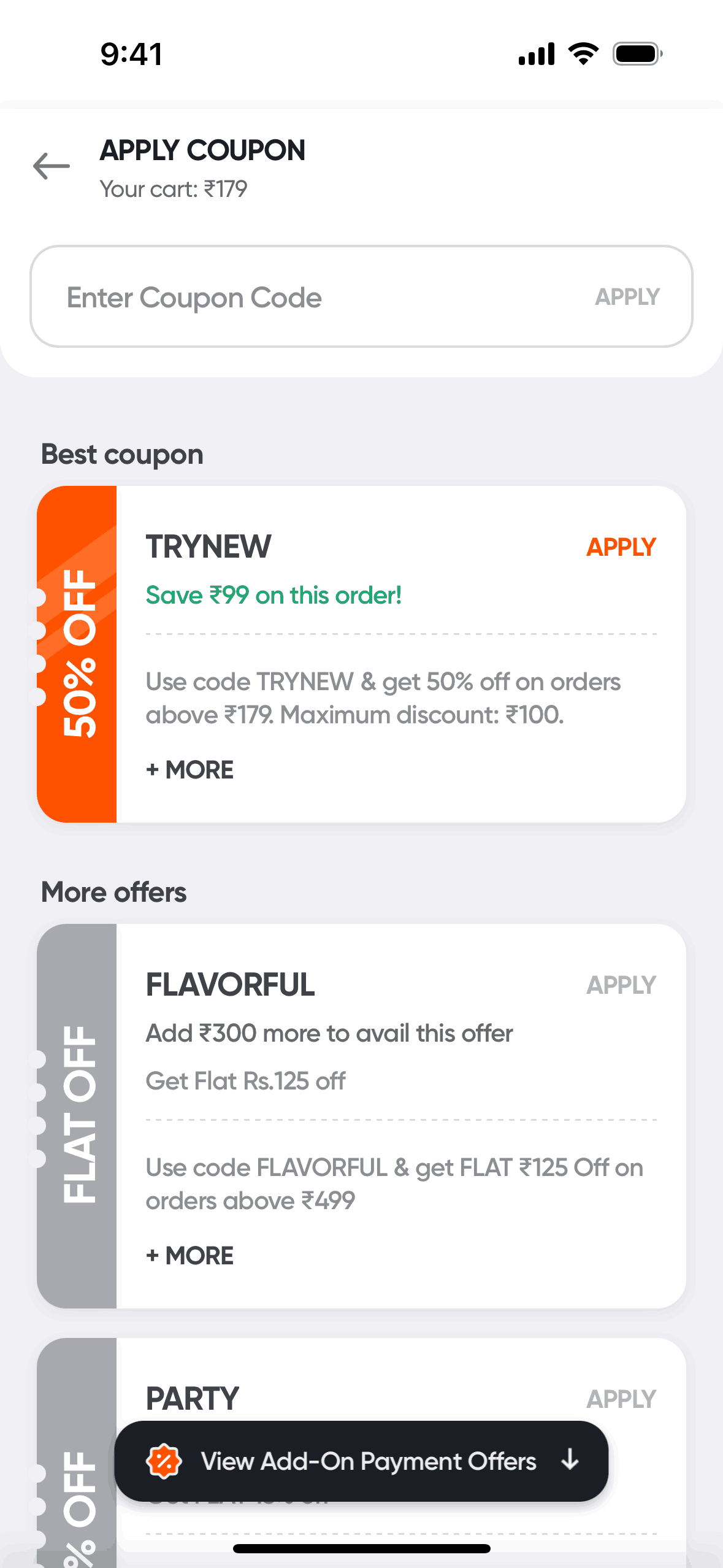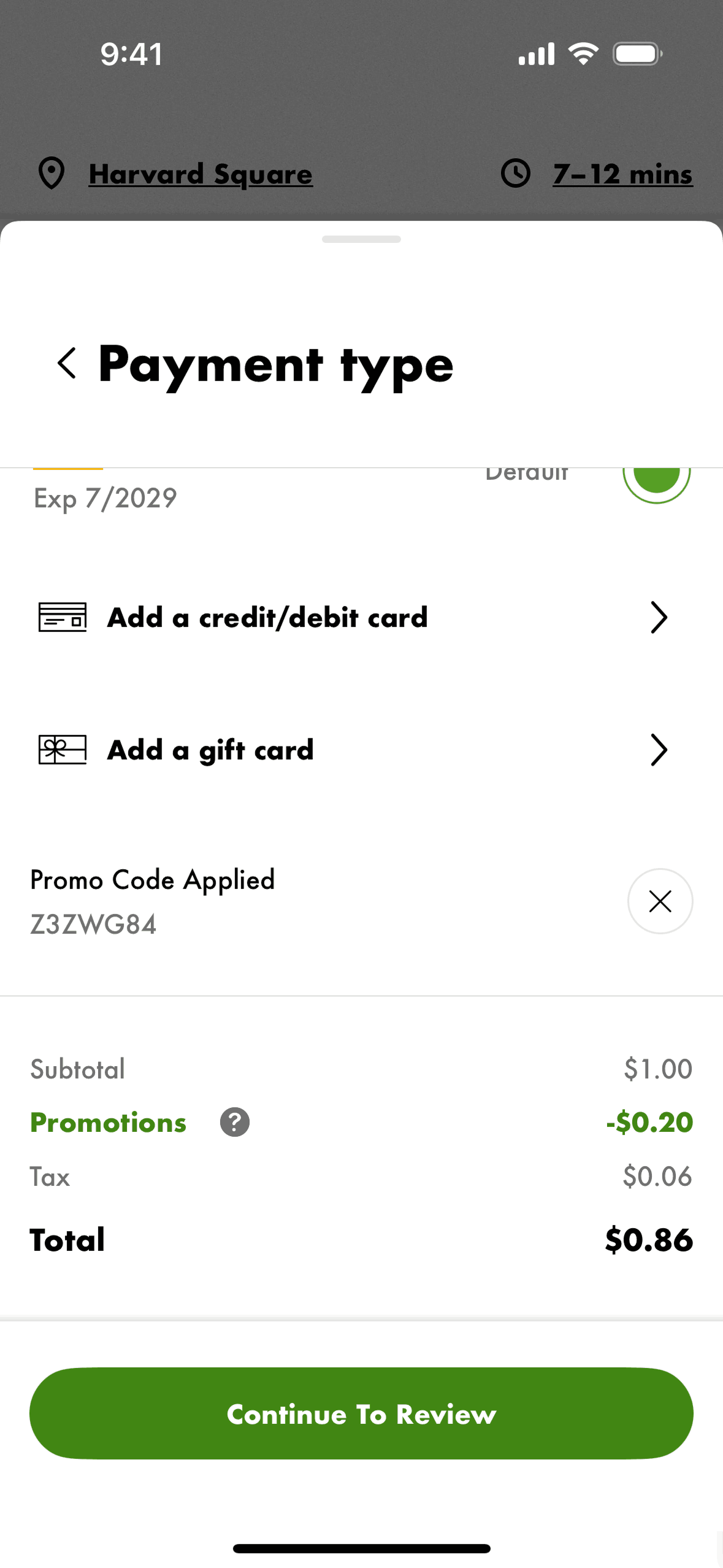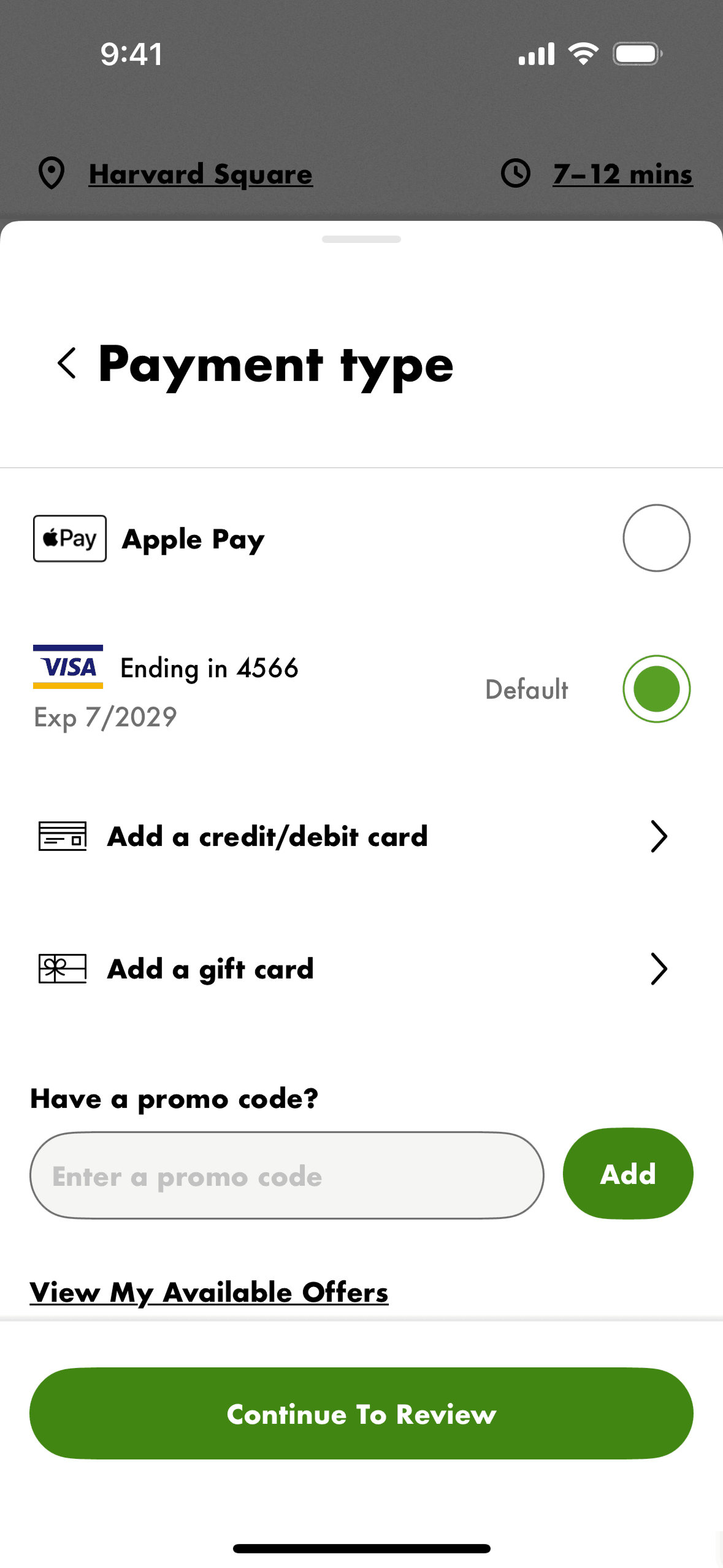 The user flow demonstrates how a user can apply a promo code to their order. The user selects a promo and the discount is reflected in the payment summary.