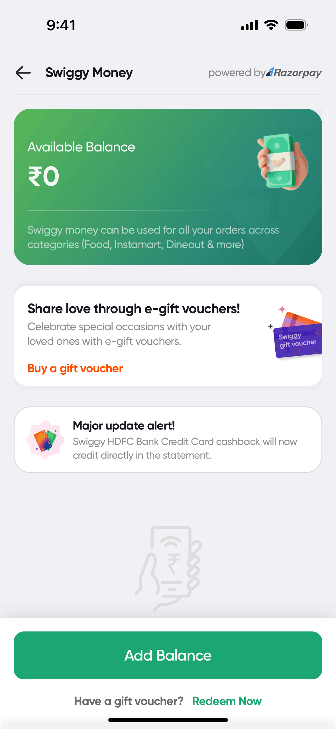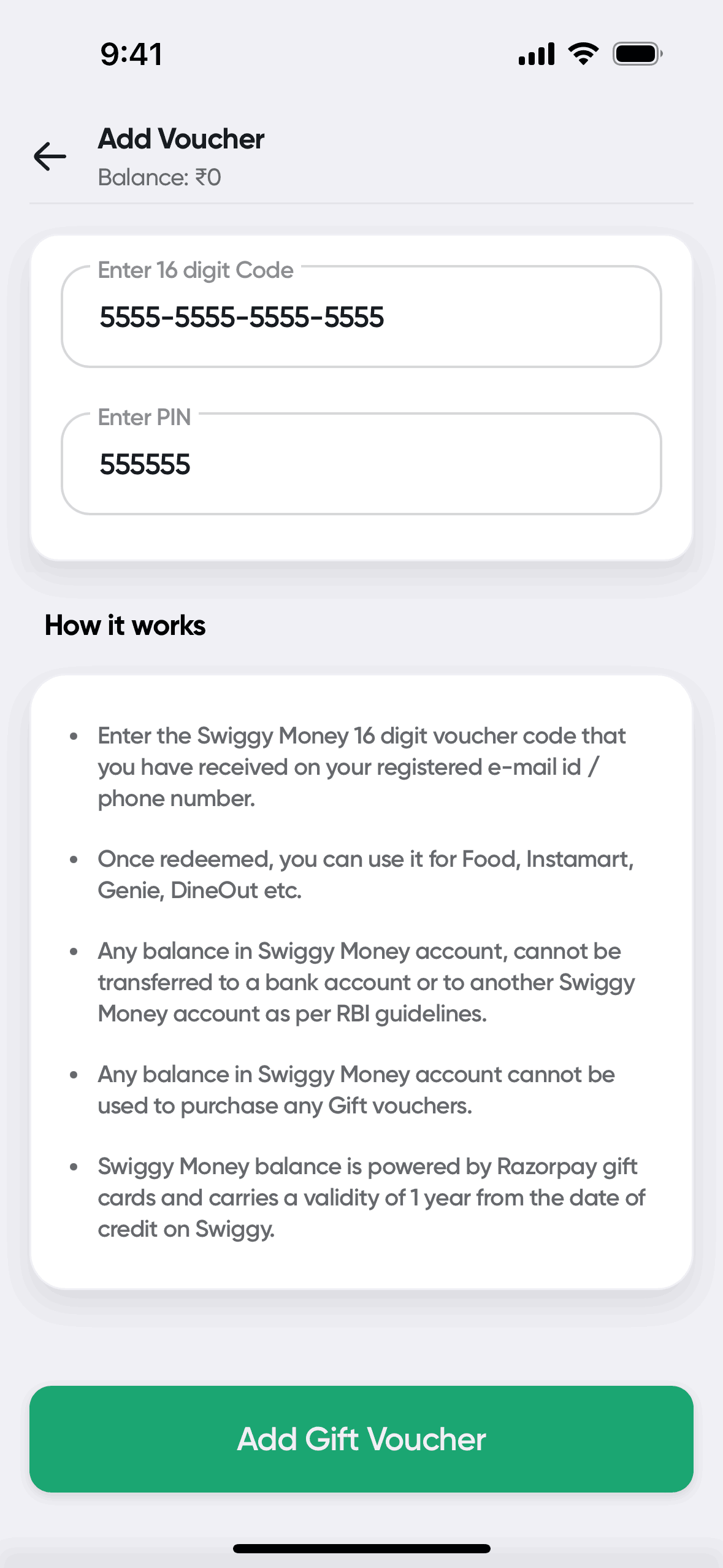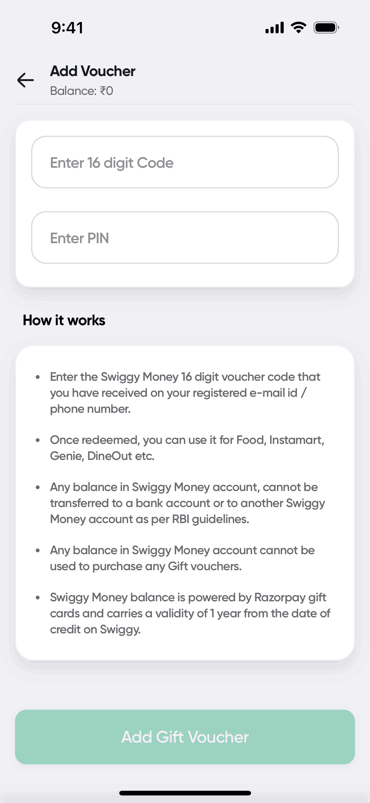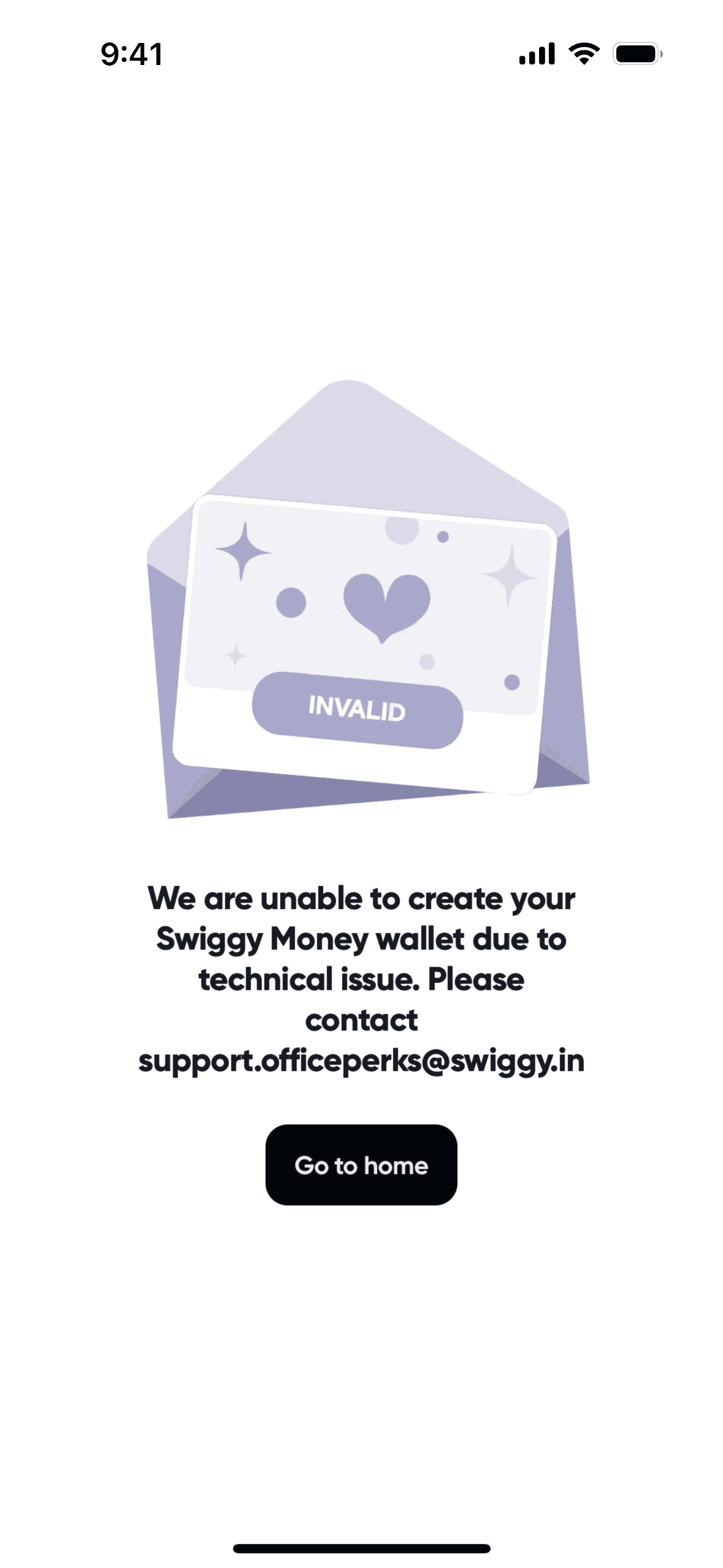 The user attempts to redeem a Swiggy gift voucher, but the process fails due to a technical issue with wallet creation.