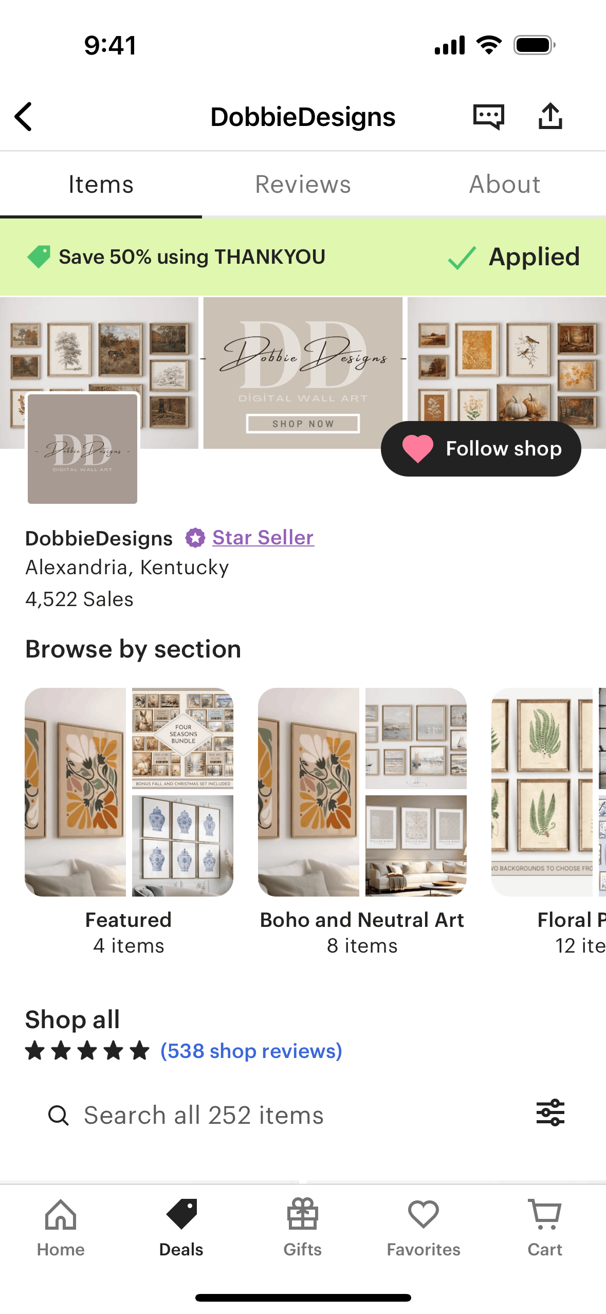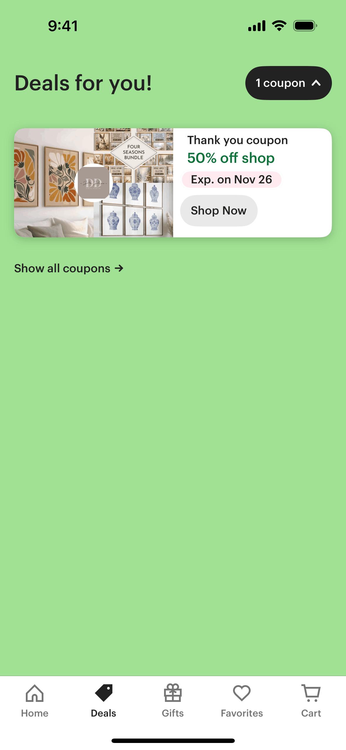 The user flow demonstrates claiming a coupon. It starts from a deals page, proceeds to coupon details, and ends with the coupon applied on the shop page.