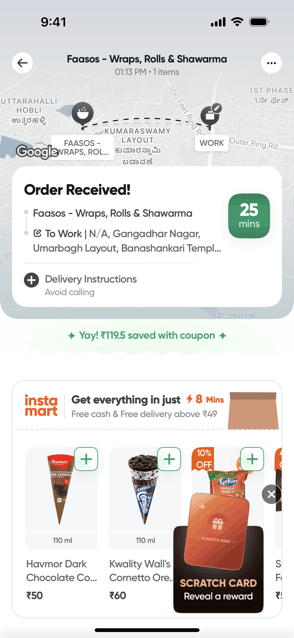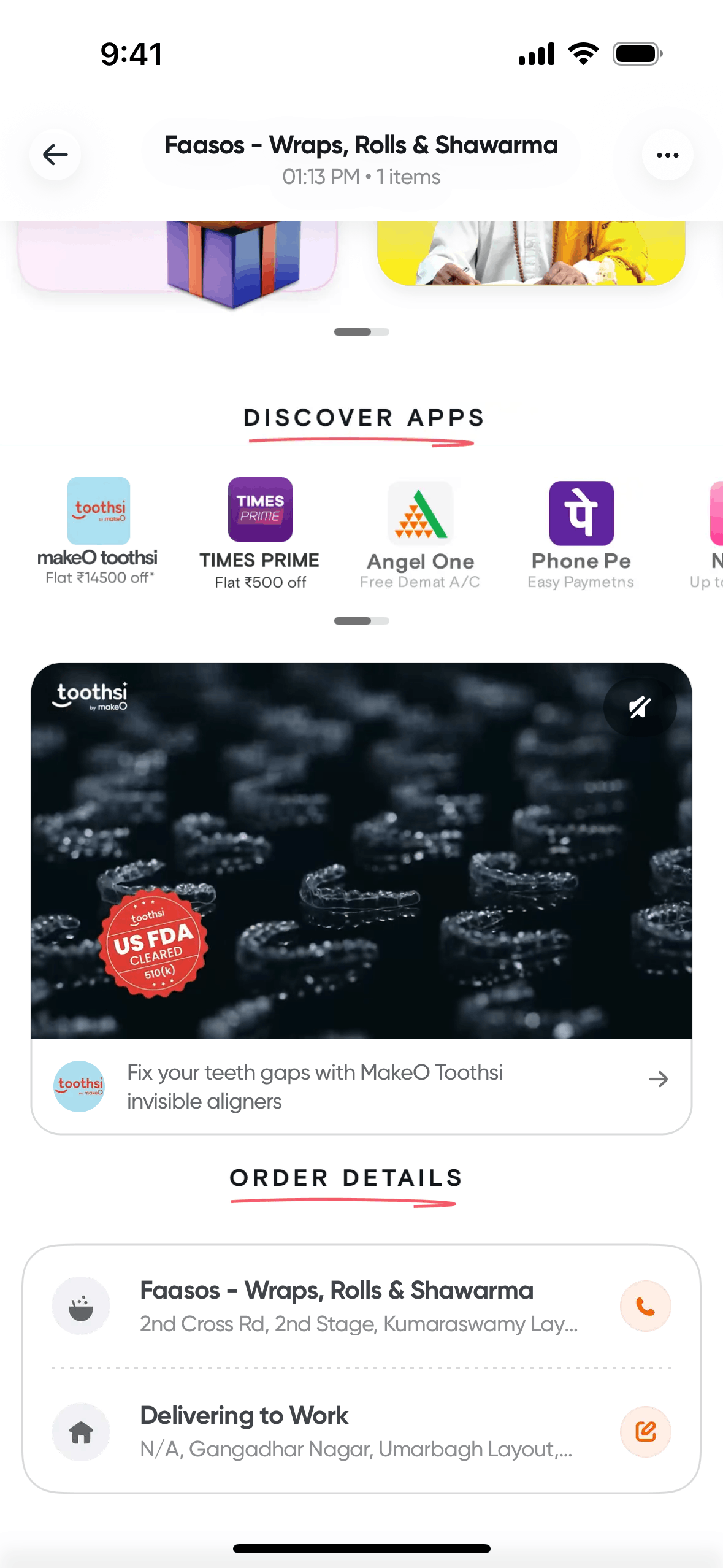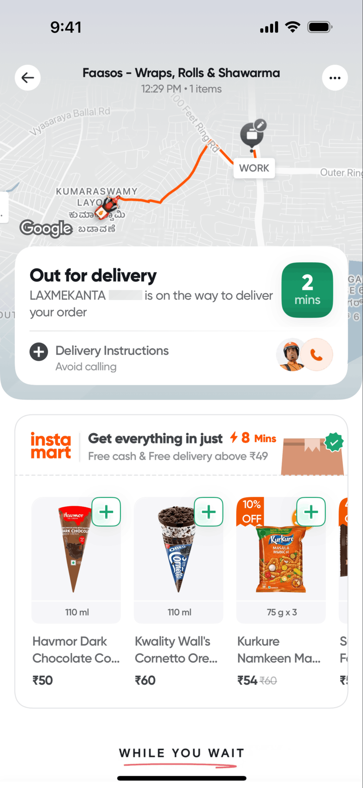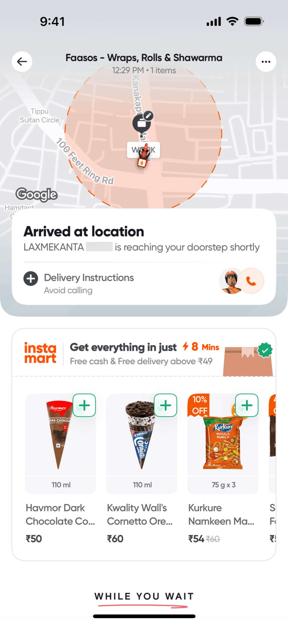 The user flow demonstrates placing an order, tracking its delivery, and handling payment scenarios. It concludes with post-delivery advertisements and order information.
