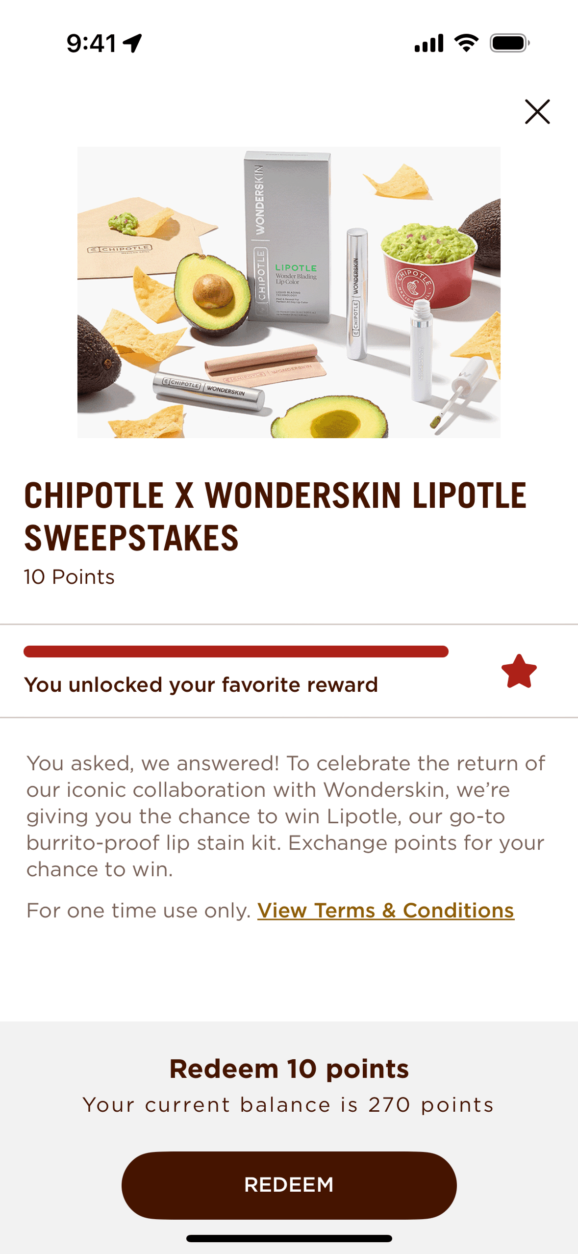 The user views available rewards, selects a sweepstake, and redeems points to enter. A confirmation message then appears.
