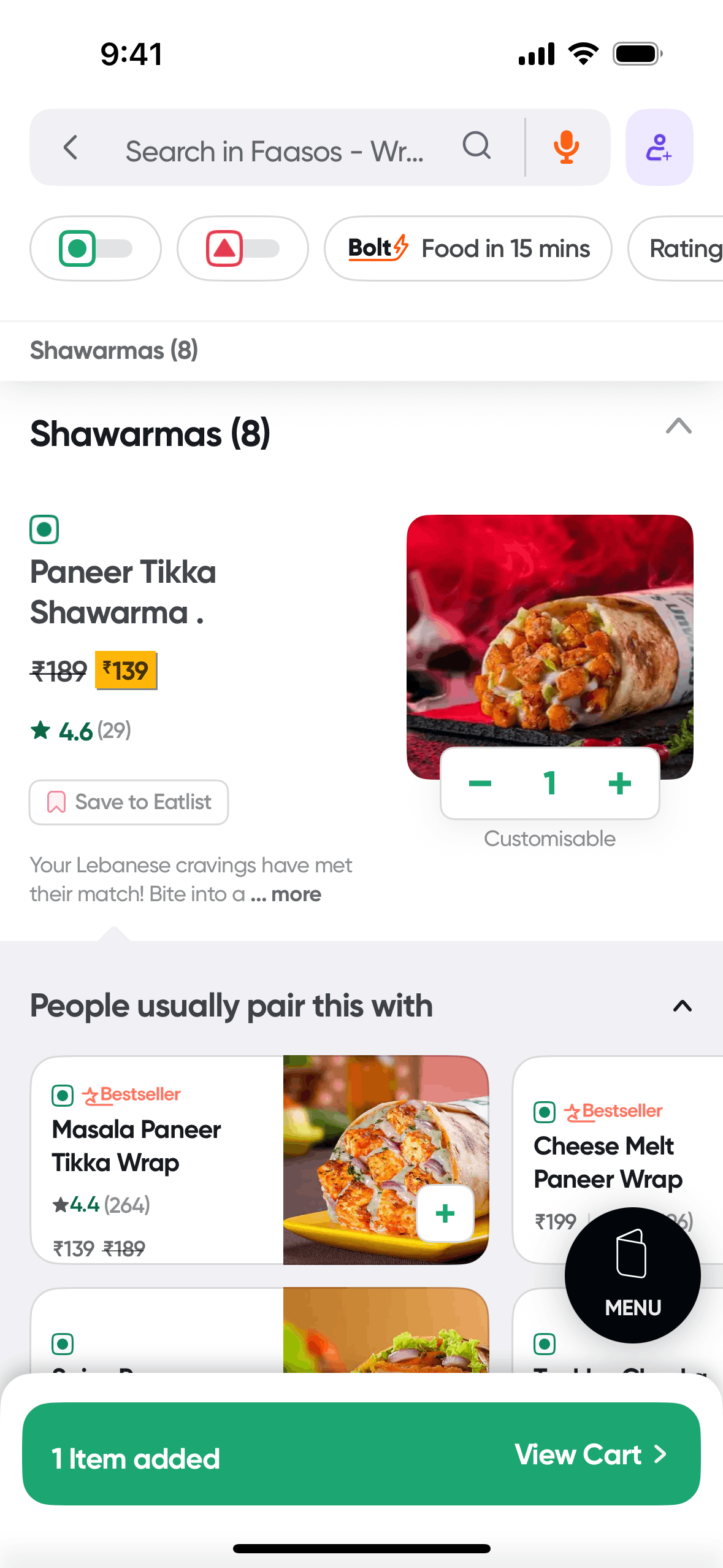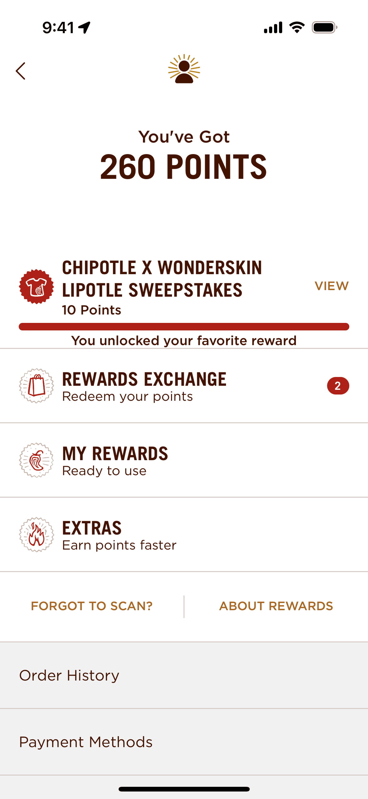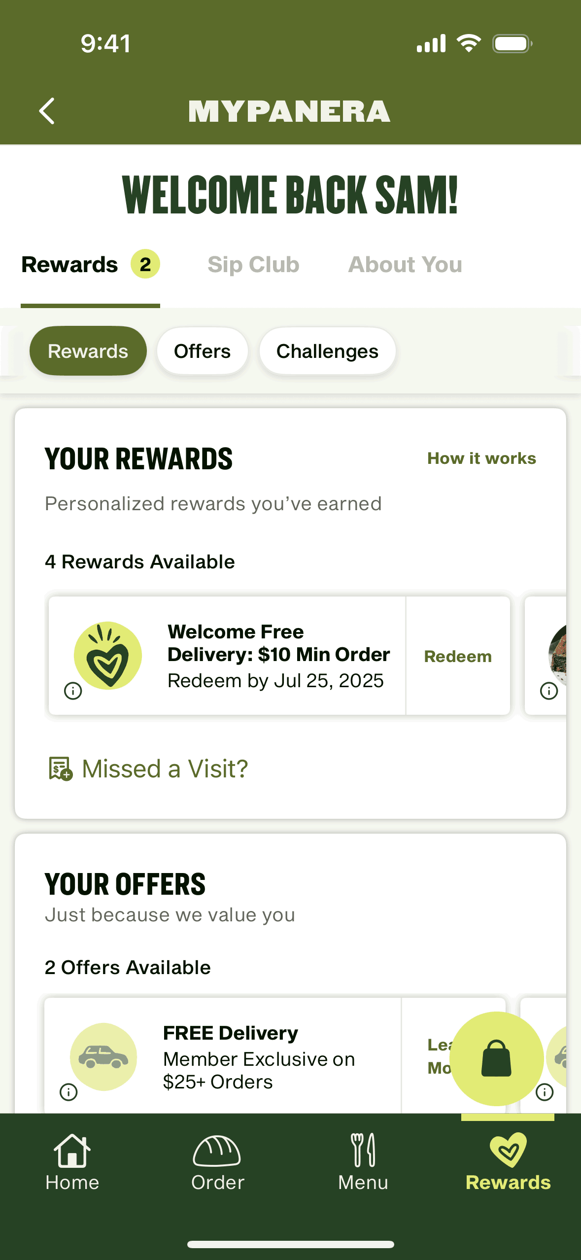 The user views available rewards and selects one to redeem. They are then directed to the menu to add qualifying items to their cart.
