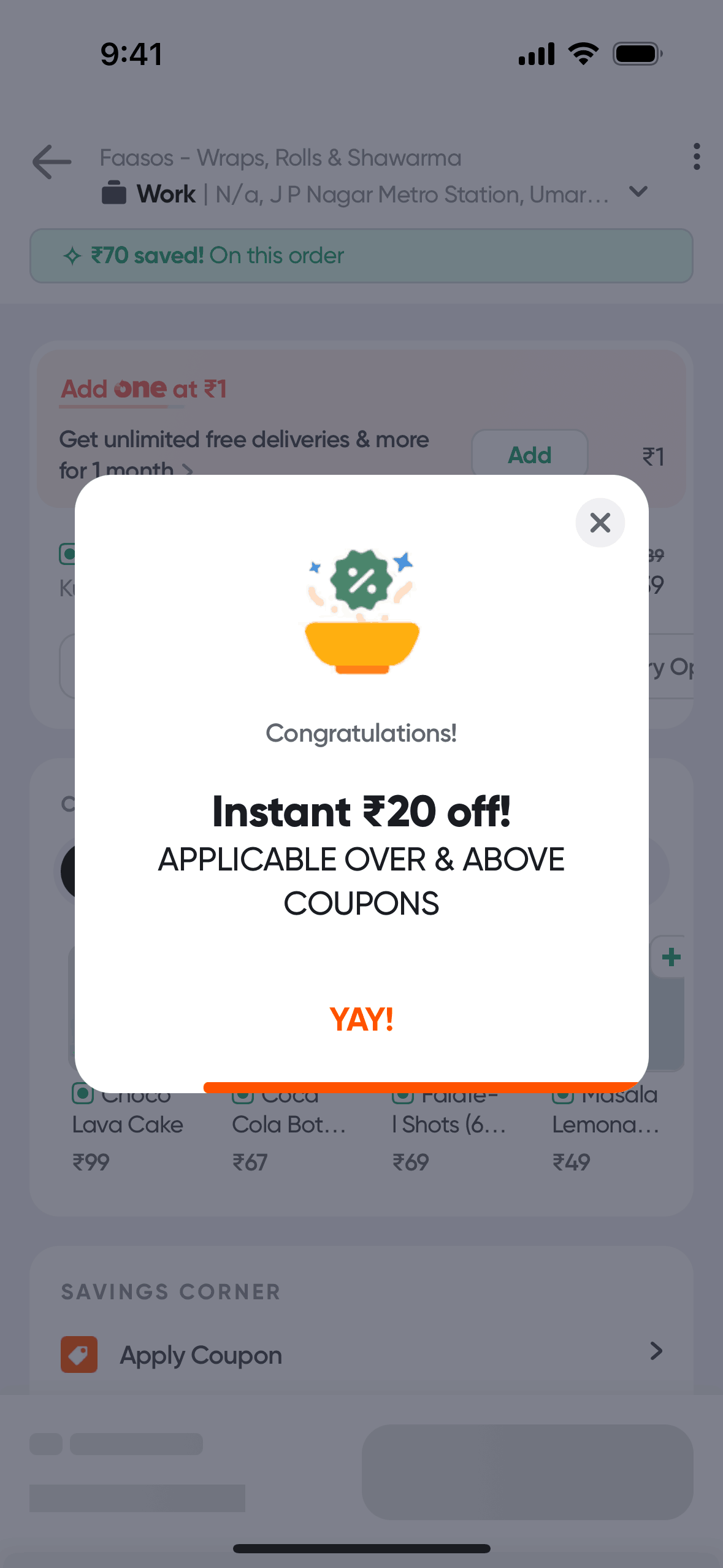 The user flow demonstrates applying a coupon code to an order. It shows the process of selecting a coupon and viewing the updated order total.