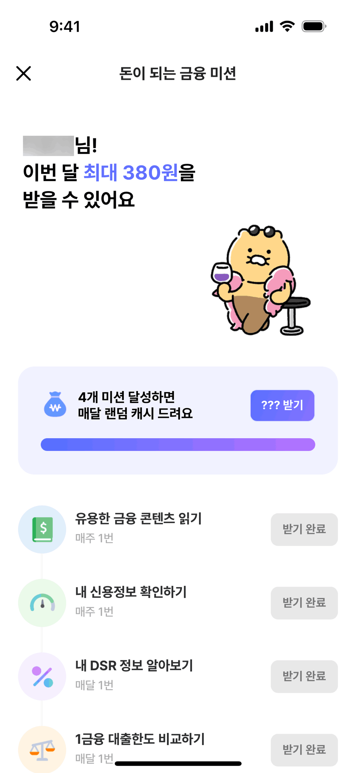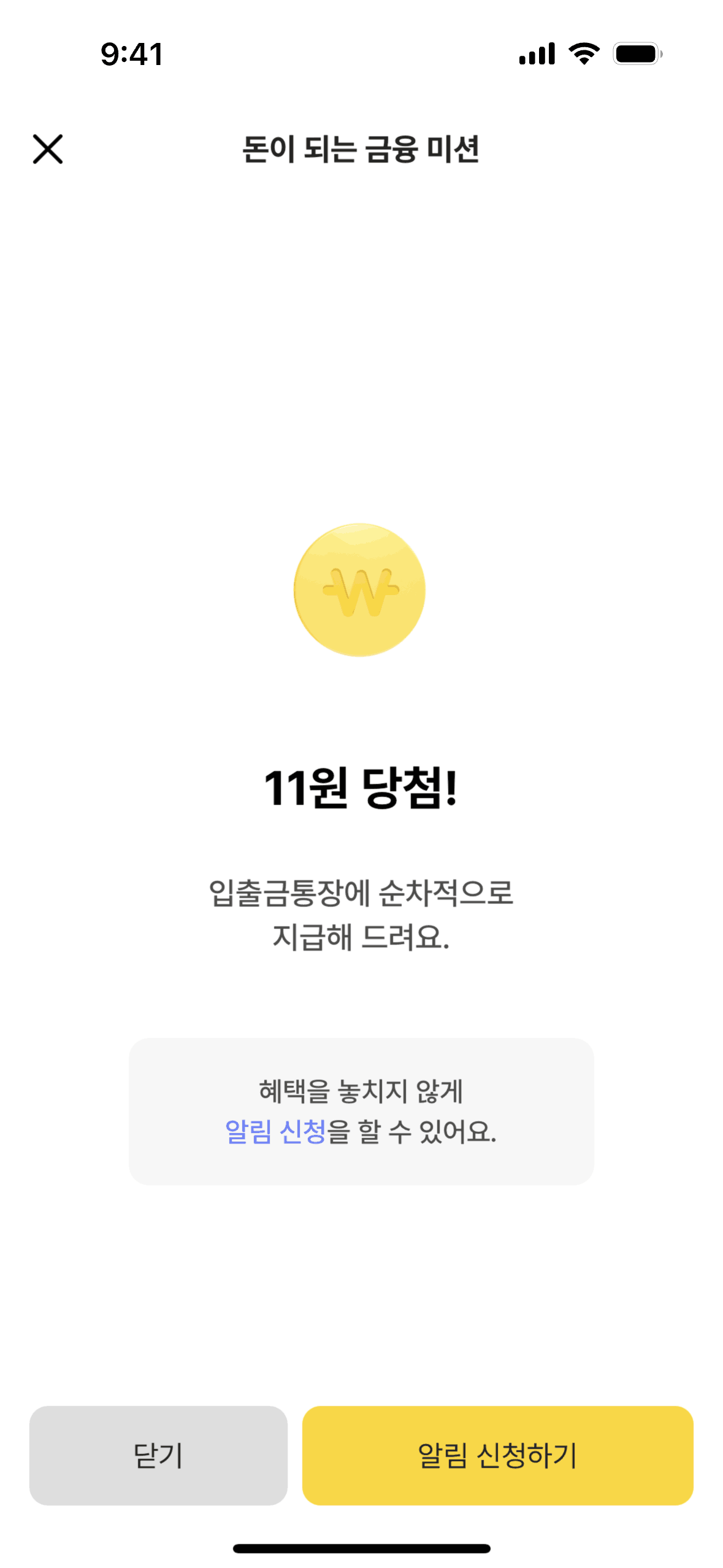 The user views available financial missions, claims a reward, and sees a confirmation screen. They can then close or enable notifications.
