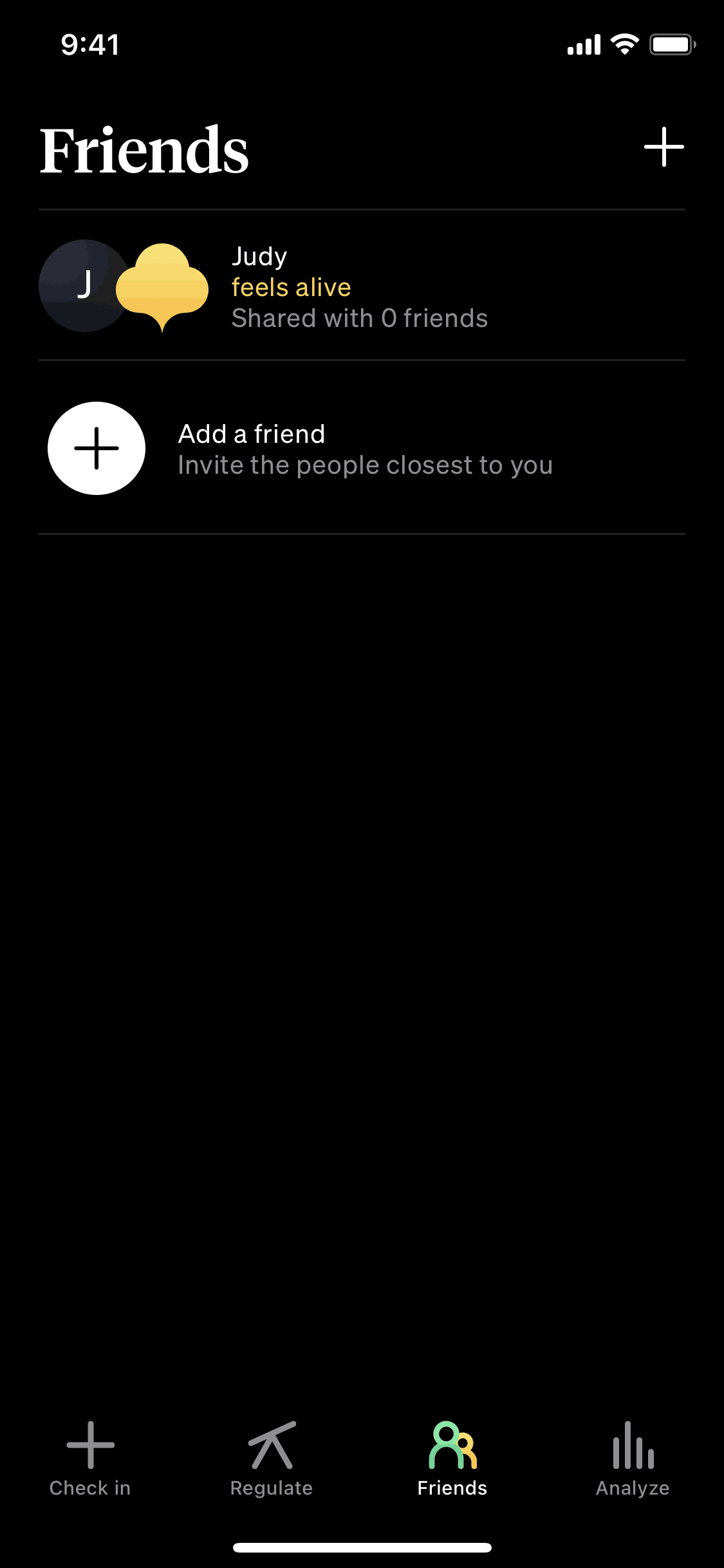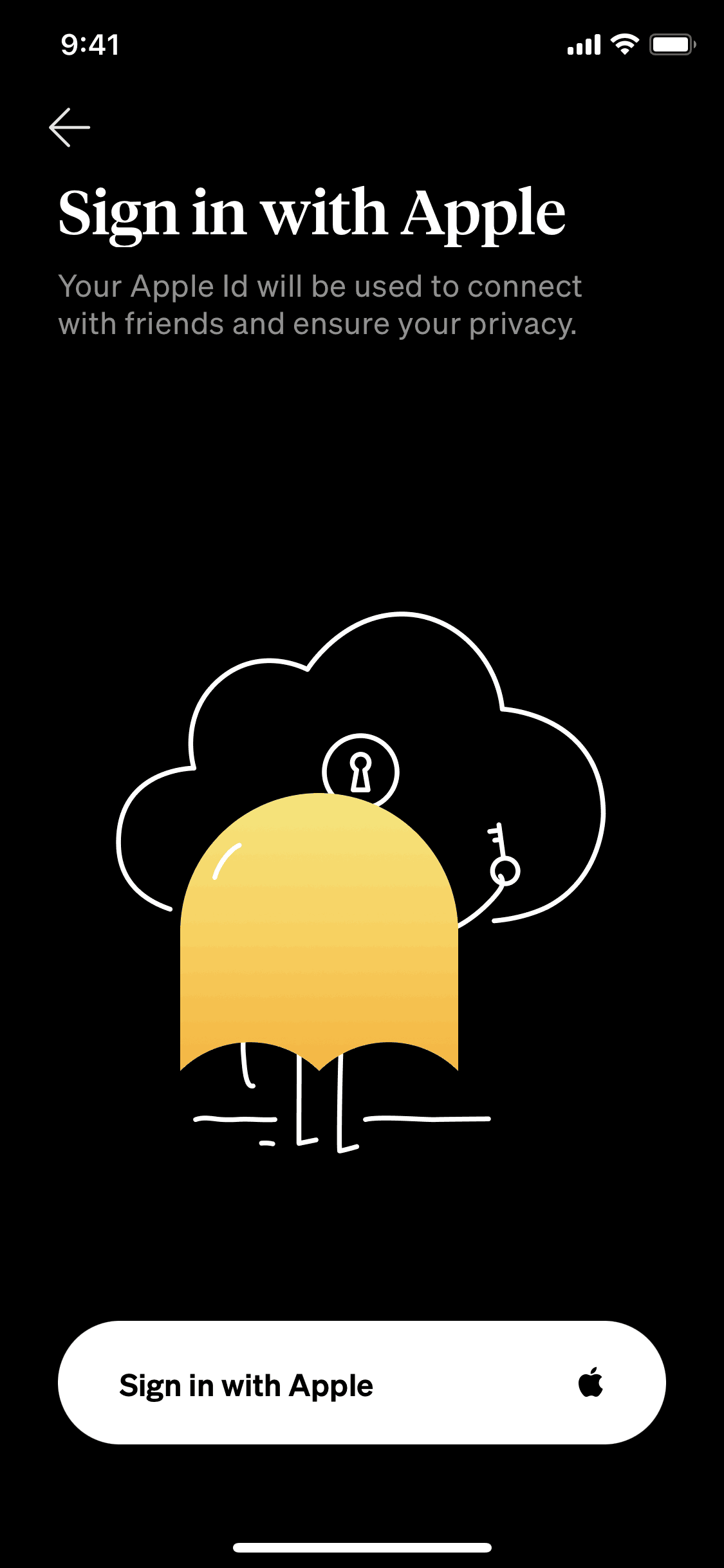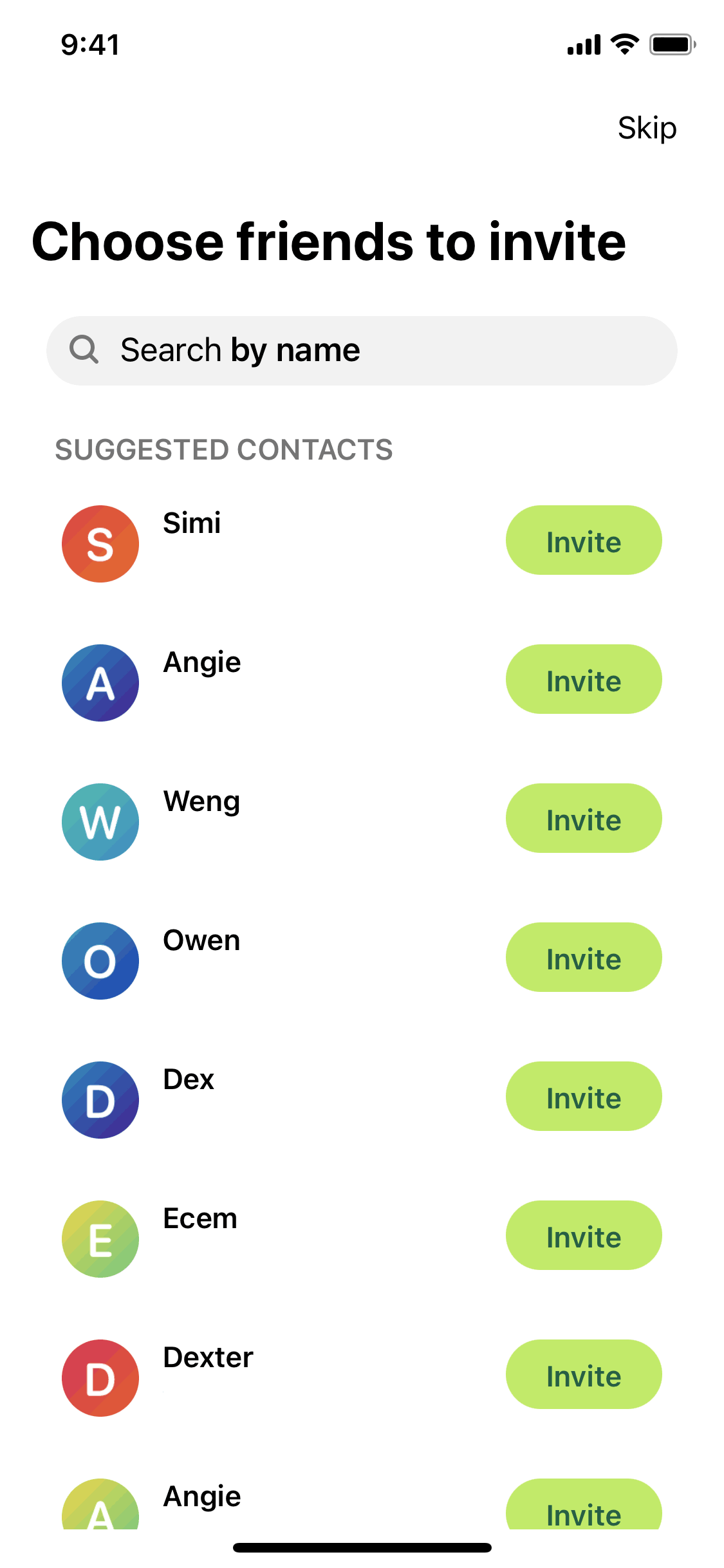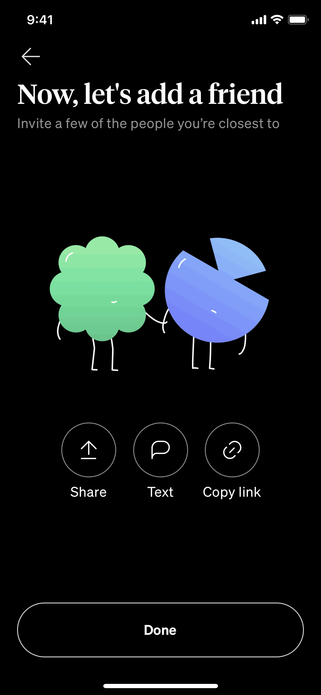 The user signs in with Apple, enters their name, and is then prompted to add friends. They can invite friends via a share sheet.