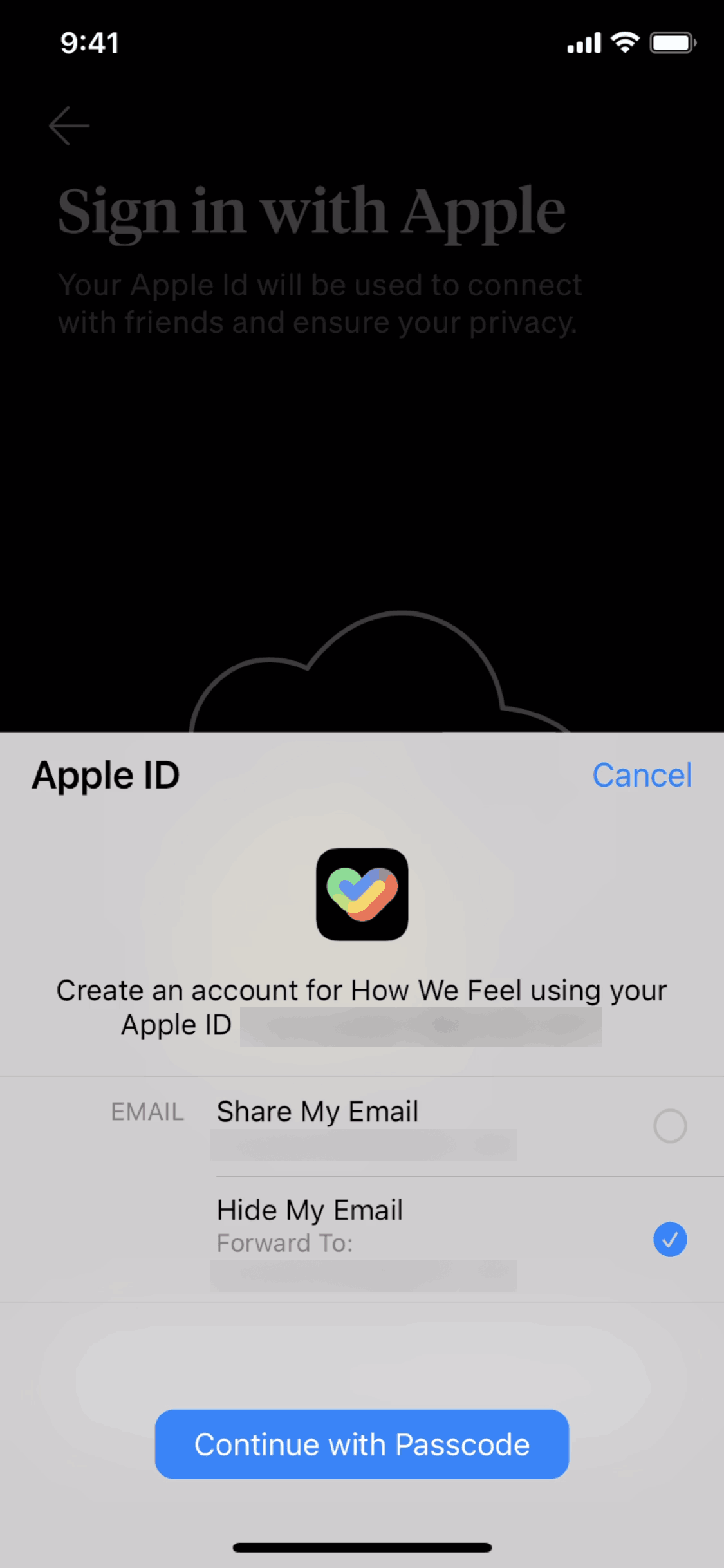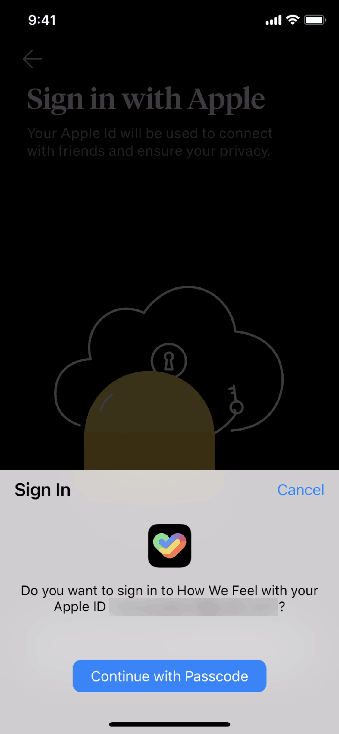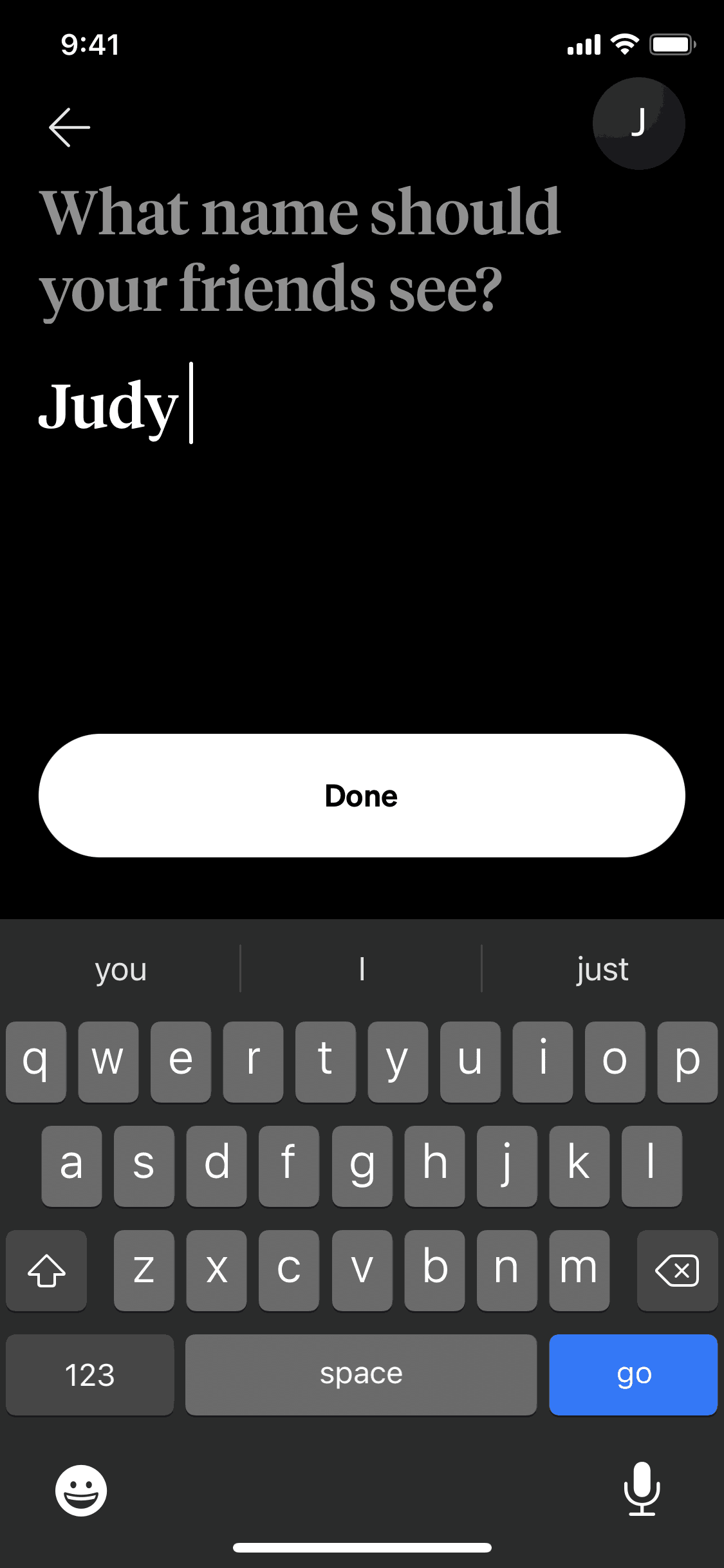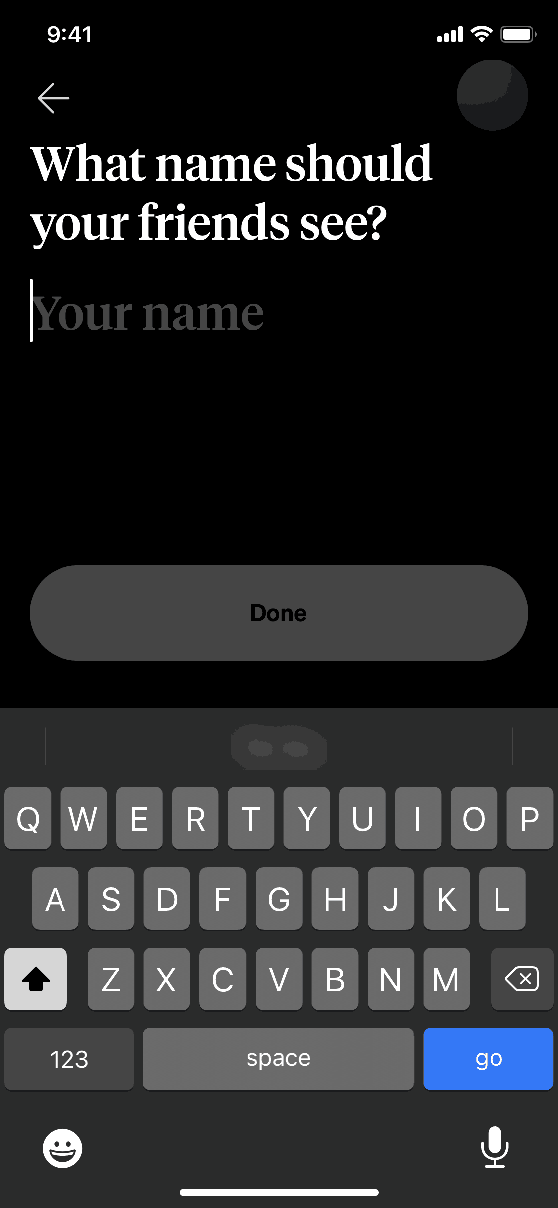 The user signs in with Apple, enters their name, and is then prompted to add friends. They can invite friends via a share sheet.