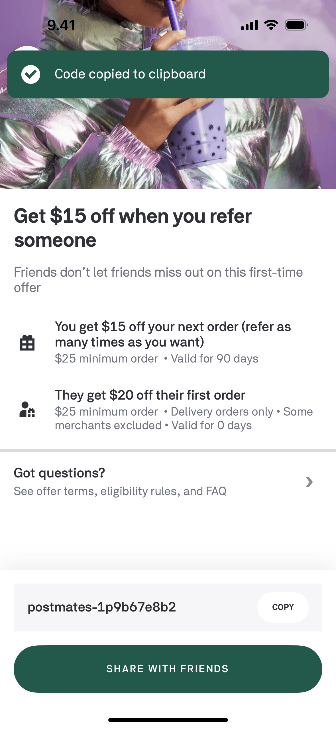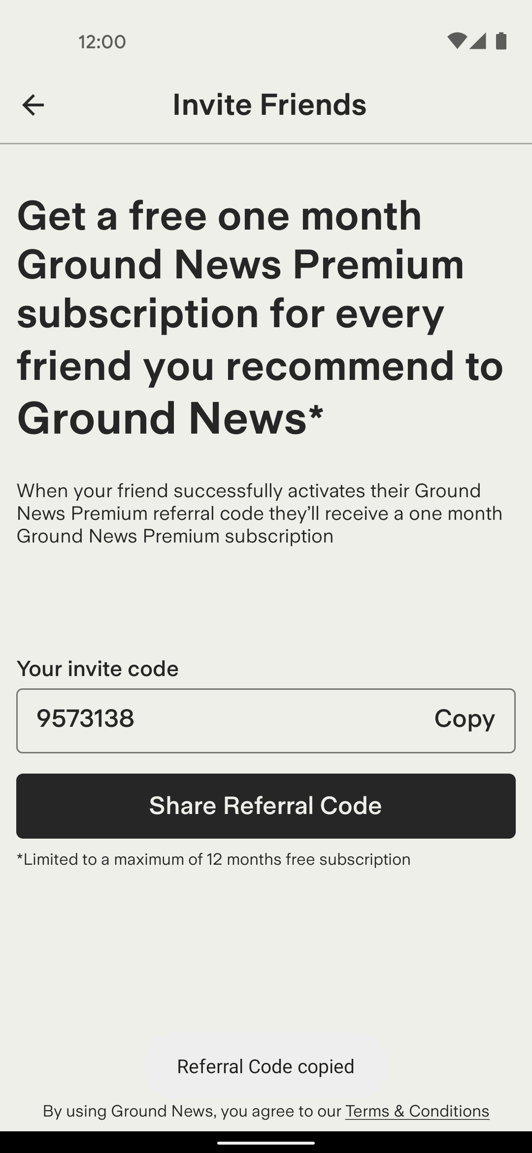 The user navigates to the referral screen from their account page and copies the referral code. A confirmation message appears after copying.