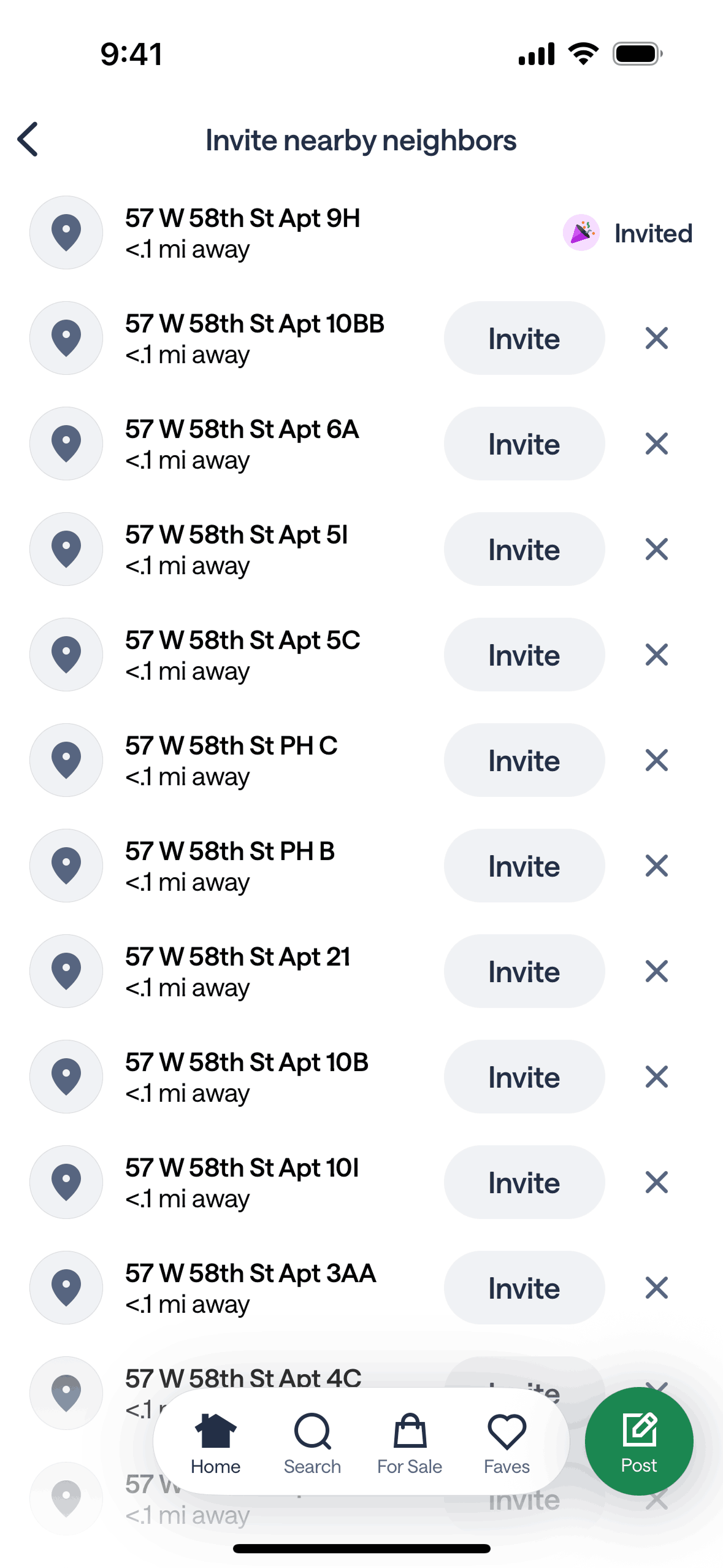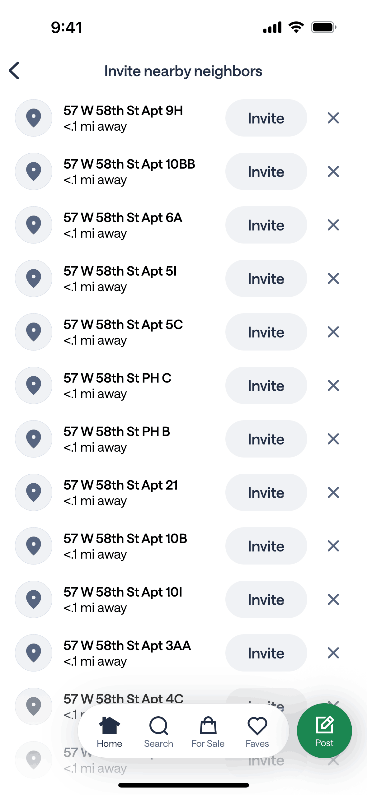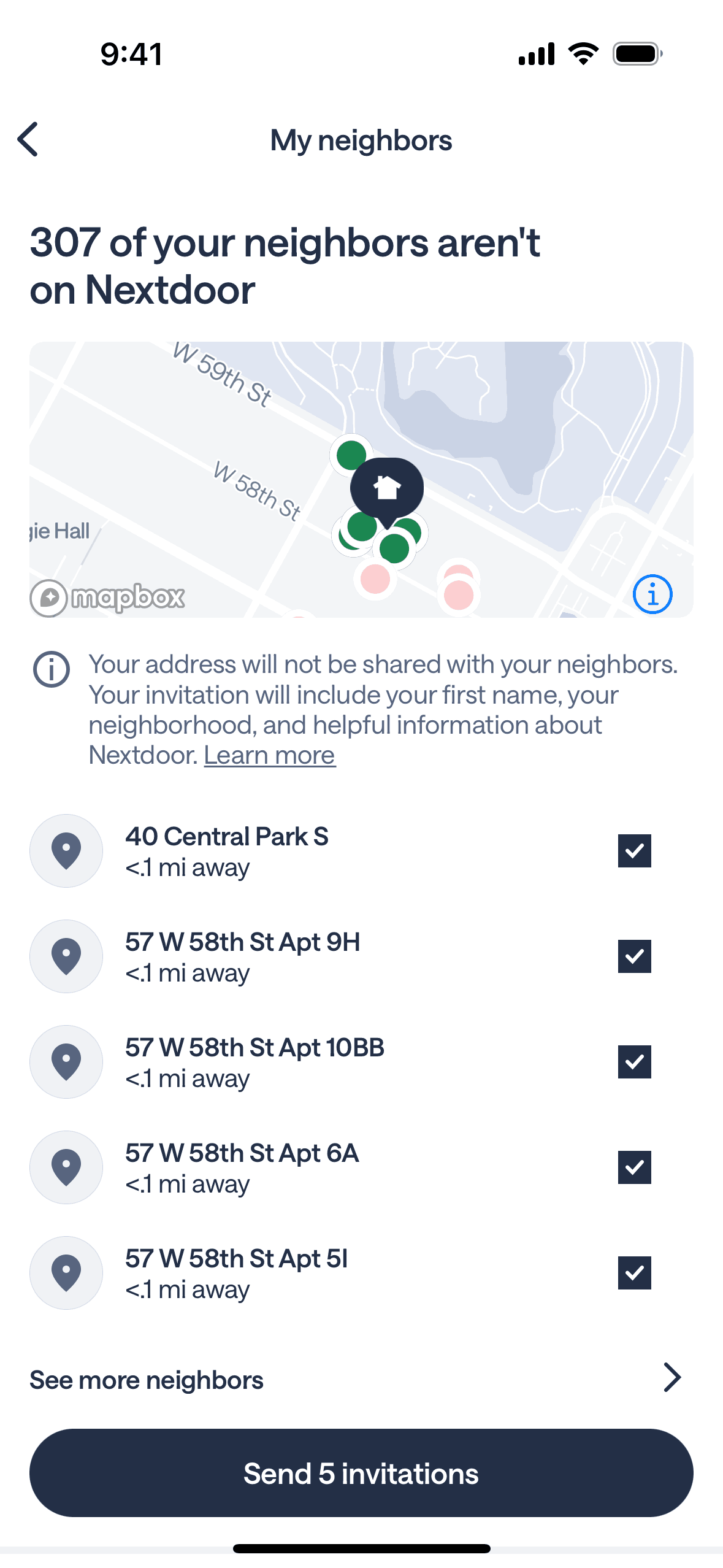 The user flow demonstrates inviting a neighbor to Nextdoor. The user navigates to the invite neighbors screen, selects a neighbor, and invites them.