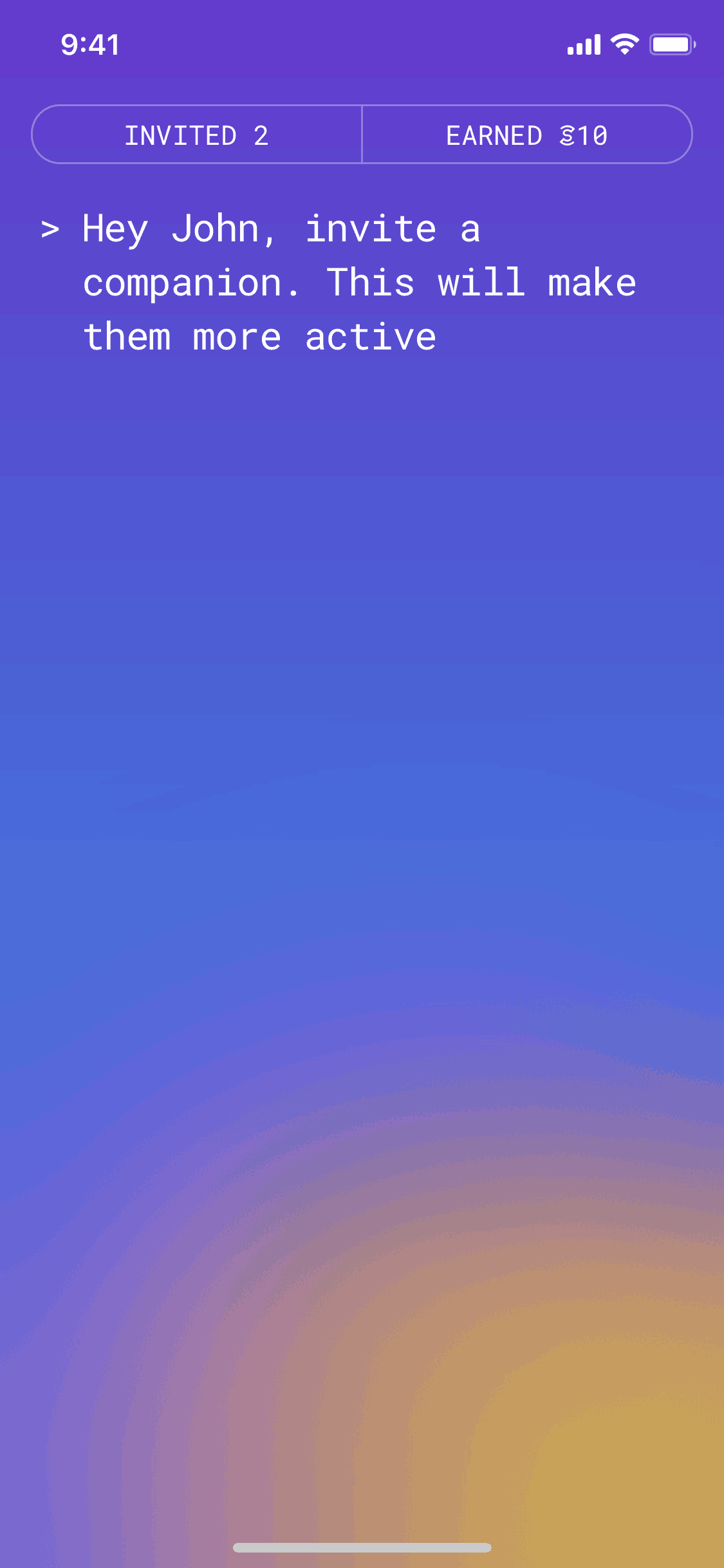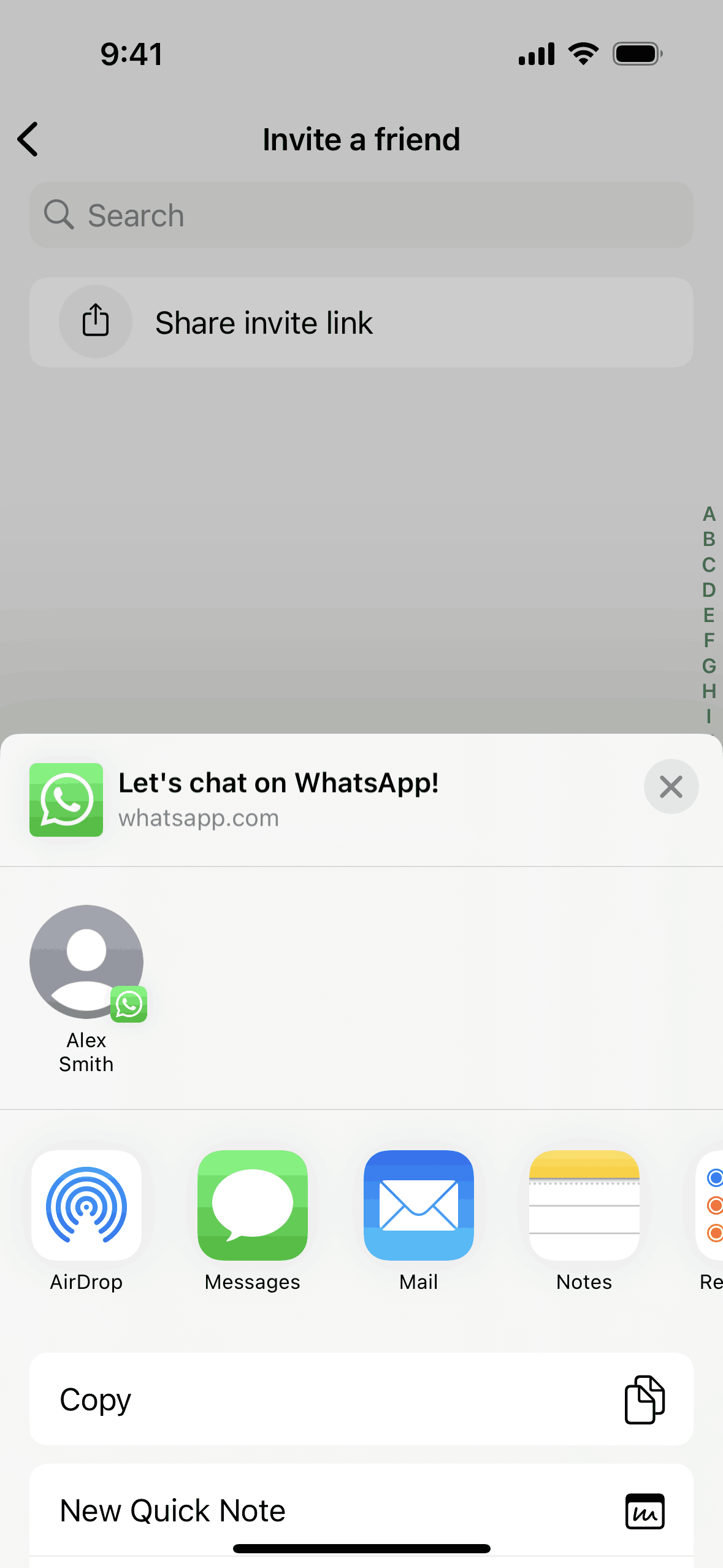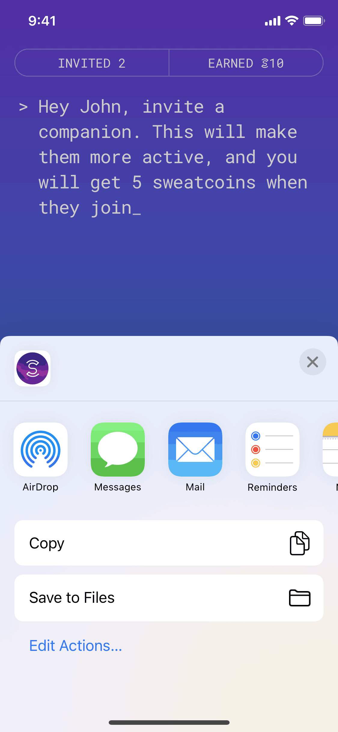 The user invites a friend to the app. They navigate from the homepage to the share sheet to send the invitation.
