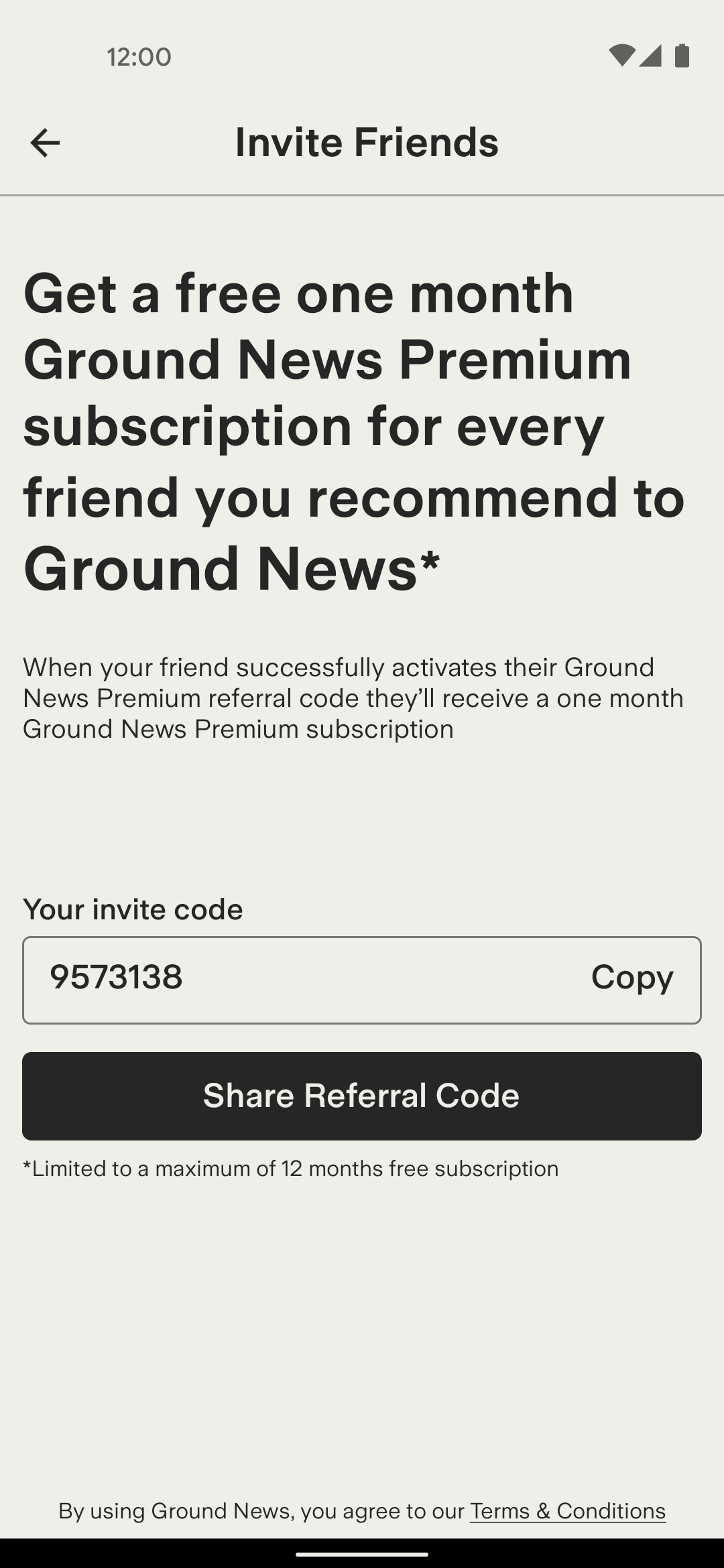 The user navigates to the invite friends screen from settings and copies the referral code. The goal is to share the code to earn a free subscription.