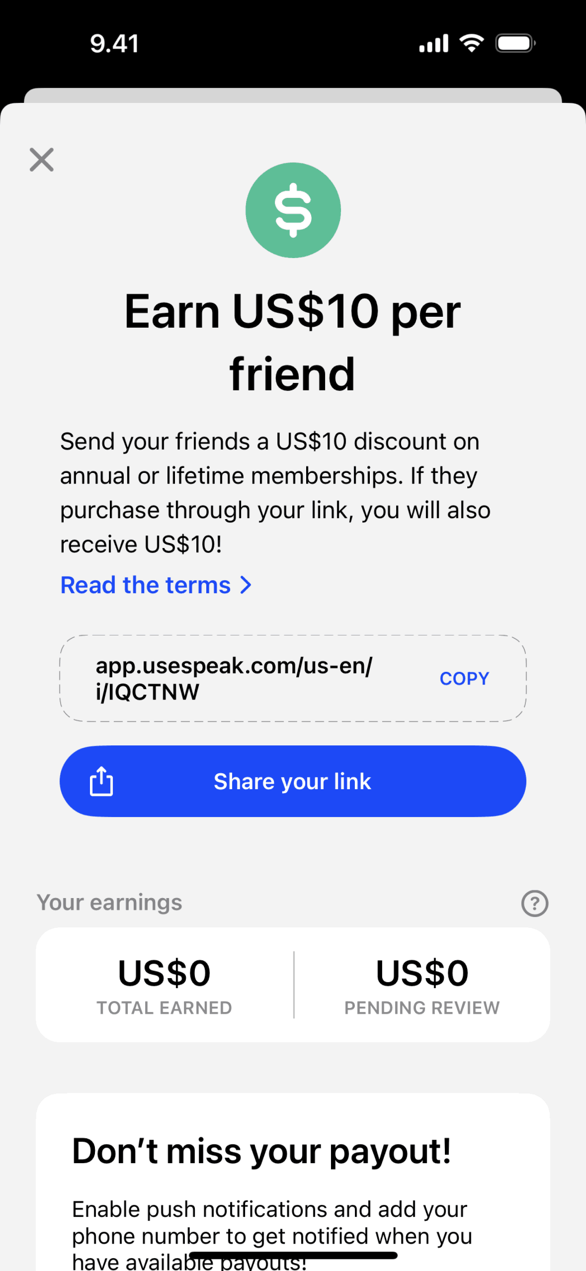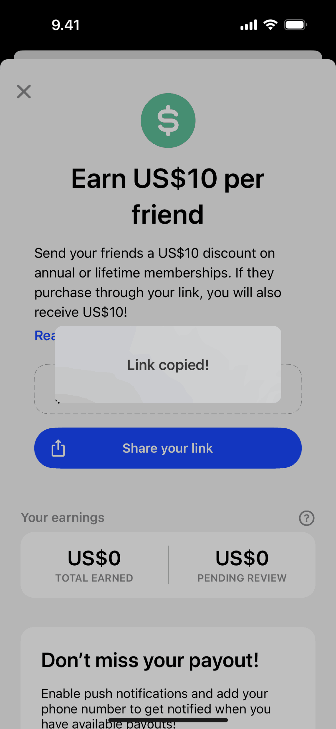 The user navigates from their profile to the referral program, copies their referral link, and manages payout options. The goal is to encourage users to refer friends.