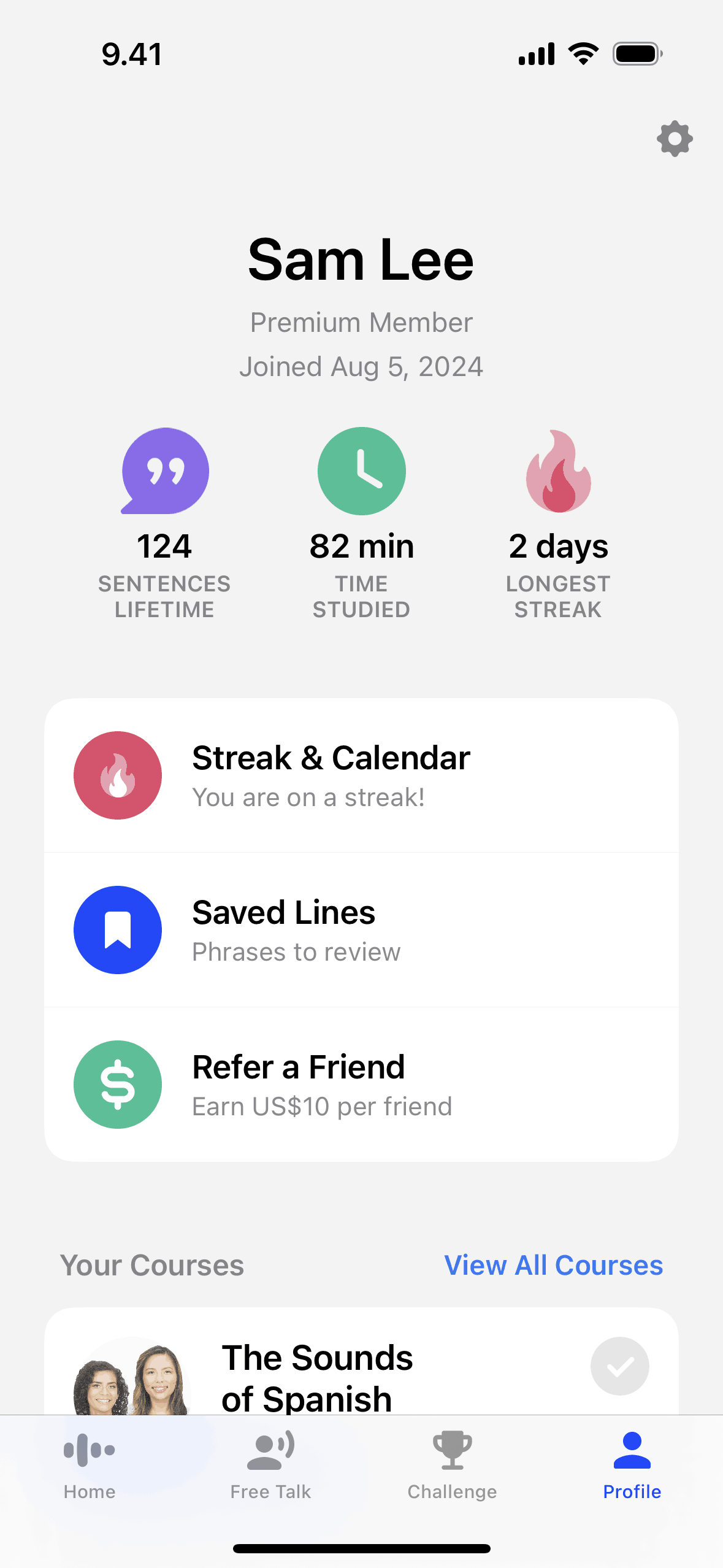 The user views their profile and is presented with a referral reward. They navigate to the referral details screen and can invite a friend.