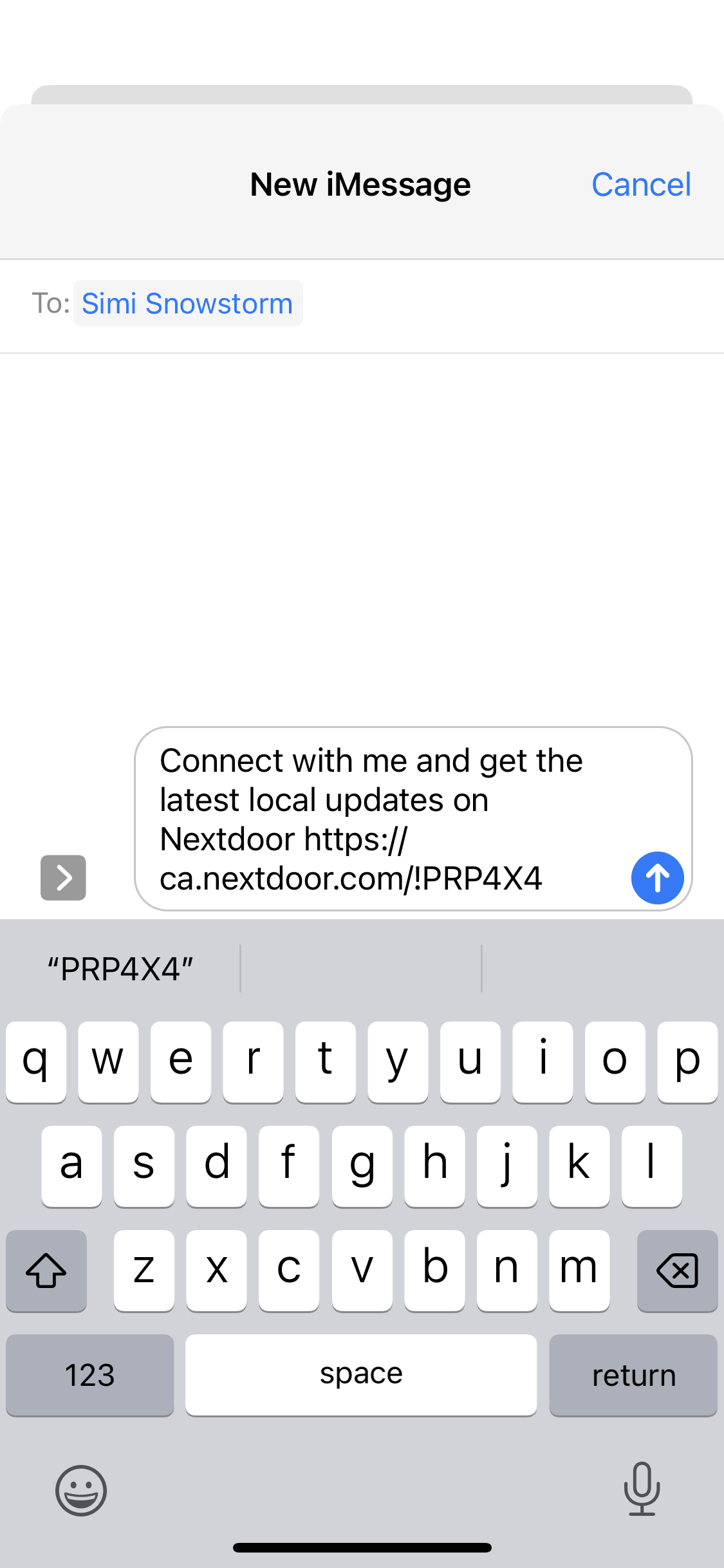 The user flow allows inviting friends to Nextdoor. It presents a contact list and opens a pre-filled iMessage for sending invitations.