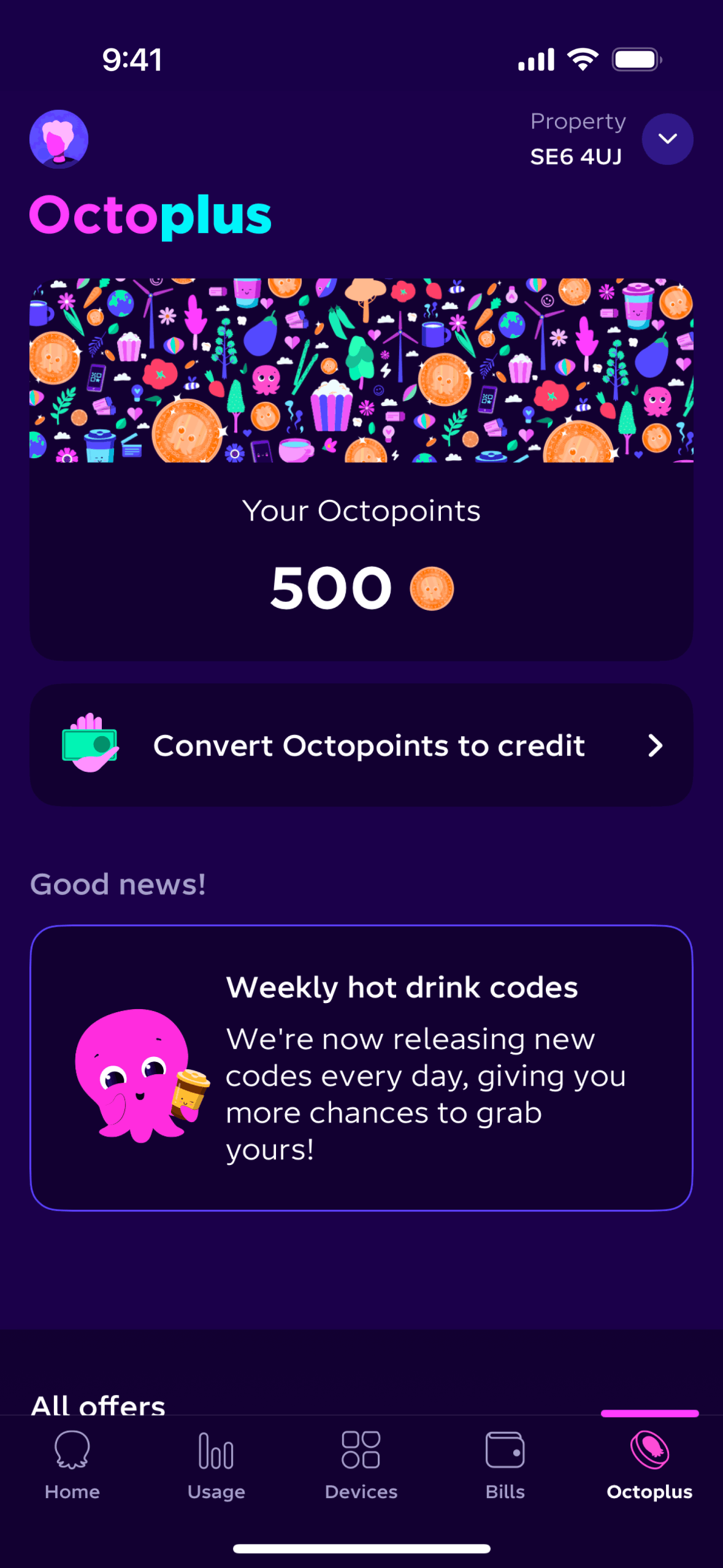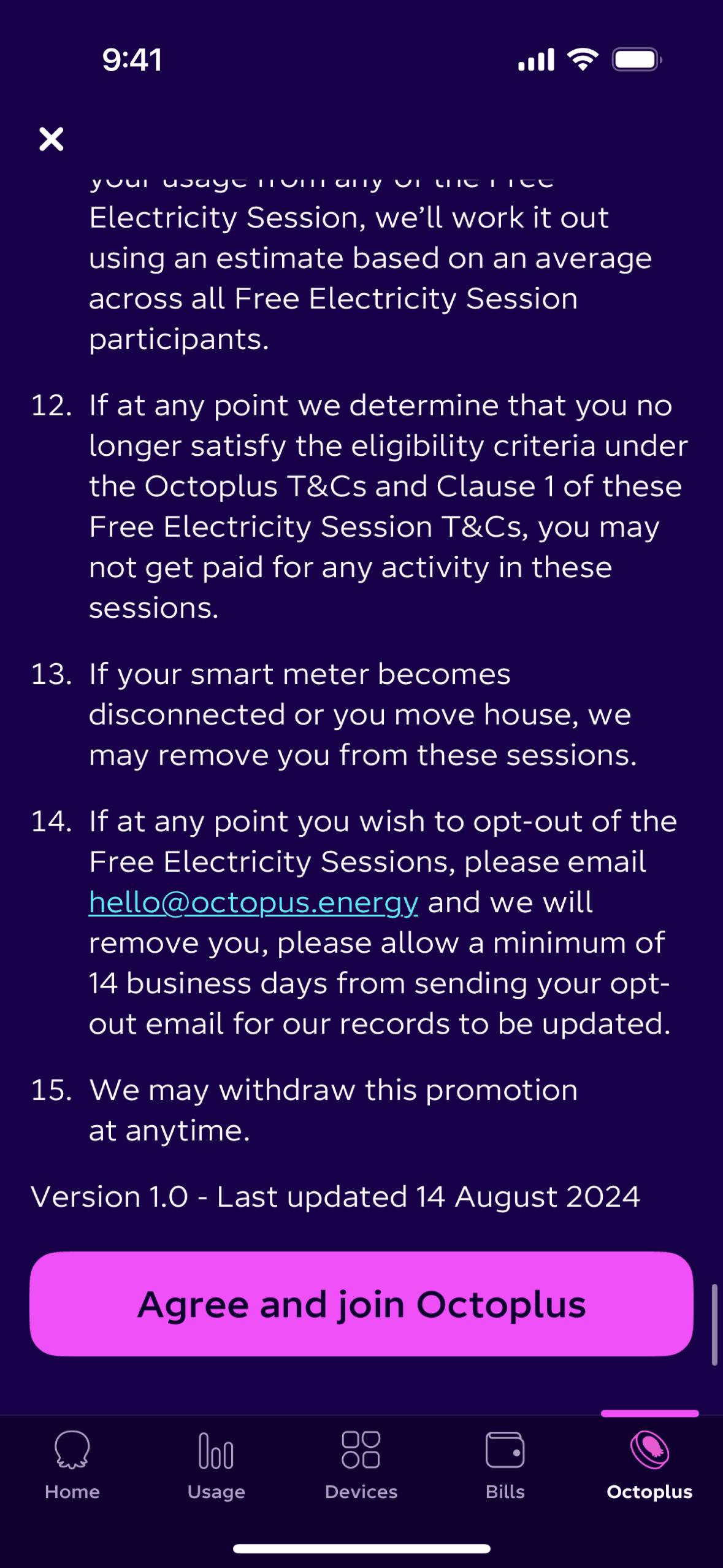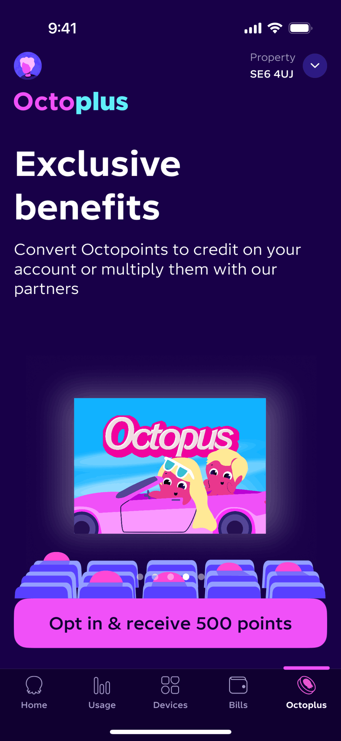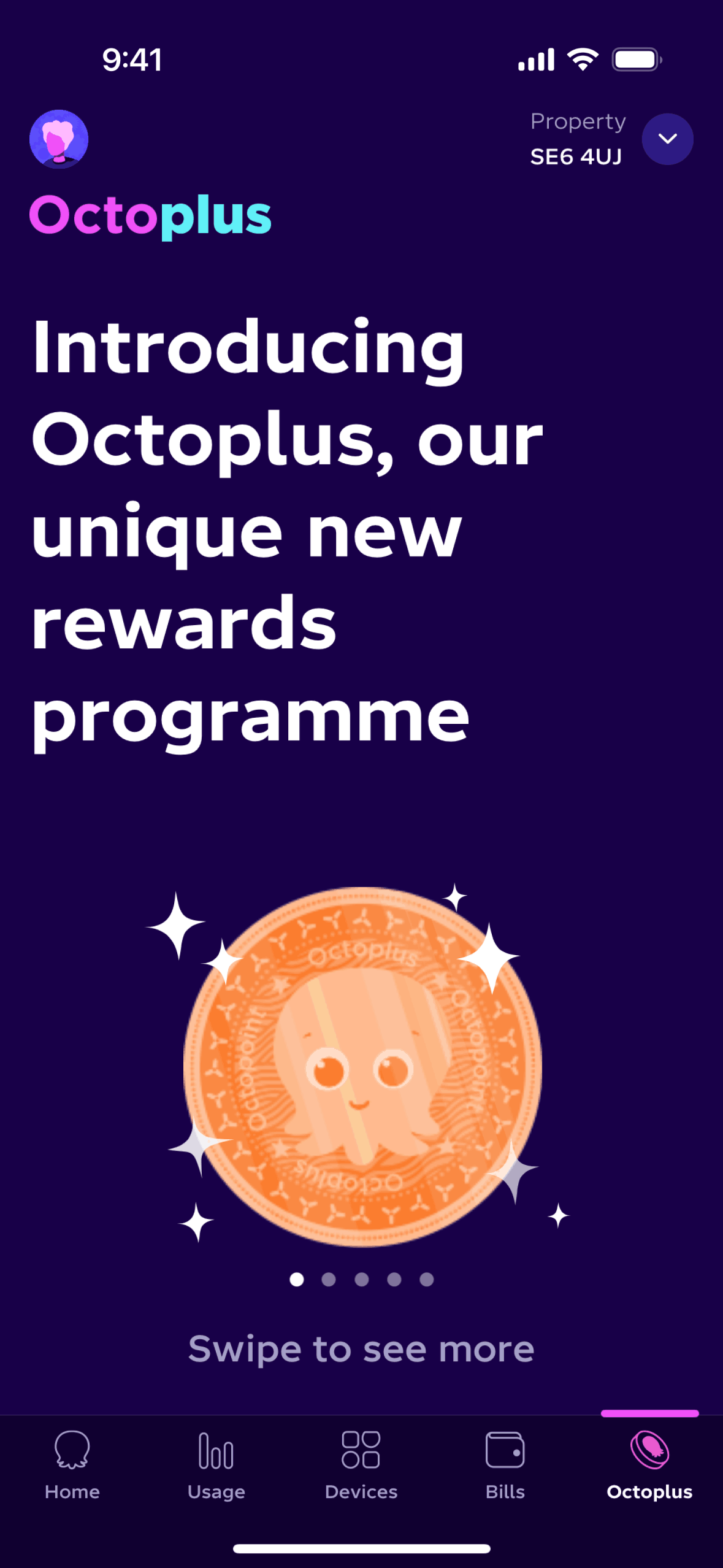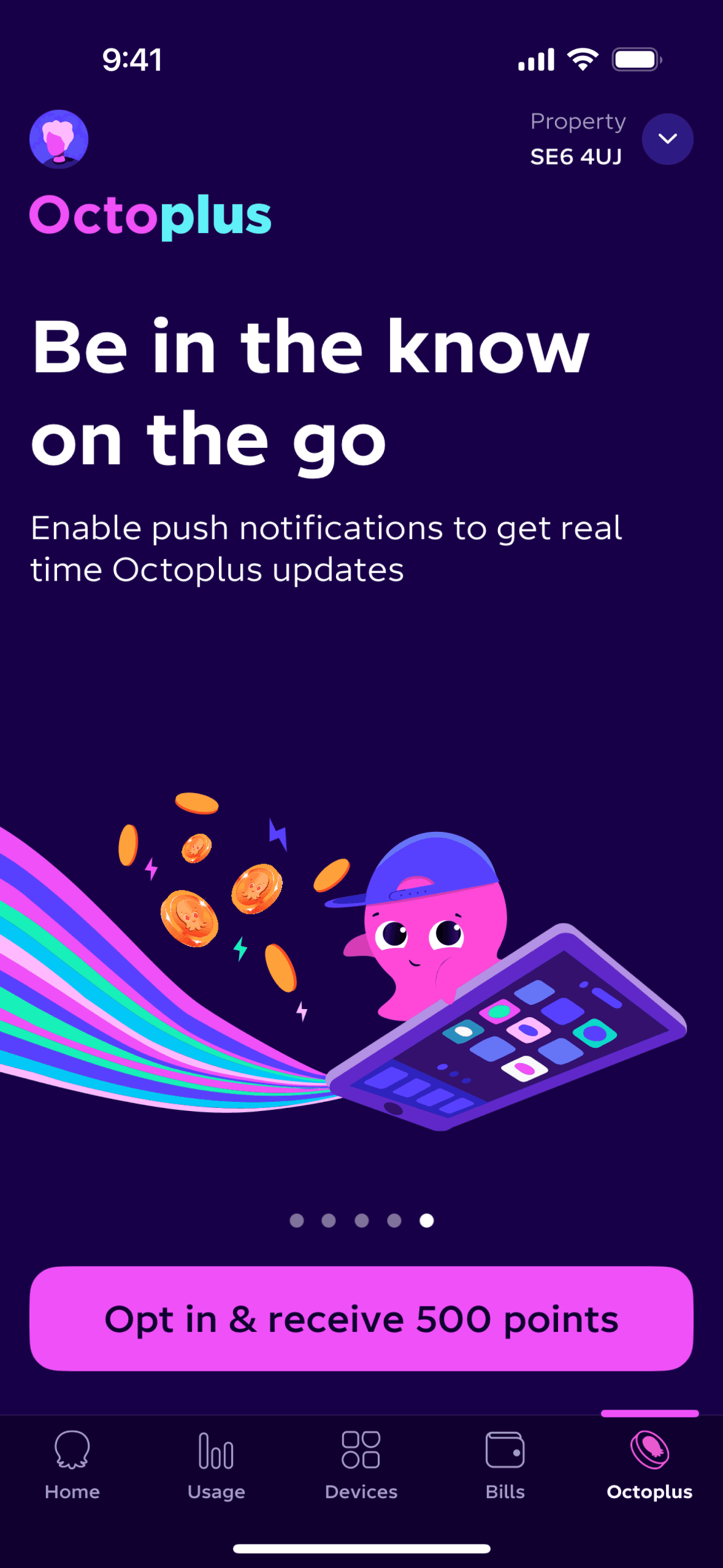 The user flow showcases a user joining the Octoplus rewards program by opting in, agreeing to terms and viewing the dashboard. The user can also enable push notifications.