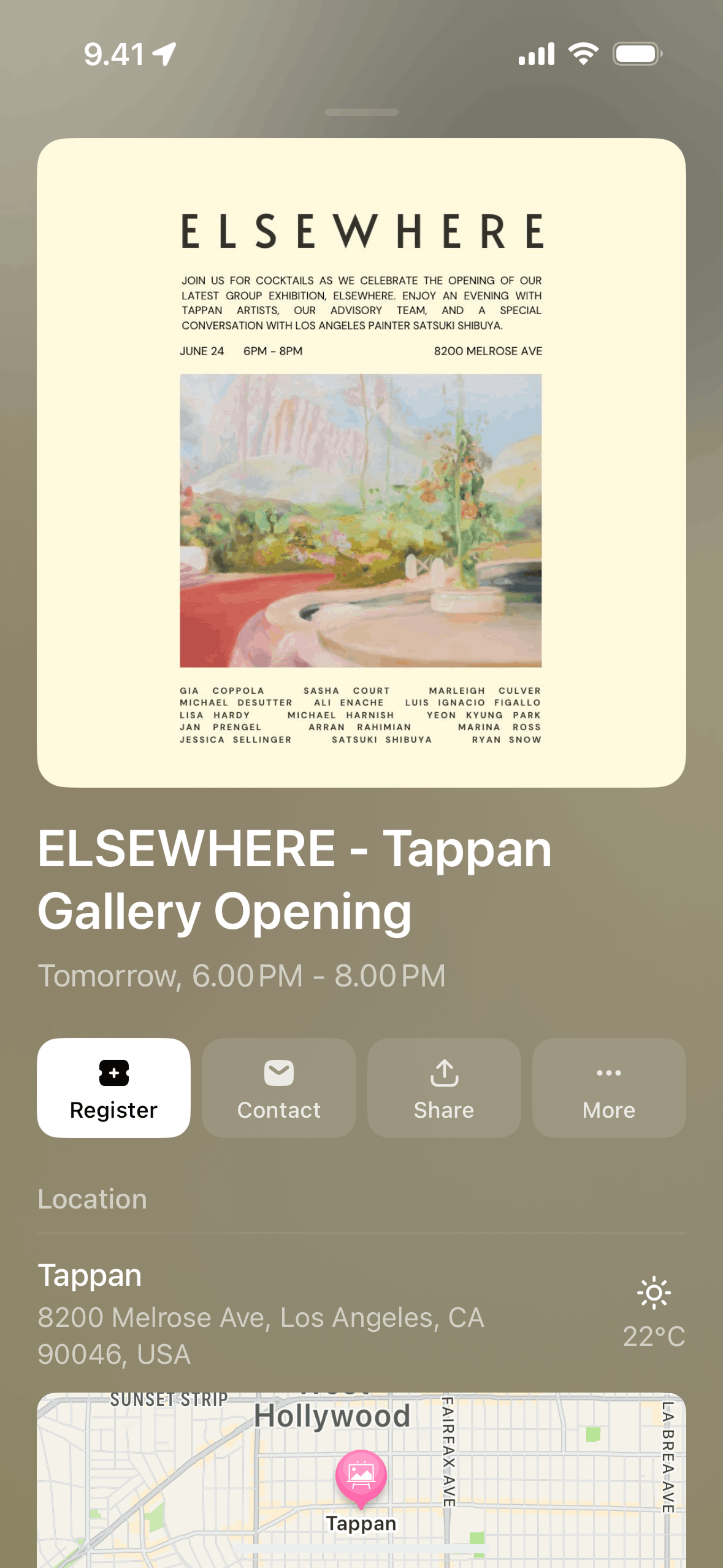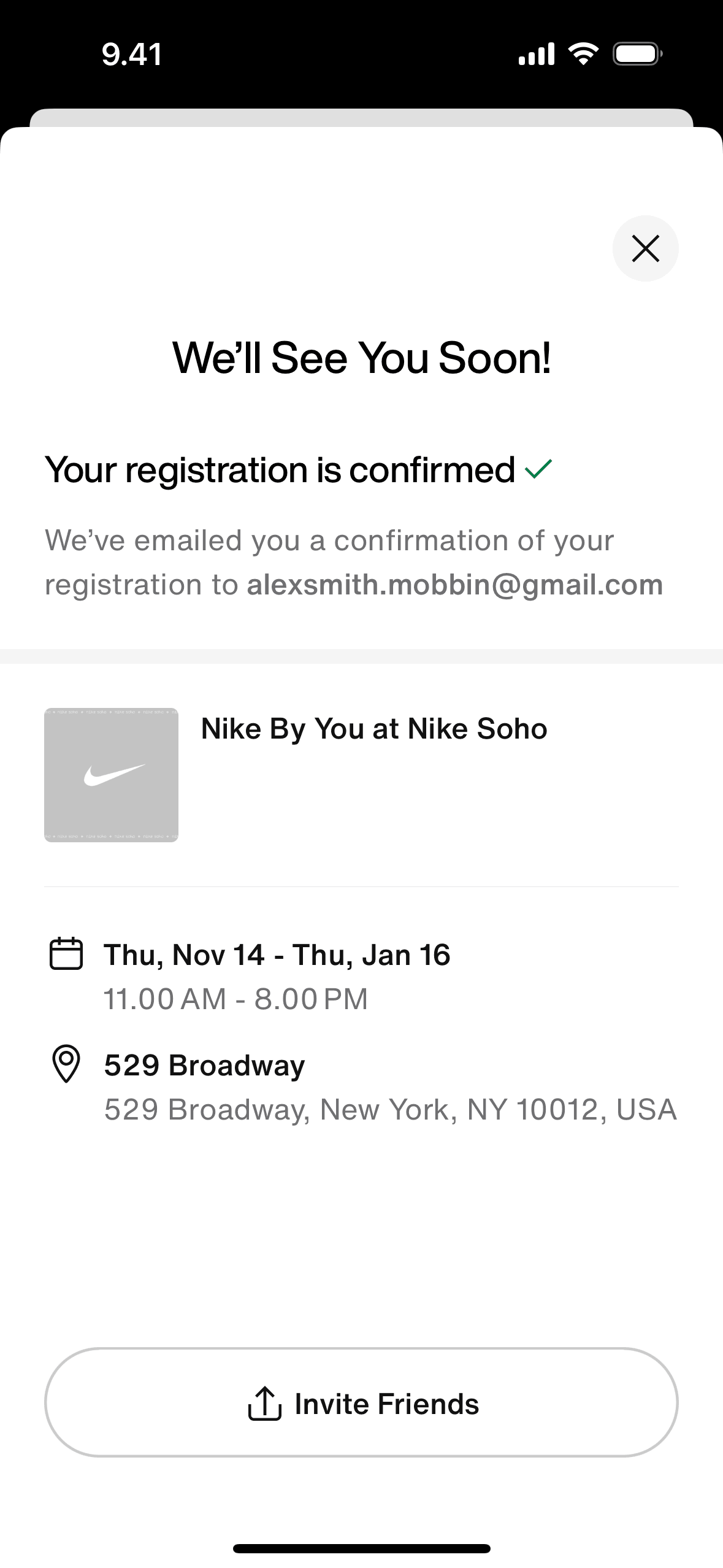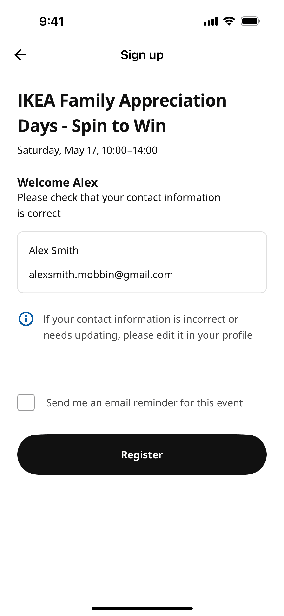 The user flow demonstrates registering for an event. It shows the event details, registration page, and confirmation upon completion.