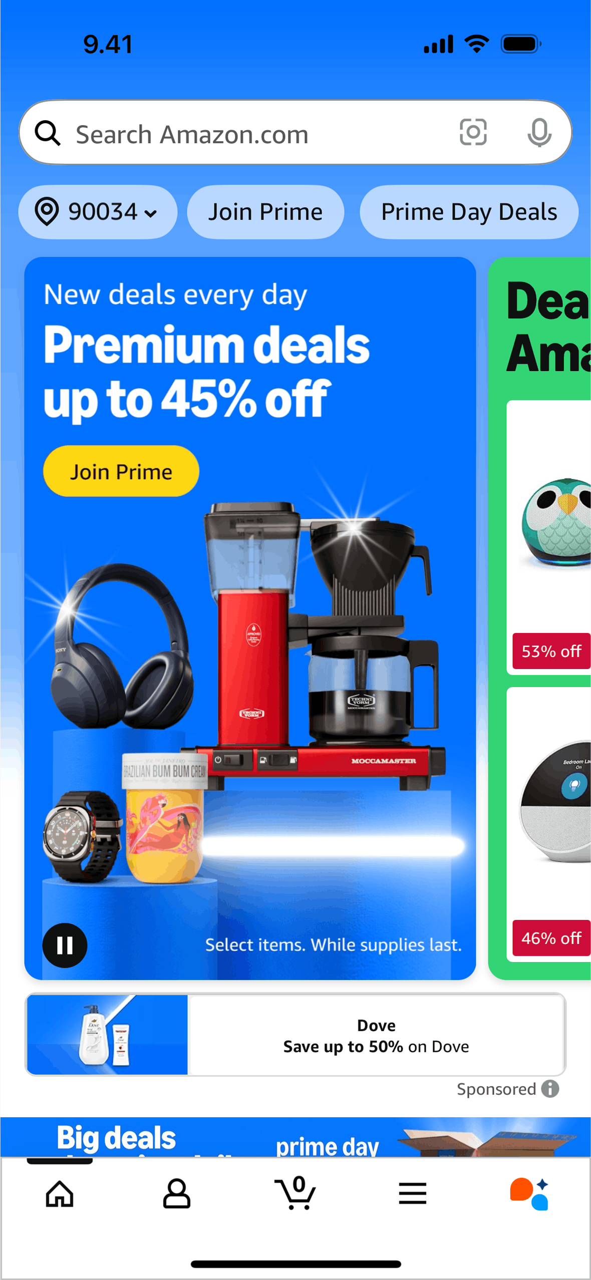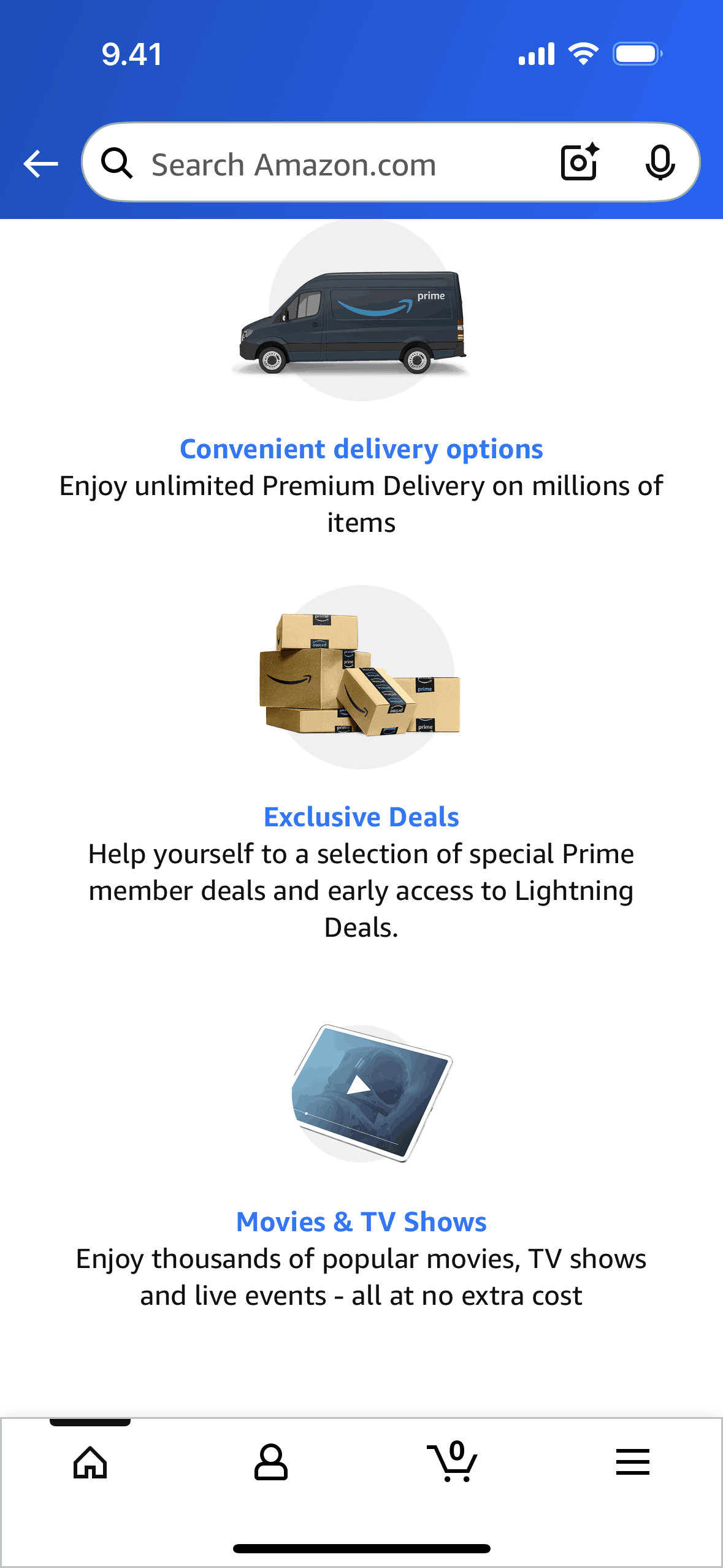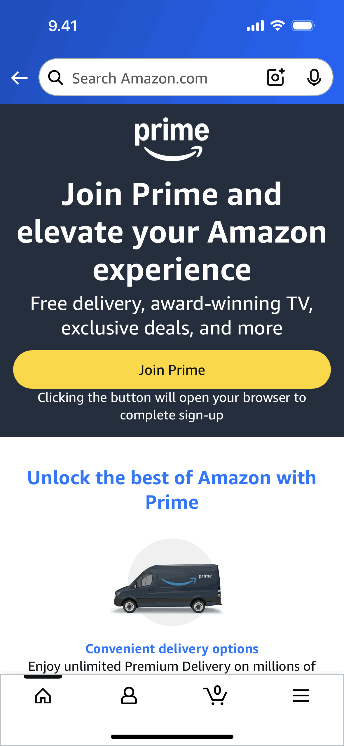 The user flow showcases joining Amazon Prime. It highlights the benefits of Prime membership and encourages users to sign up.