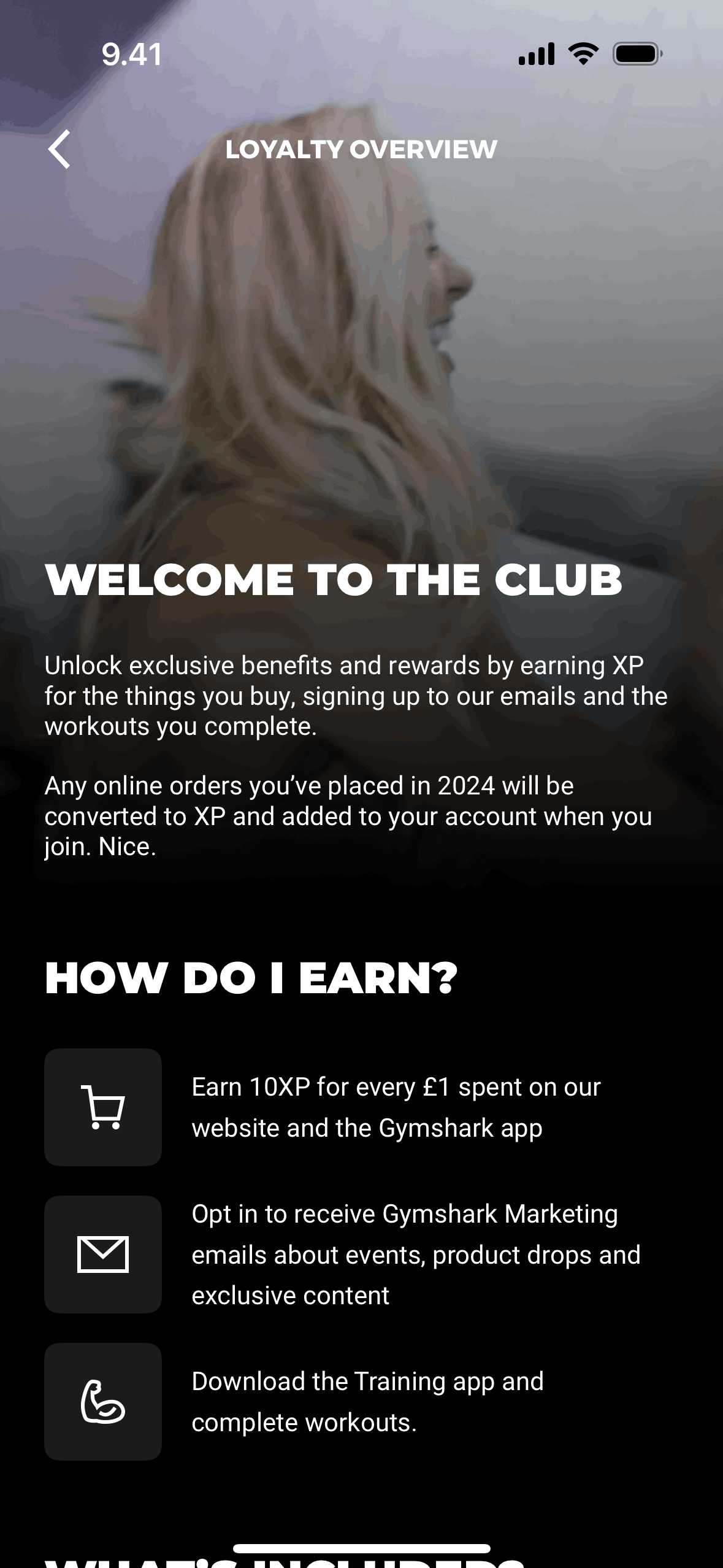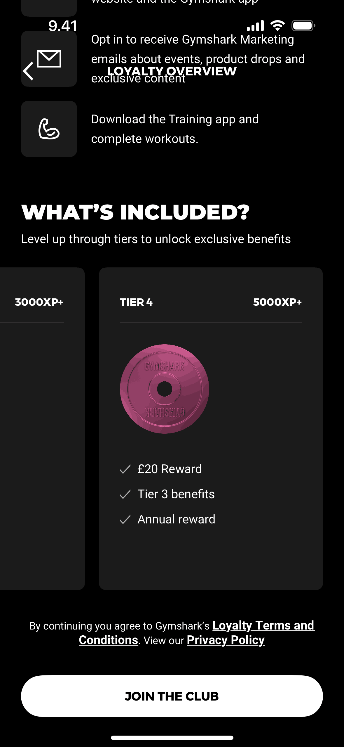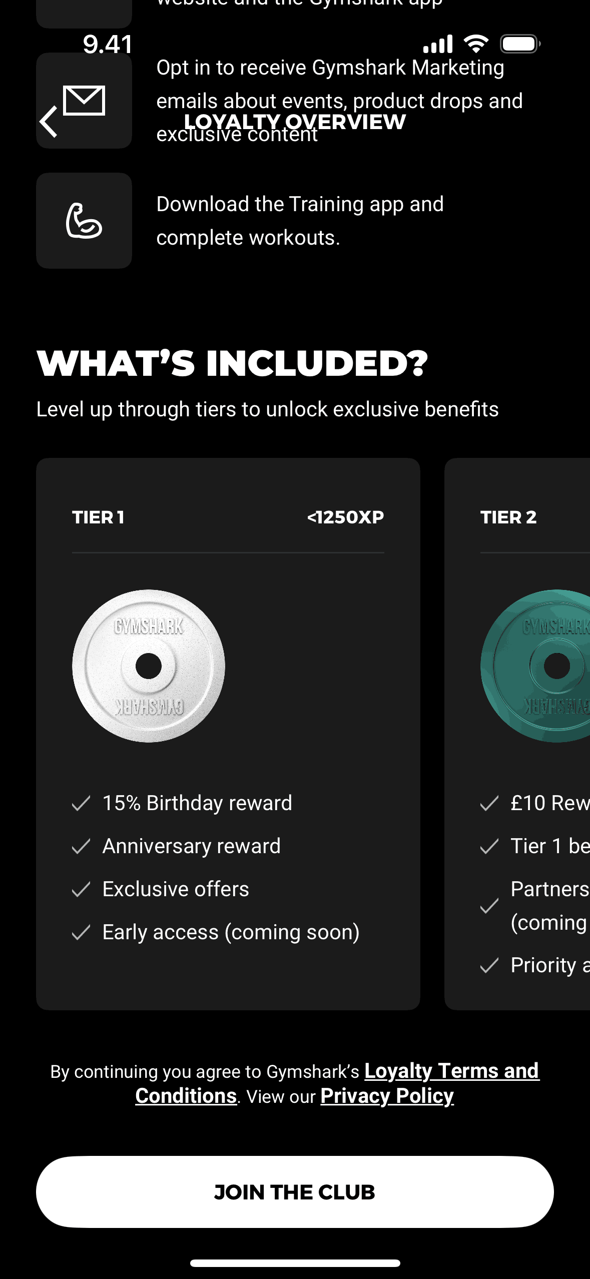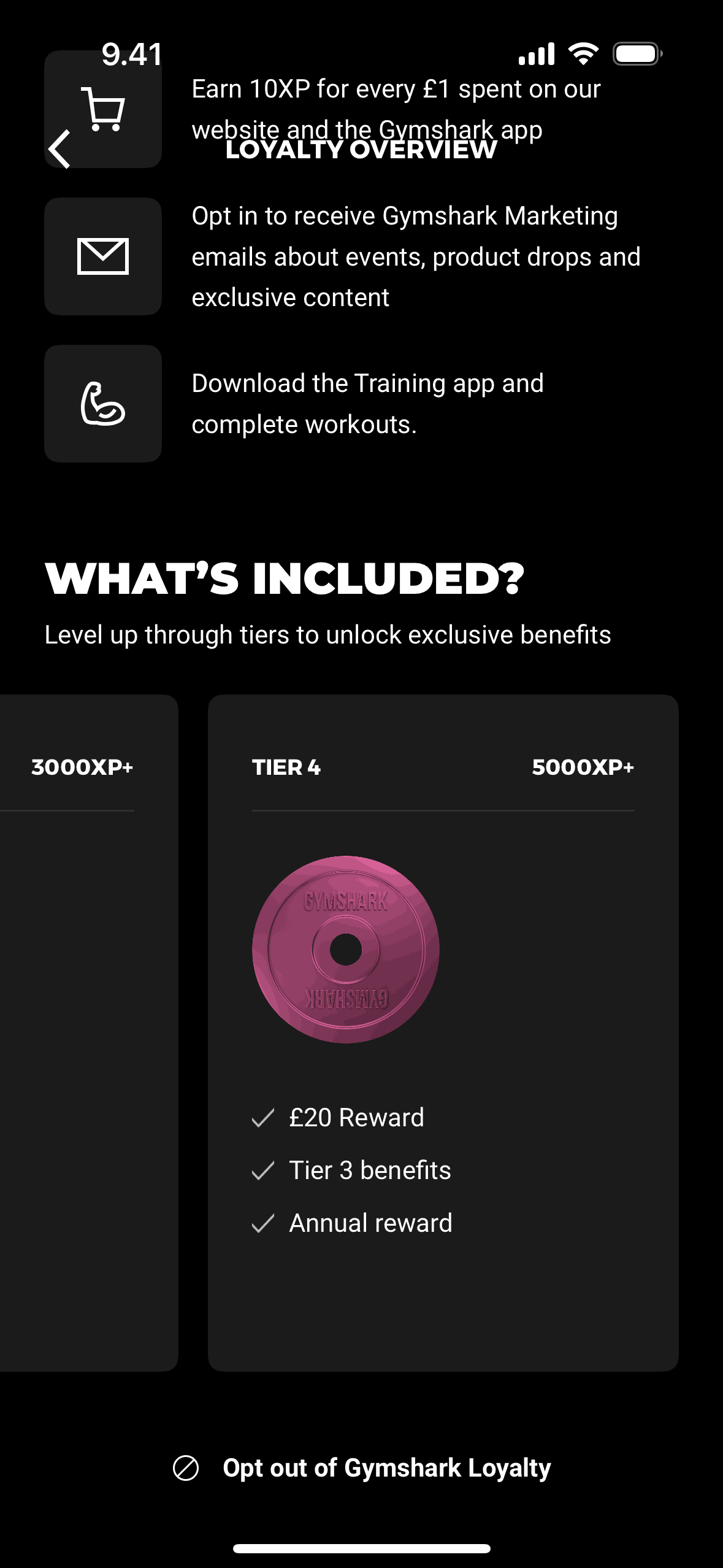 The user explores the Gymshark loyalty program, viewing tier benefits and is given the option to join or opt out. The flow highlights the benefits of joining the club.