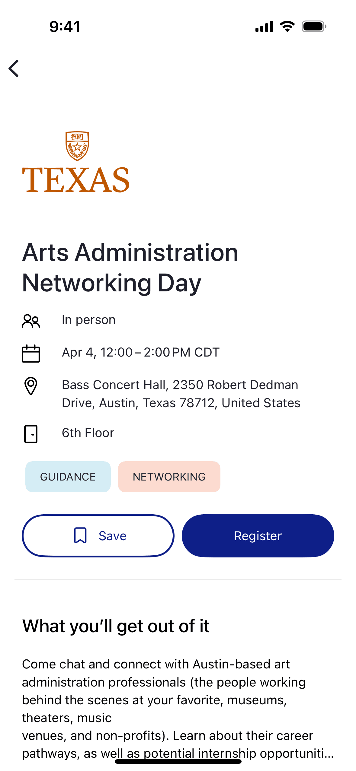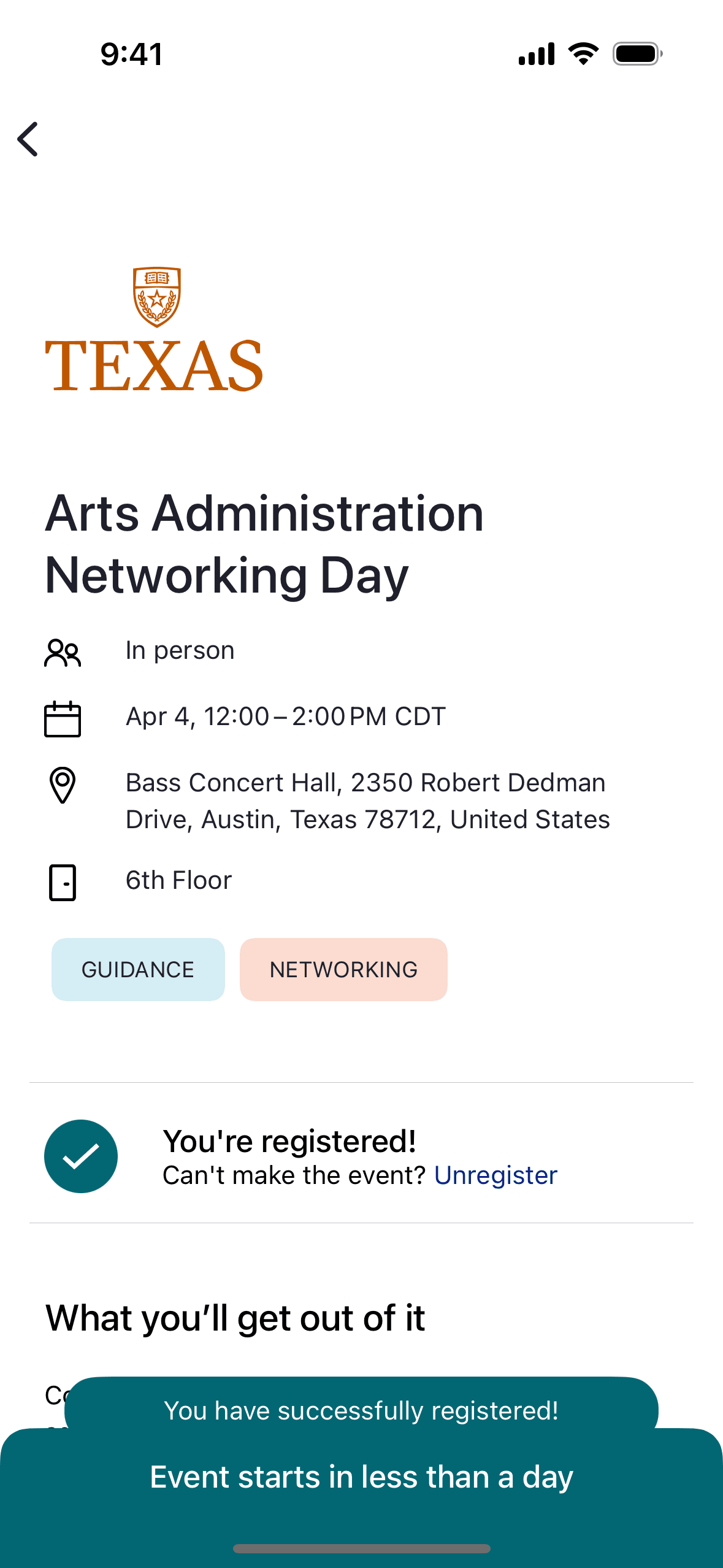 The user views event details and then registers for the event. A confirmation message is displayed upon successful registration.