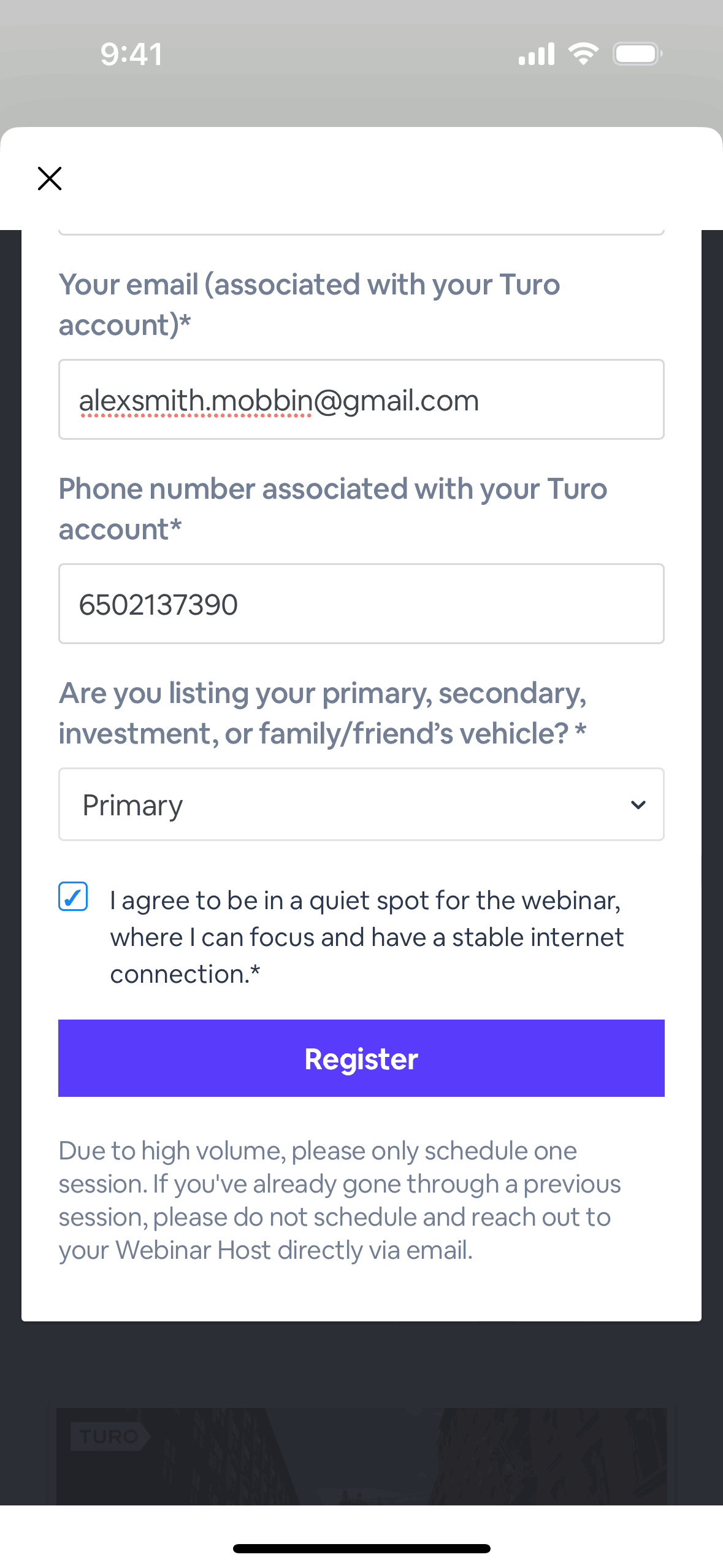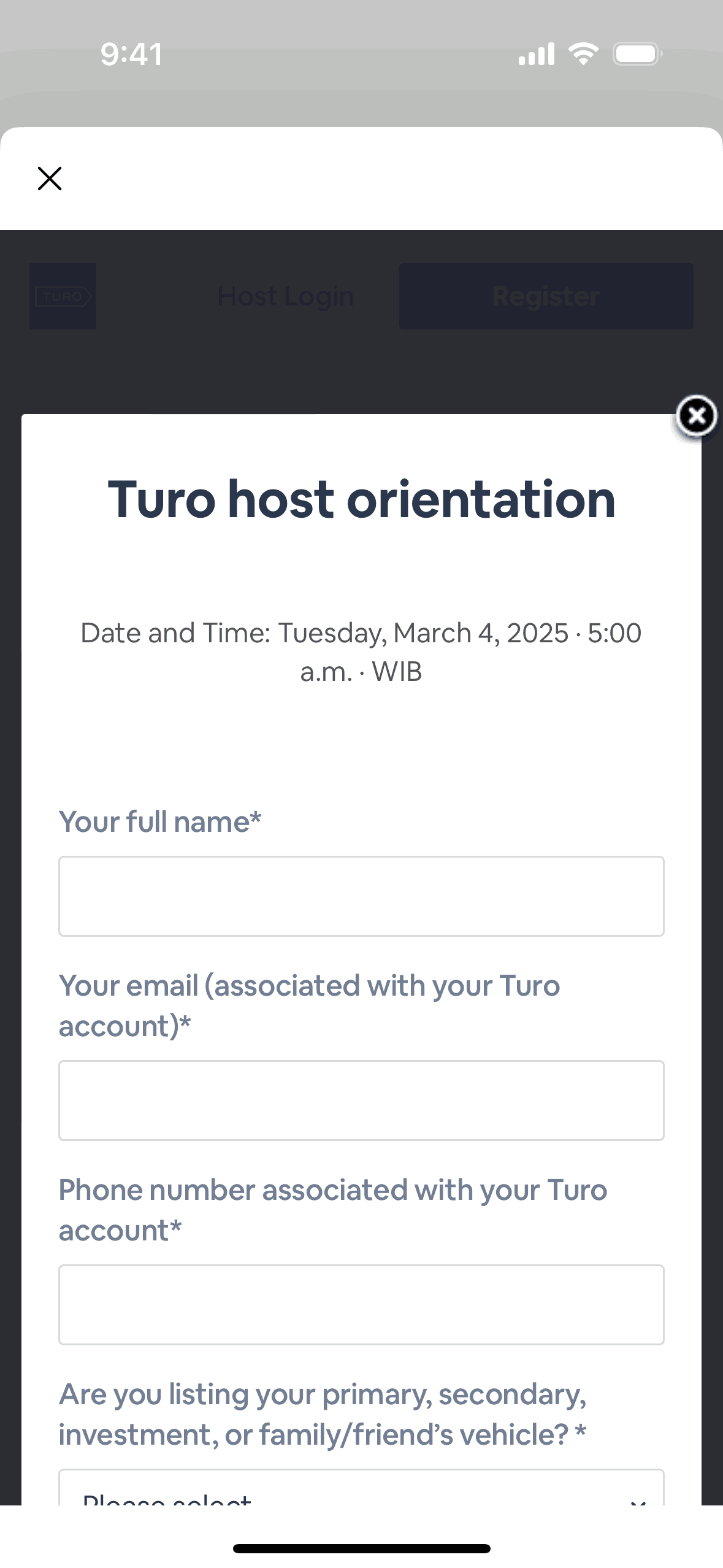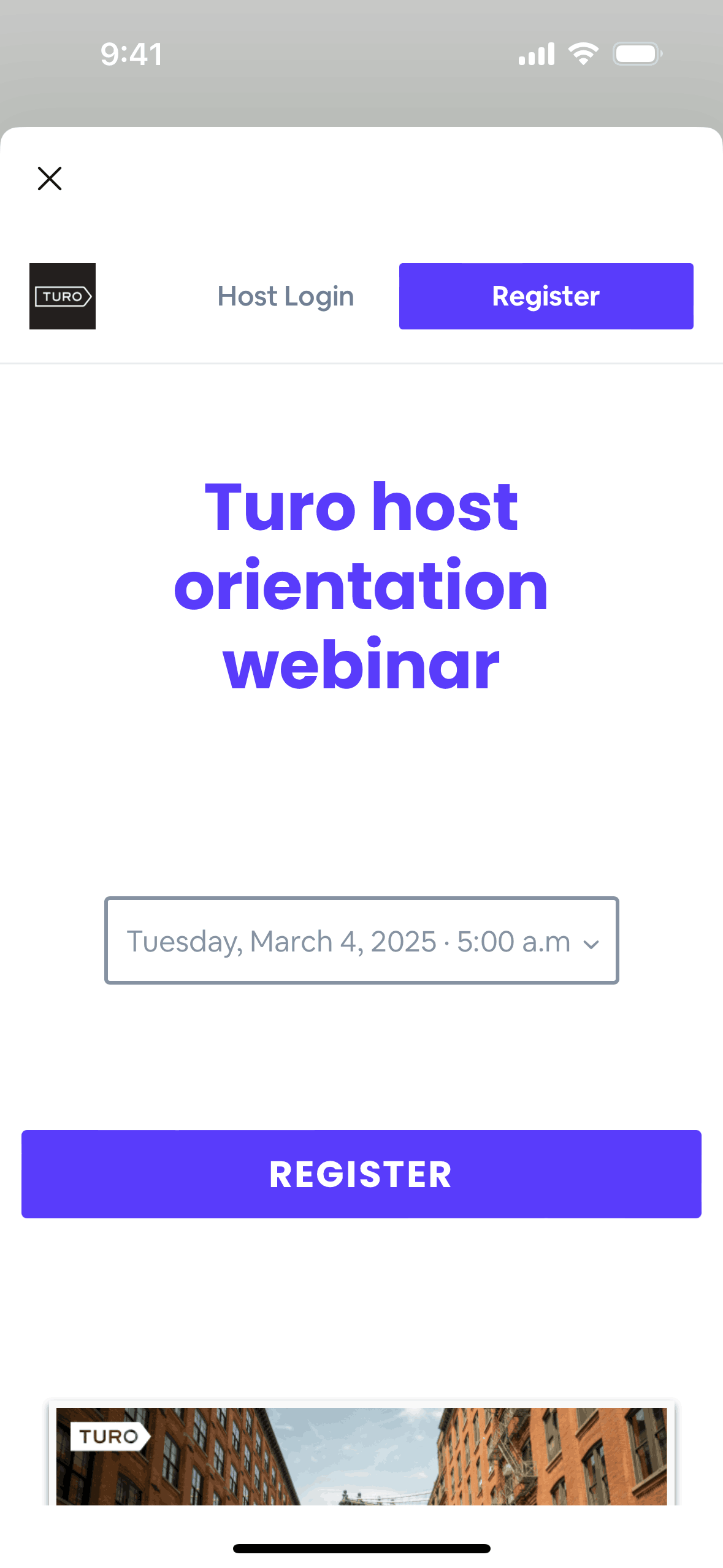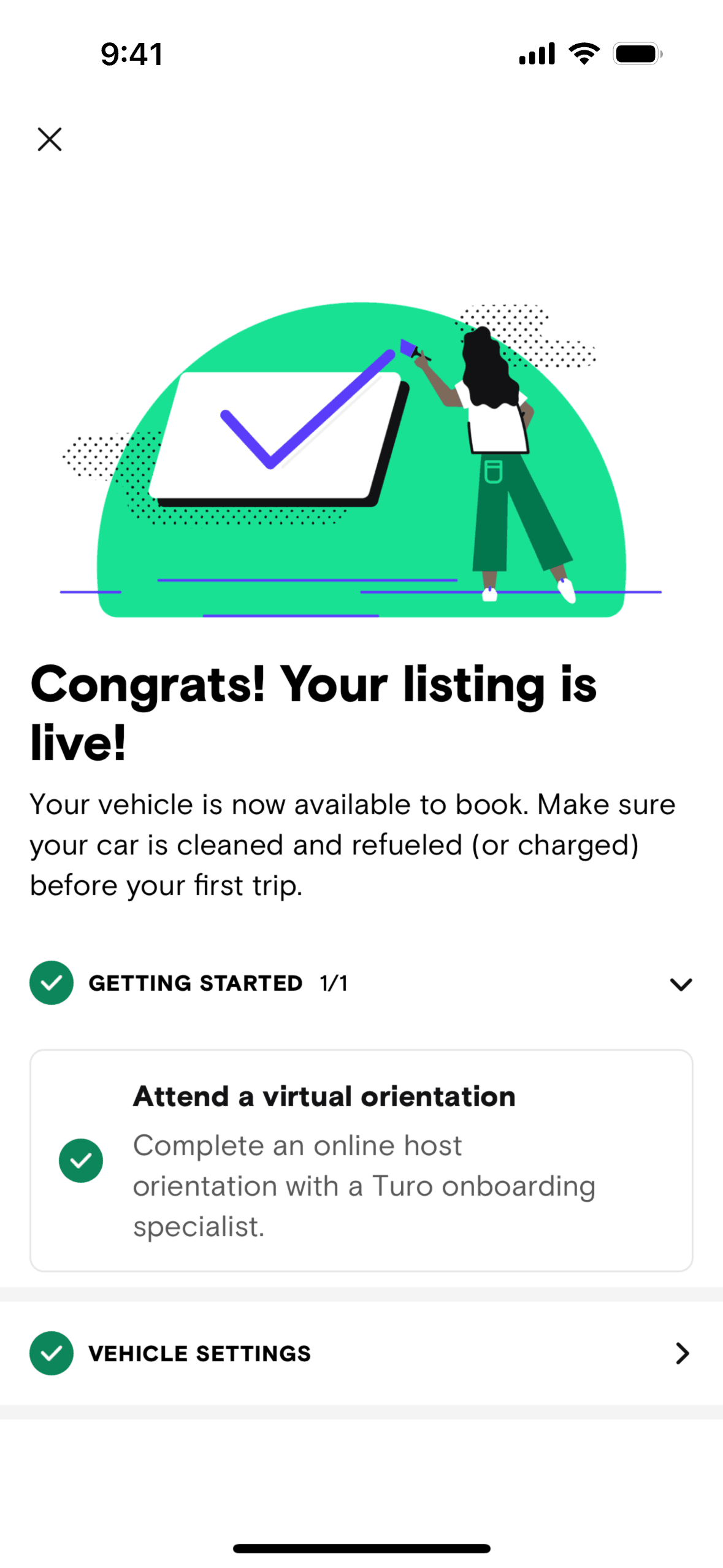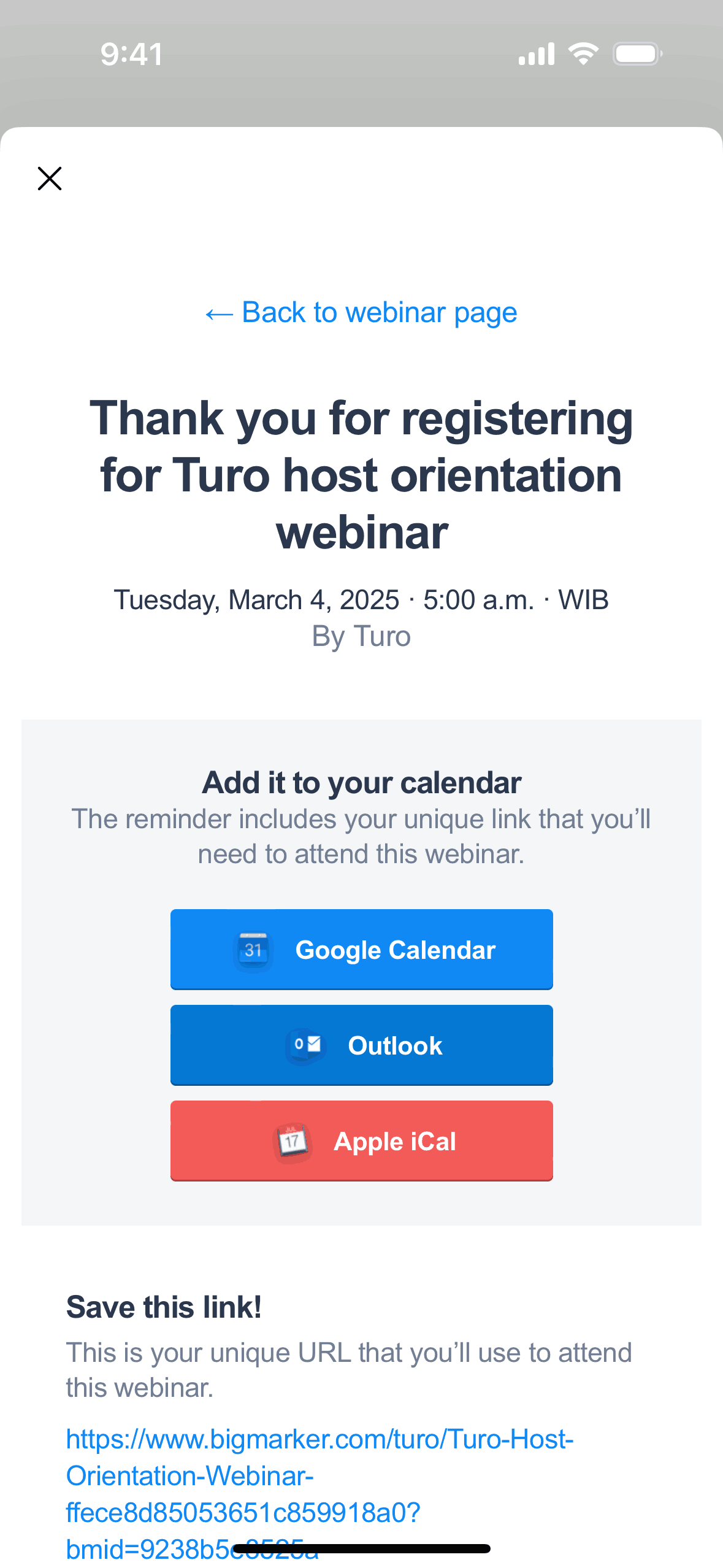 The user registers for a host orientation webinar, providing necessary information. Upon completion, the user's listing goes live and the onboarding checklist reflects the completed step.