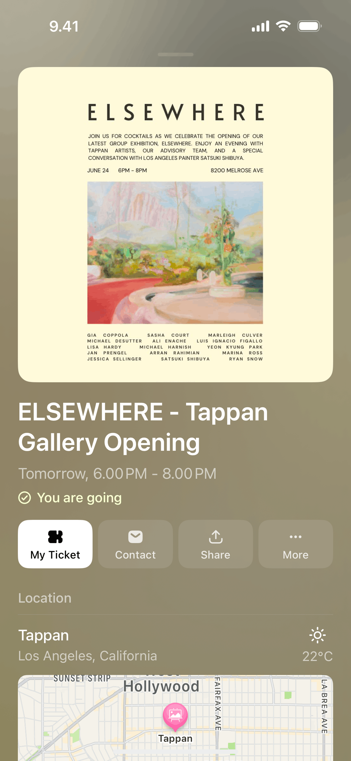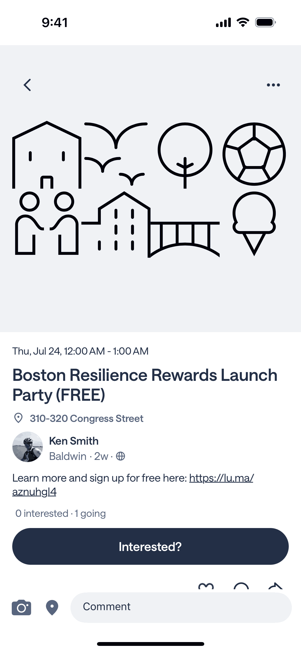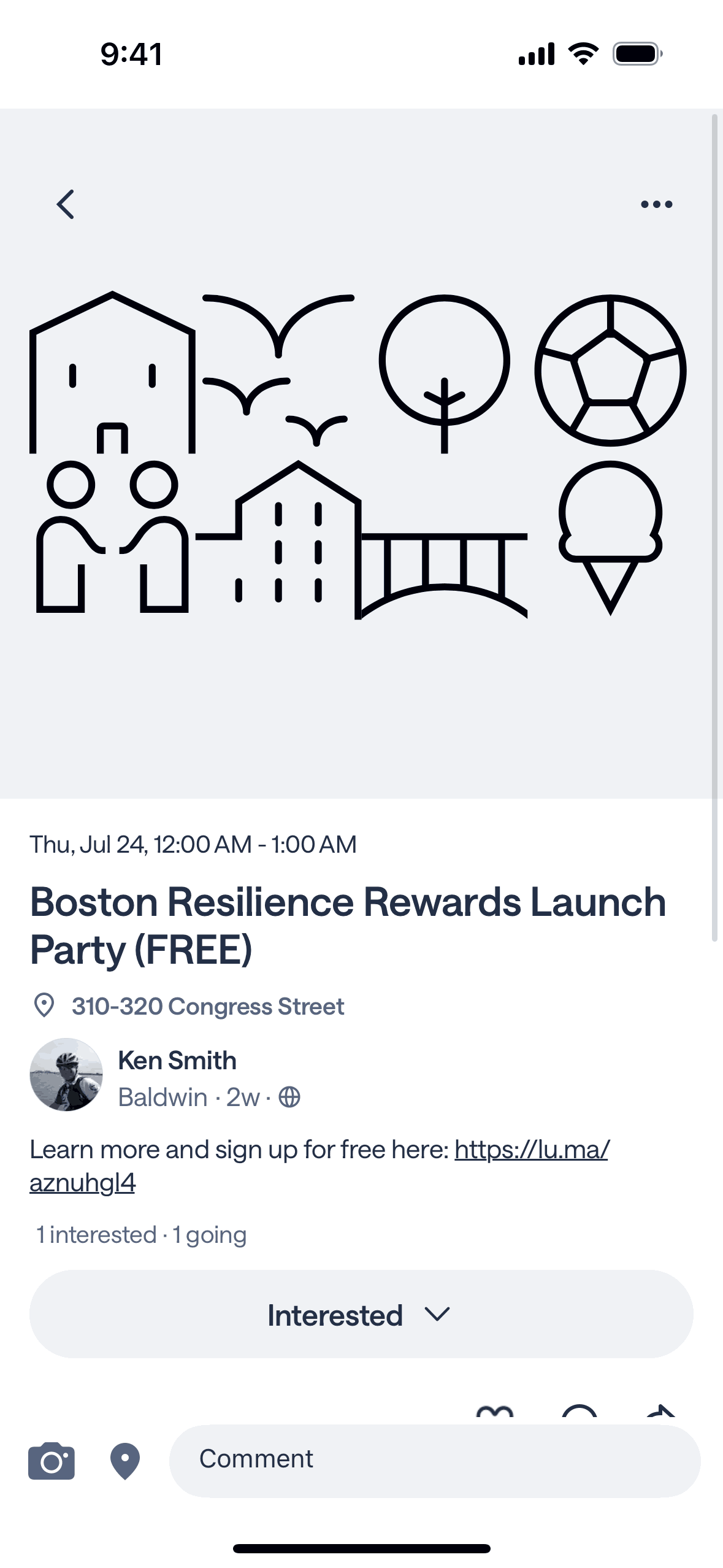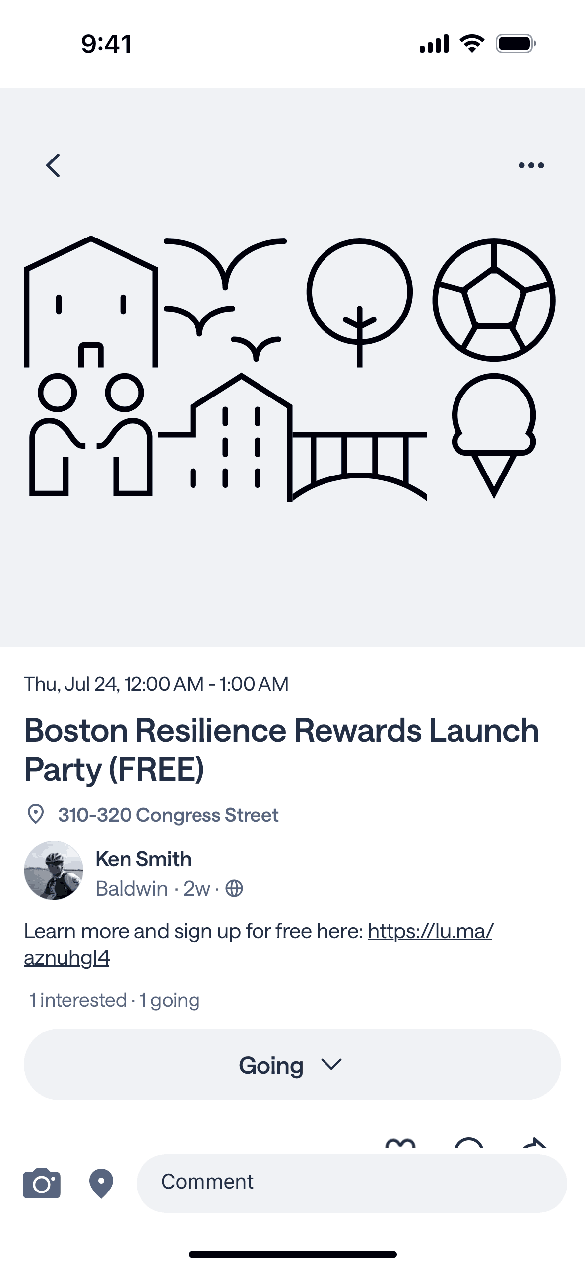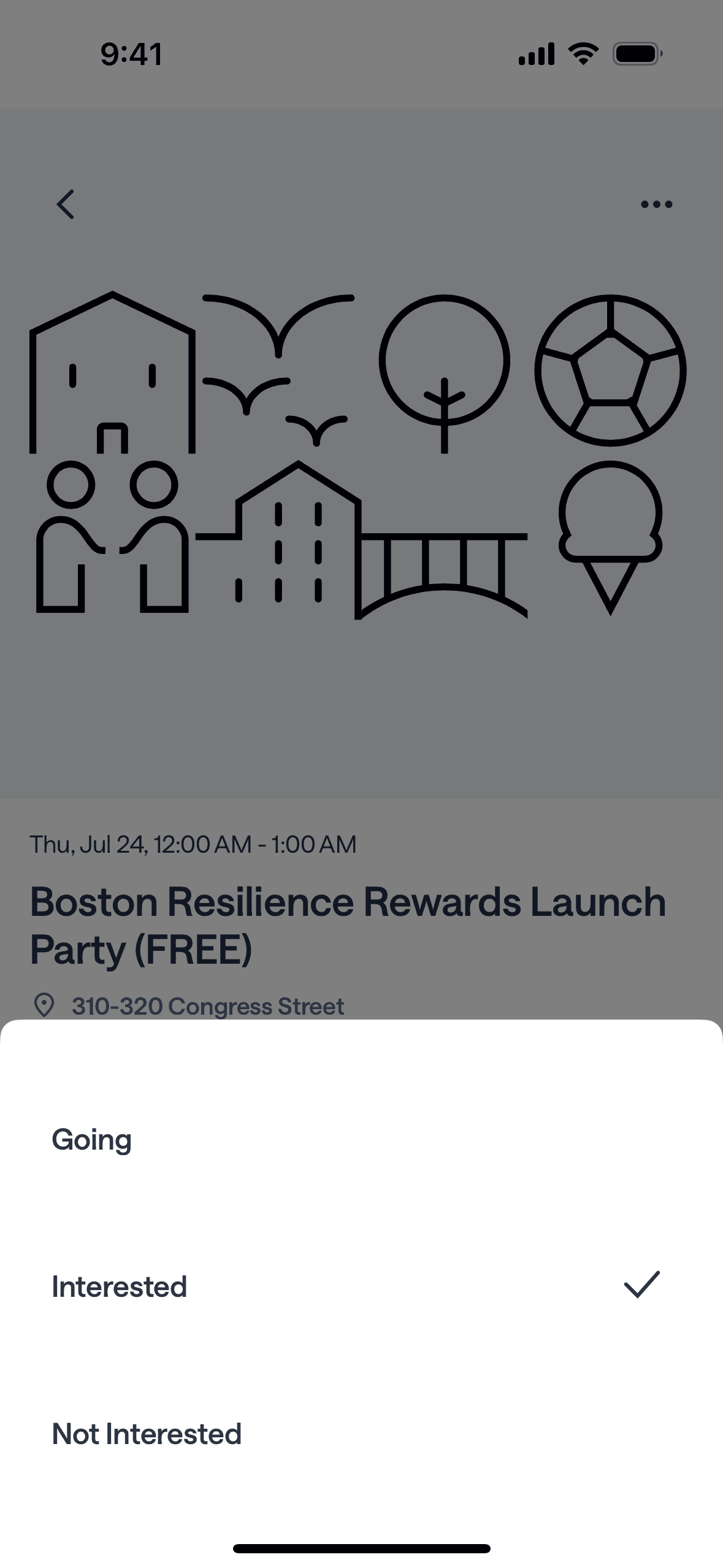 The user views an event and marks themselves as "Going". They interact with a button and select "Going" from a modal.