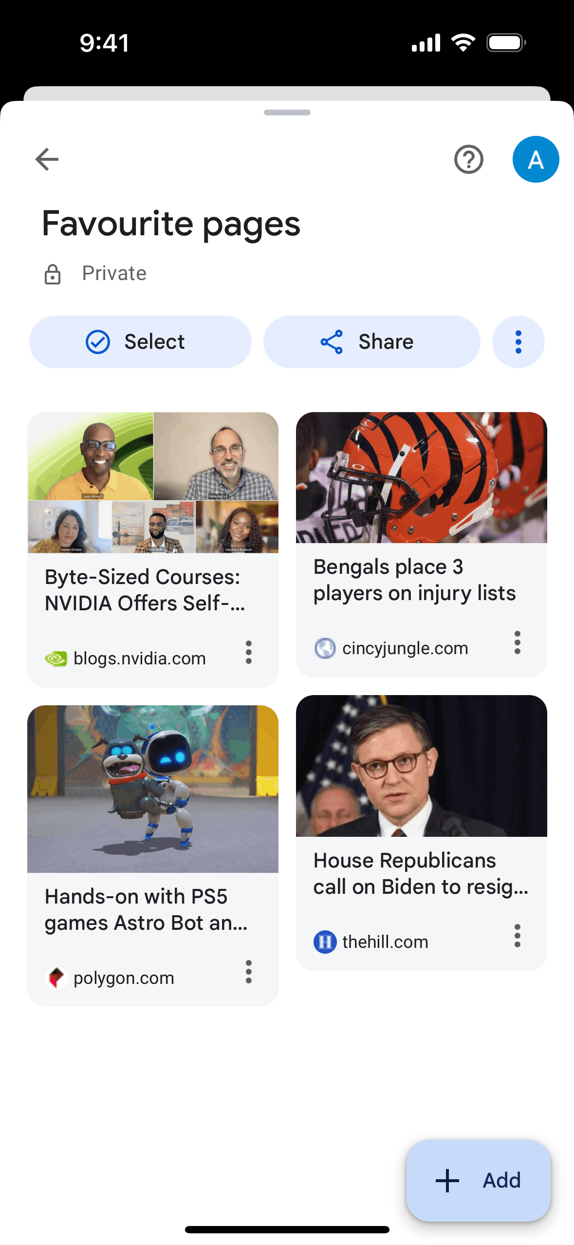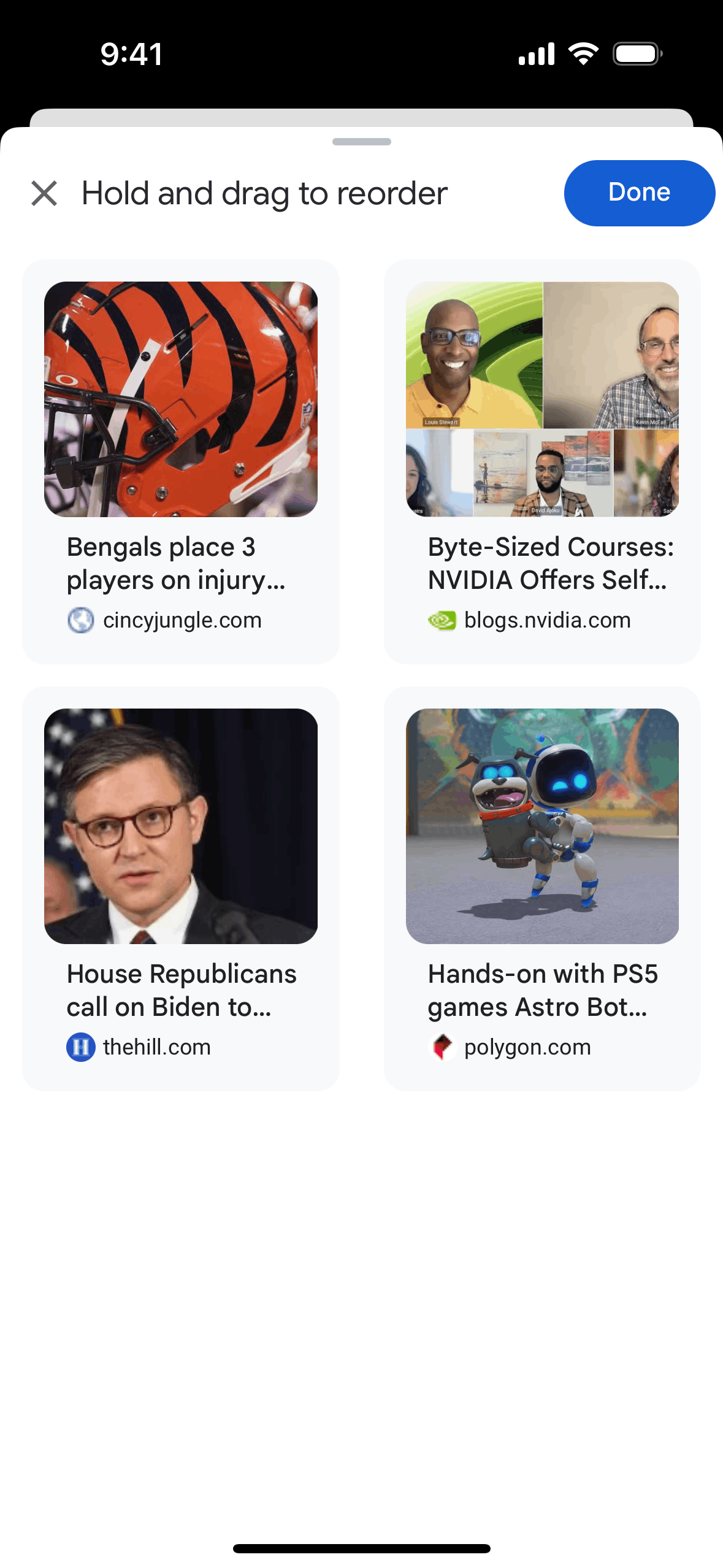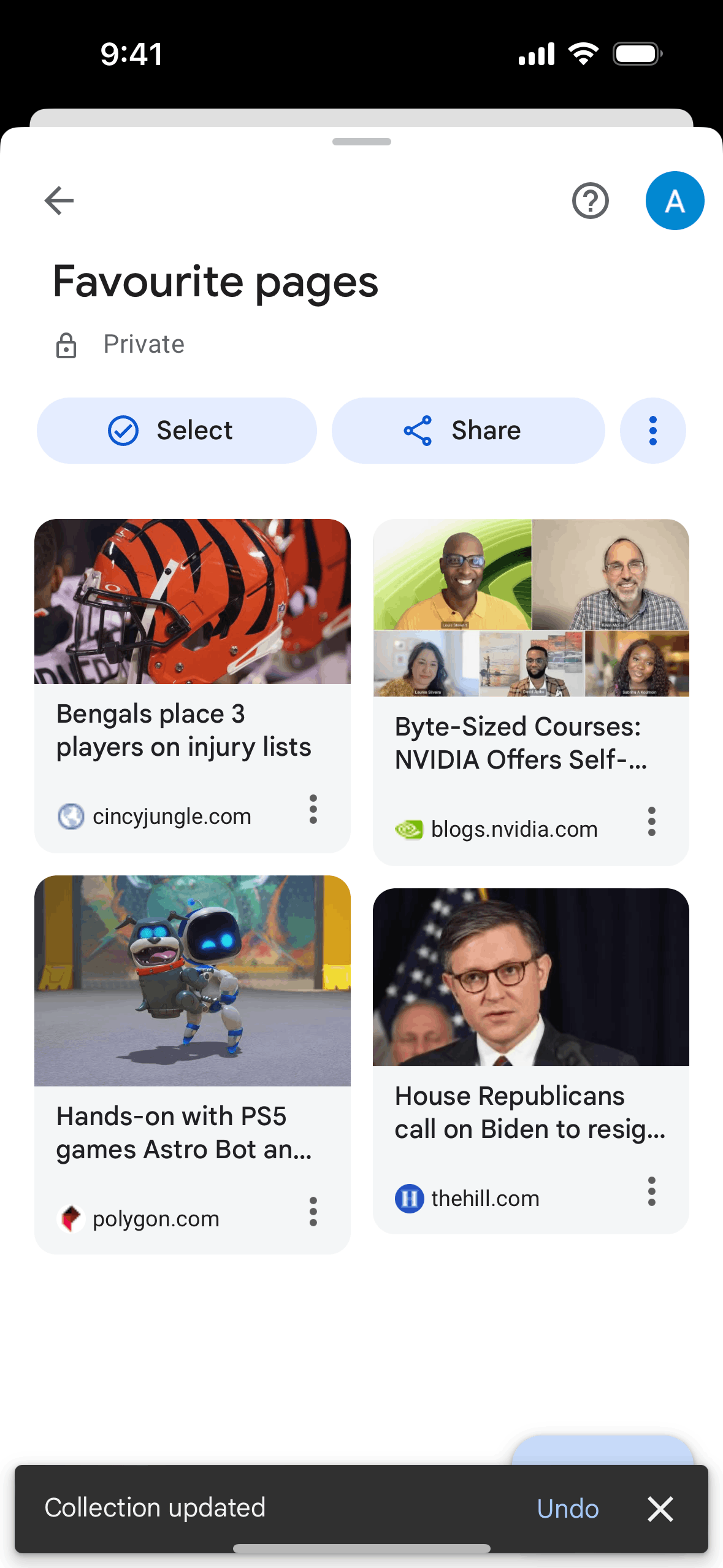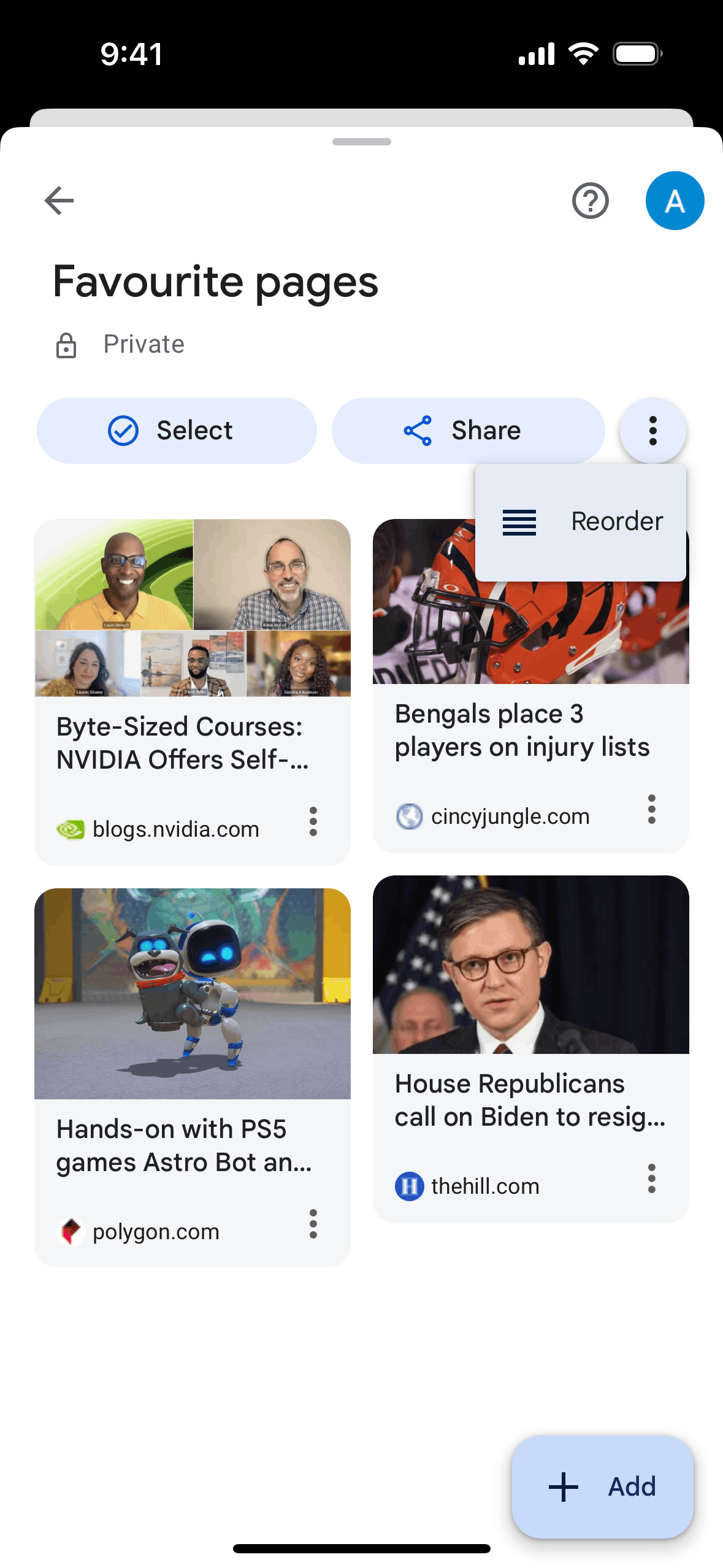 The user reorders their favourite pages by dragging and dropping them into a new order. The updated collection is then displayed with a confirmation message.