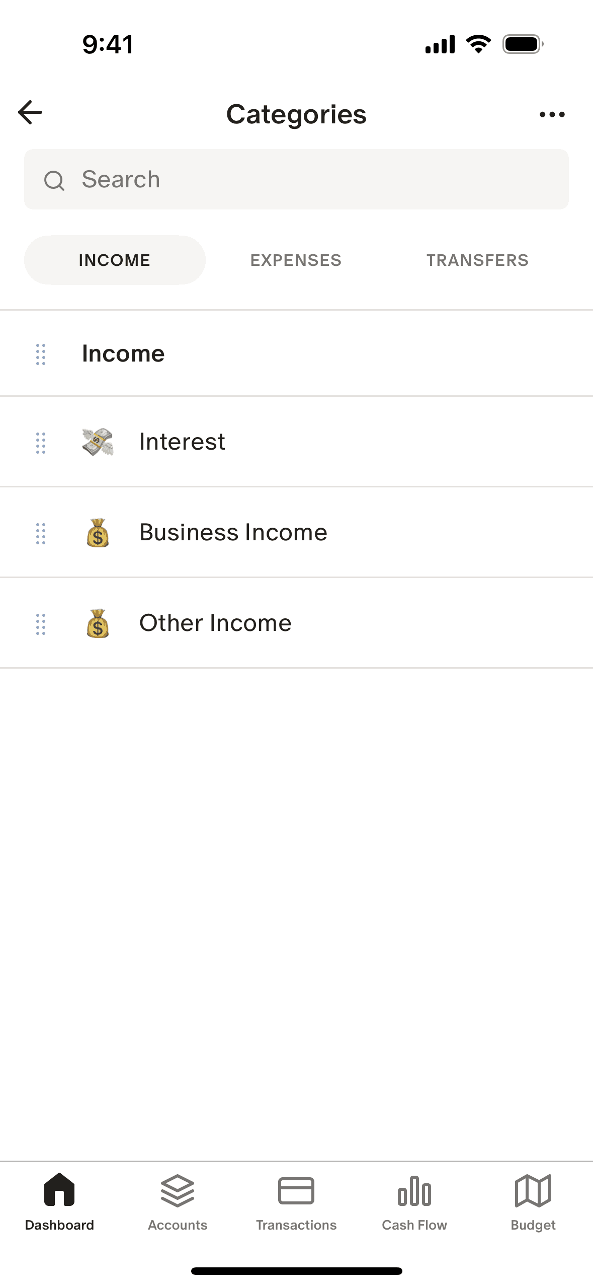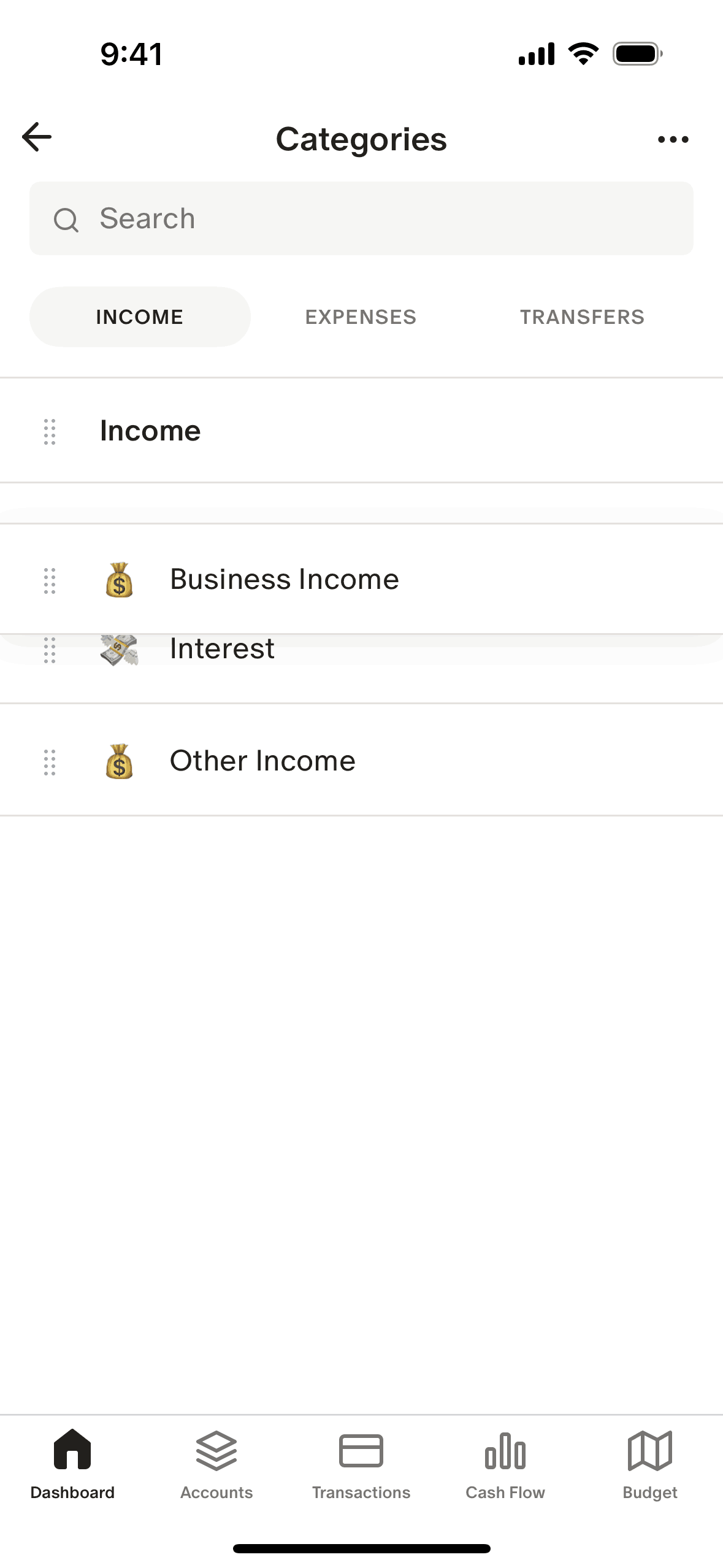 The user reorders a list of income categories. The new order is then confirmed on the screen.