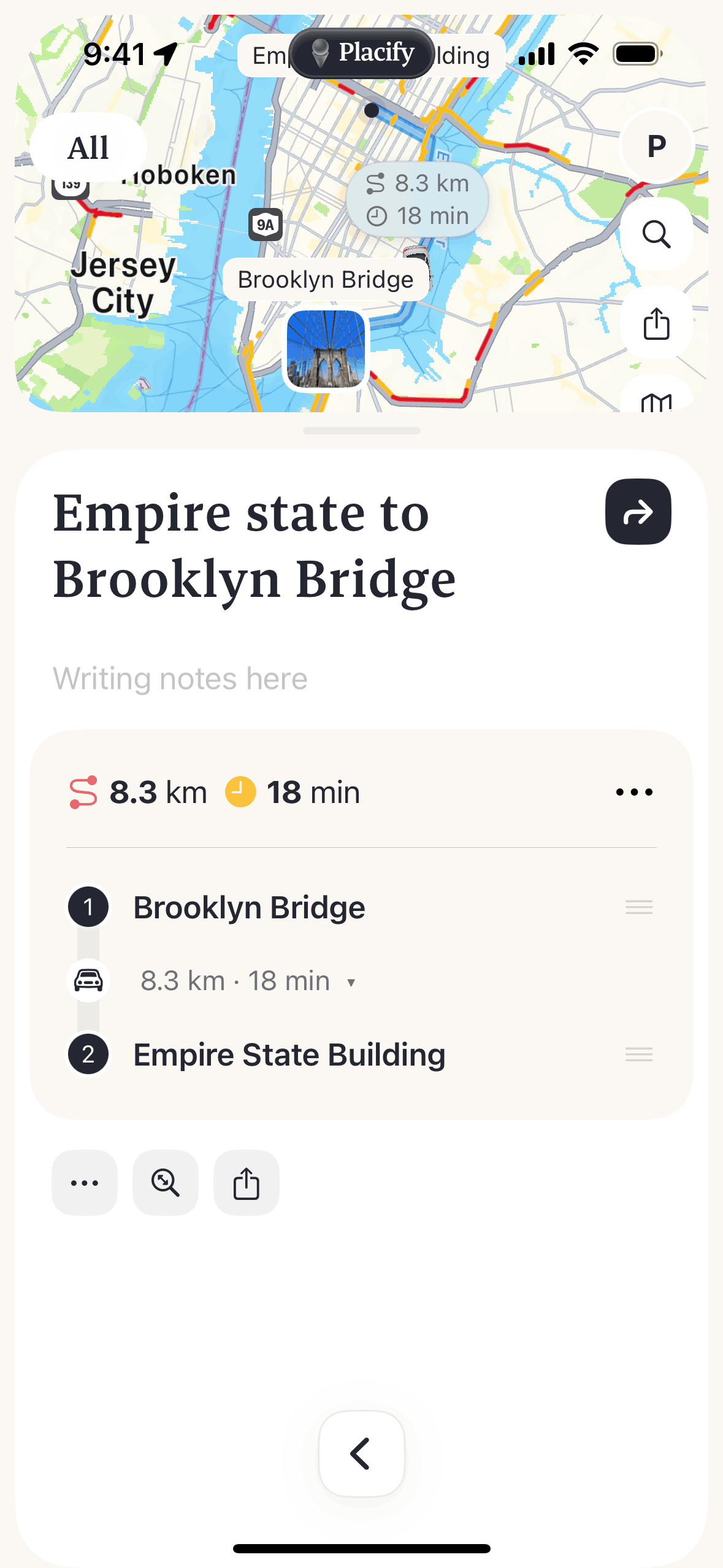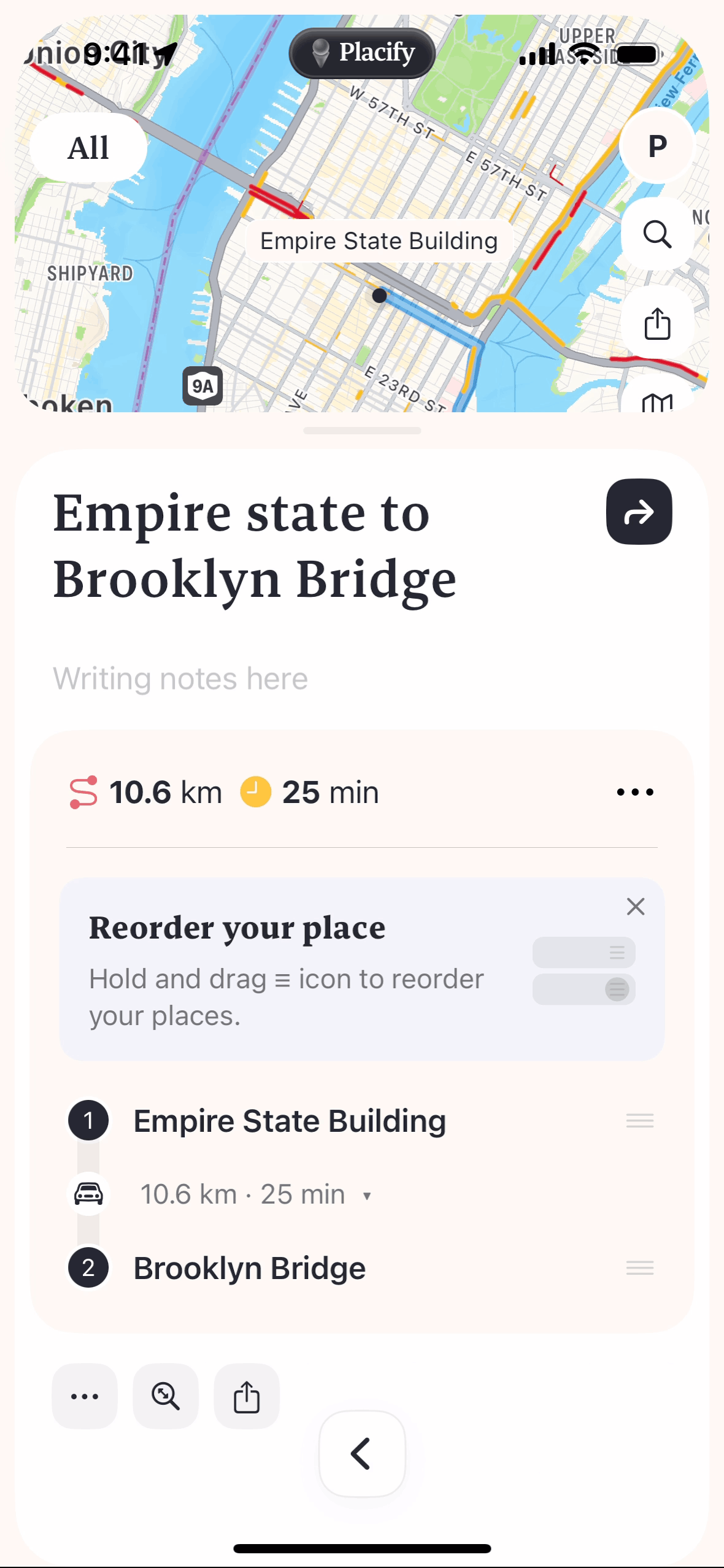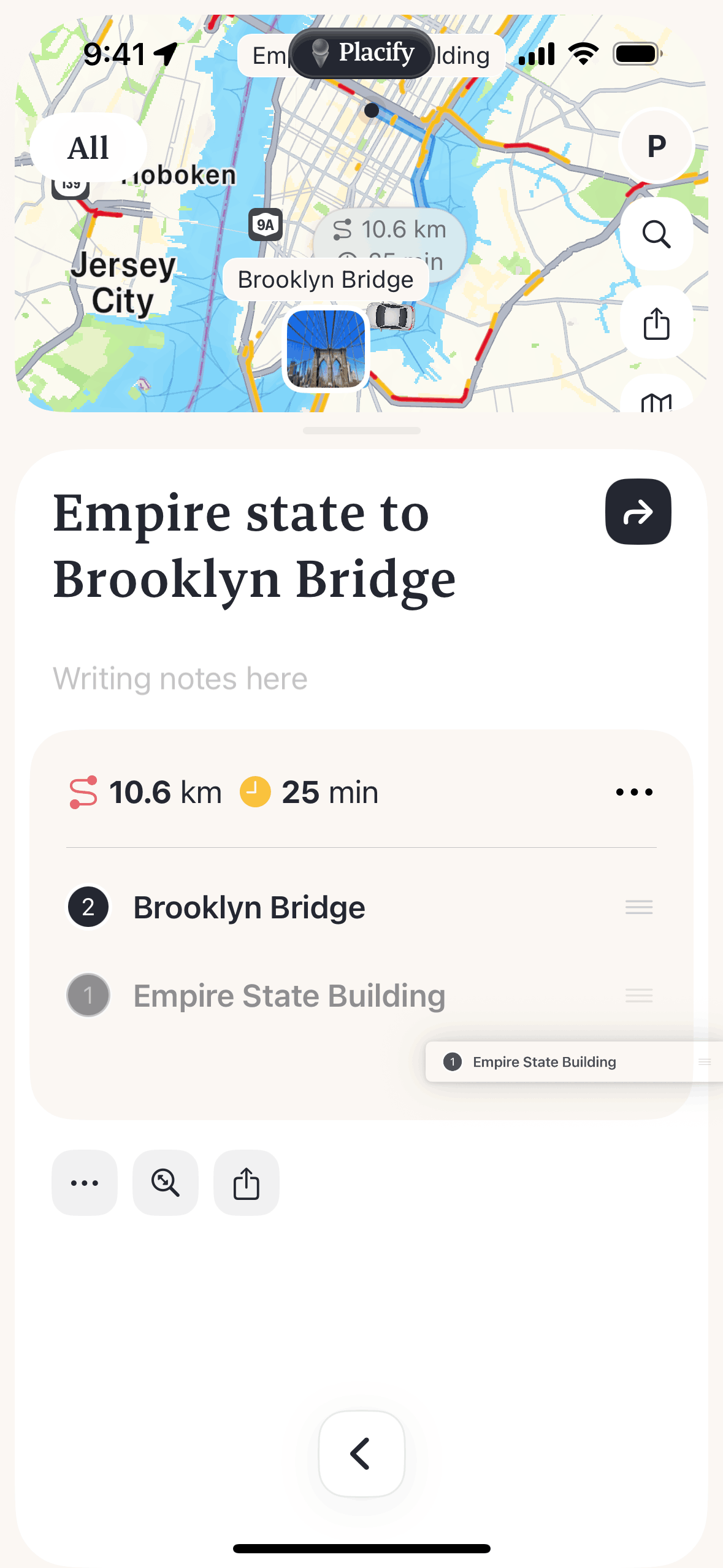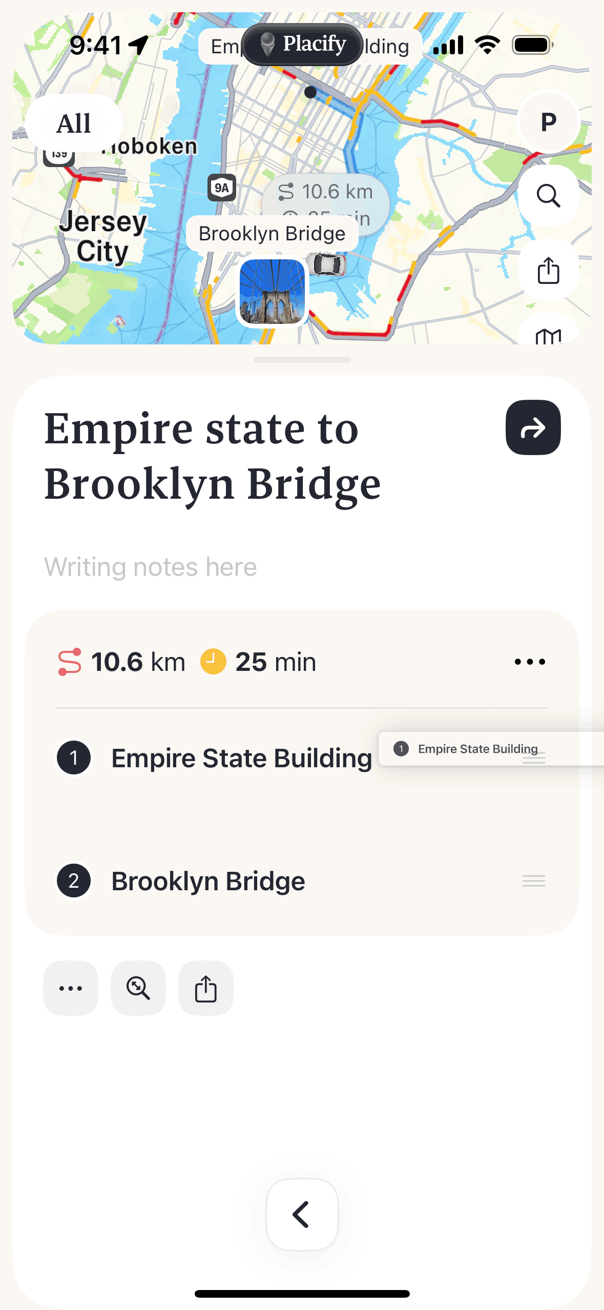 The user reorders a route by dragging and dropping locations. The app then replans and displays the updated route.