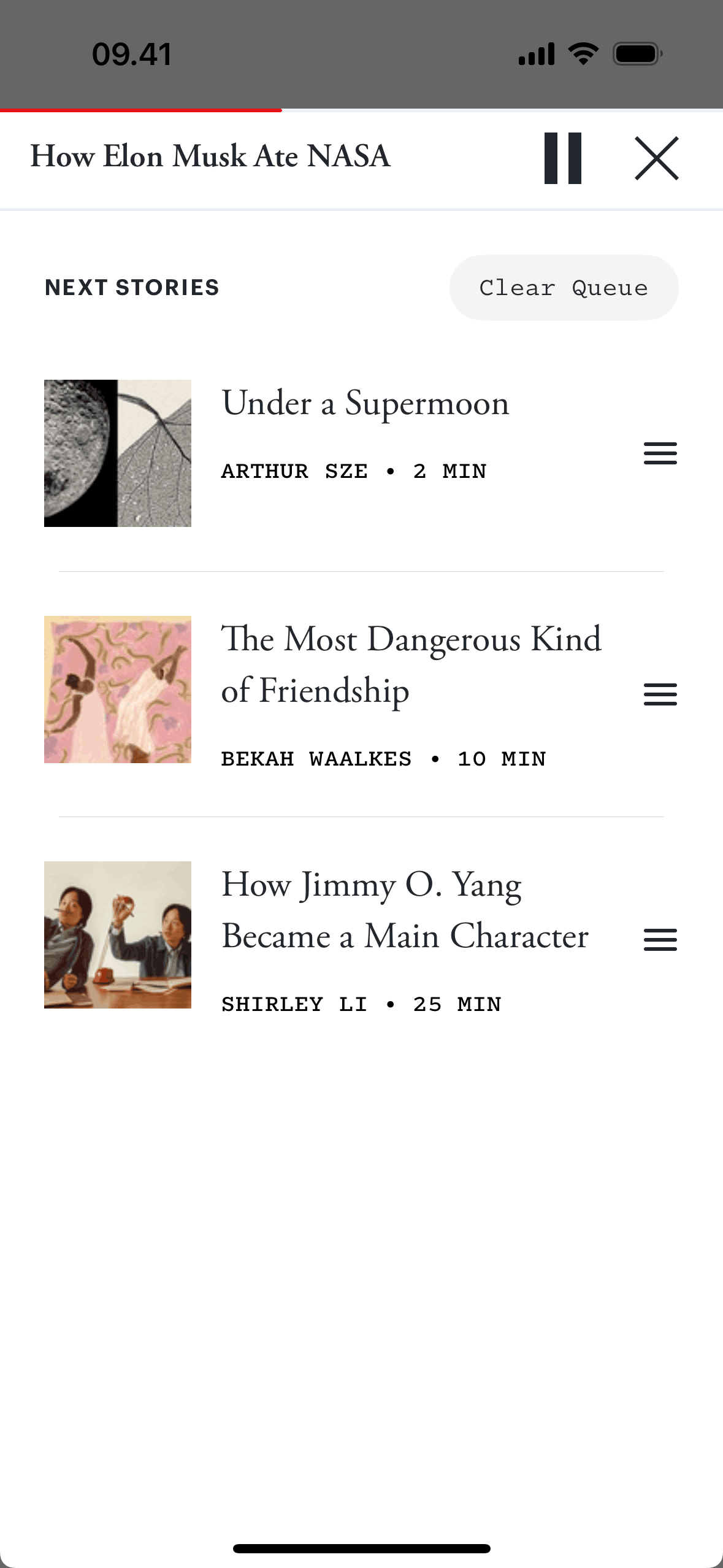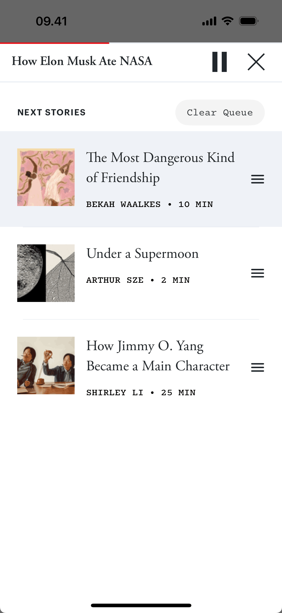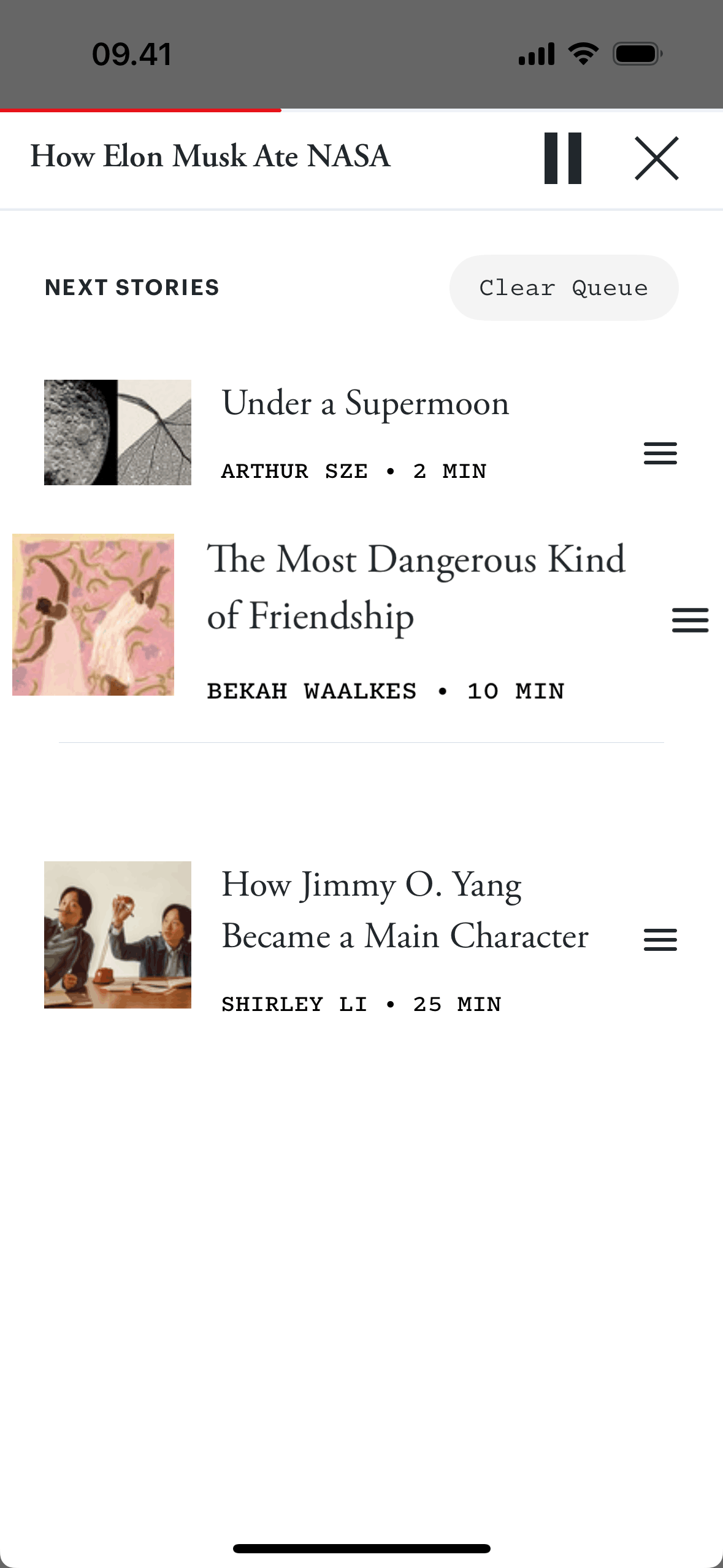 The user views and reorders a list of stories in a queue. The story order is changed to customize the playback sequence.