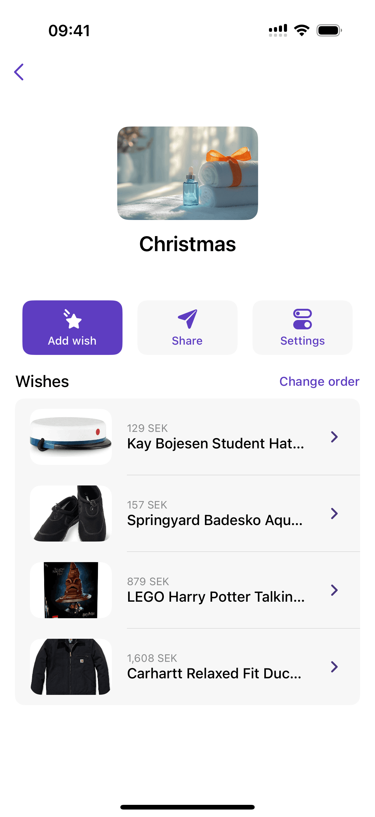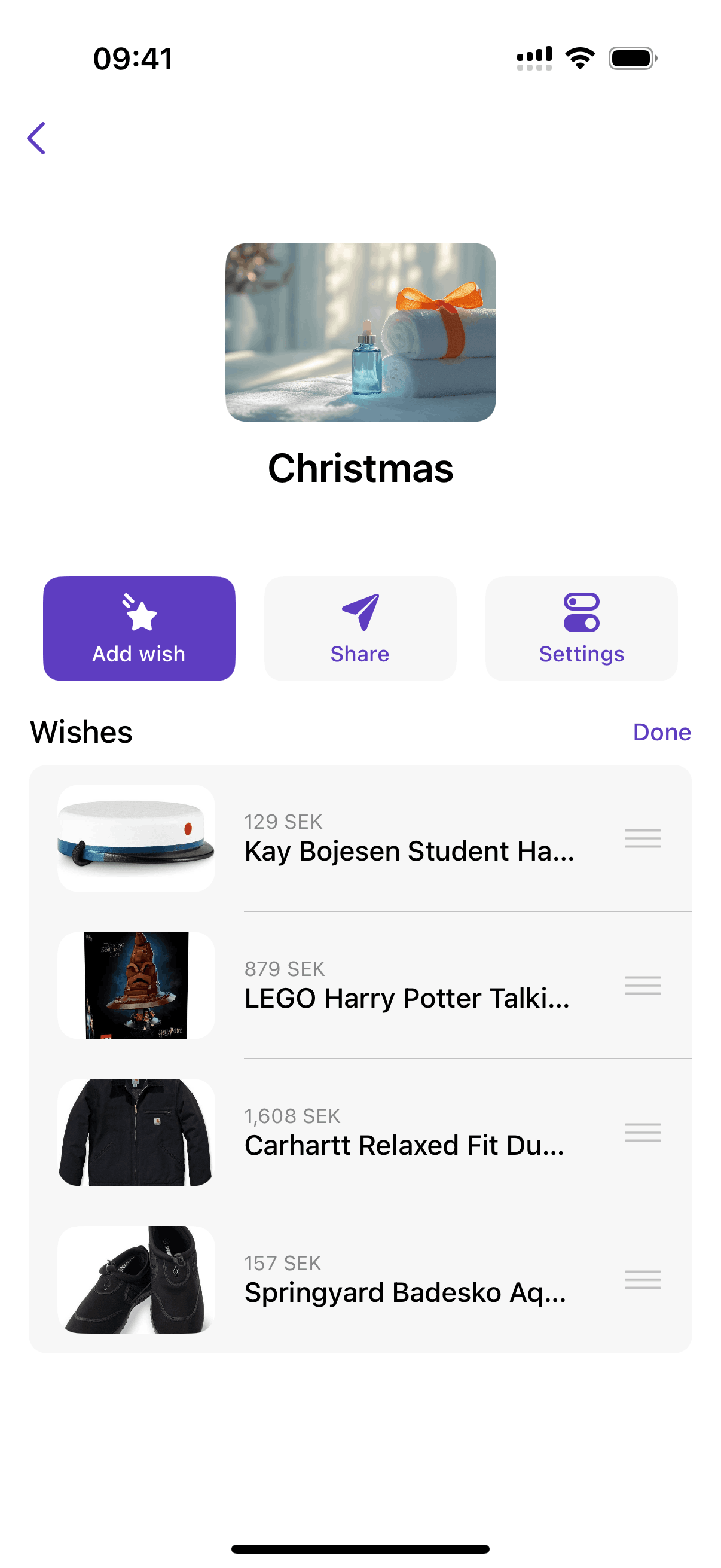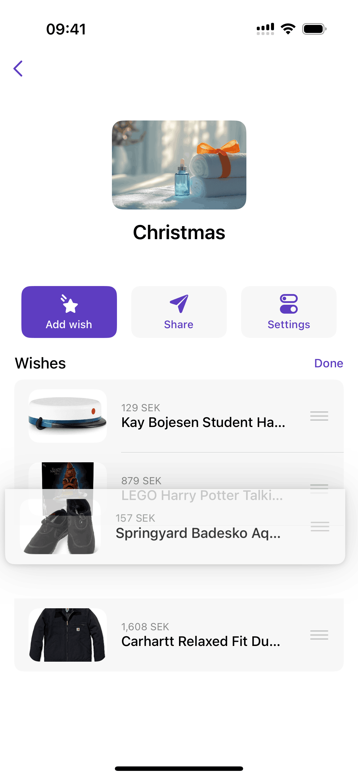 The user reorders items in a wish list by entering reorder mode, dragging an item, and then saving the new order.