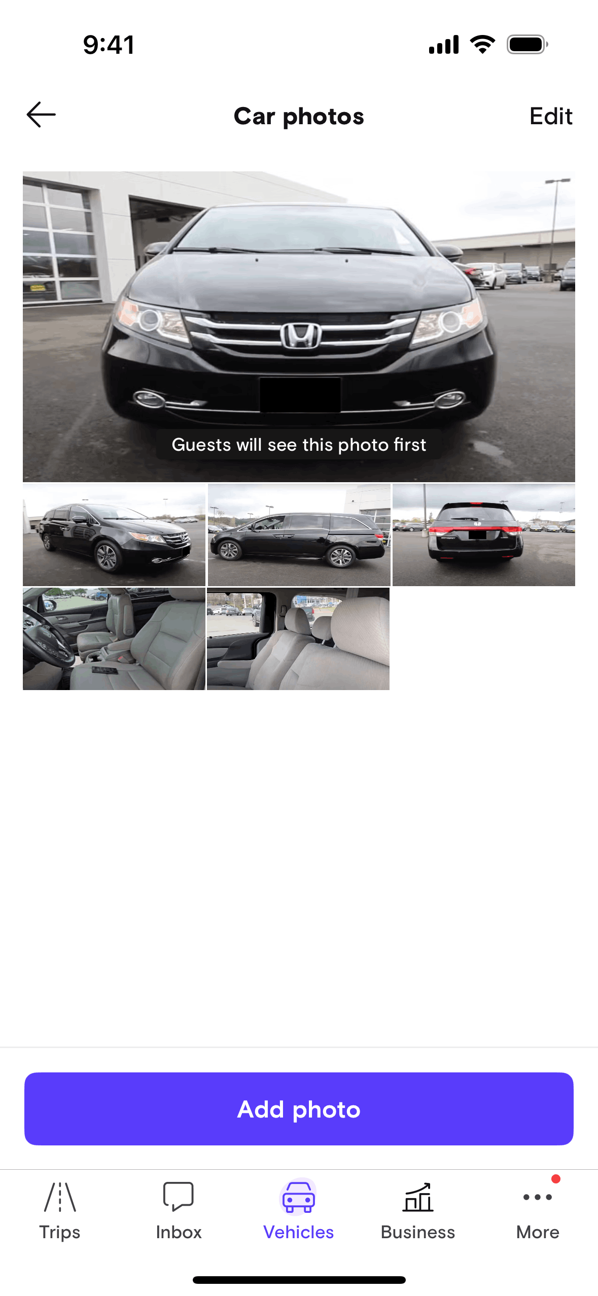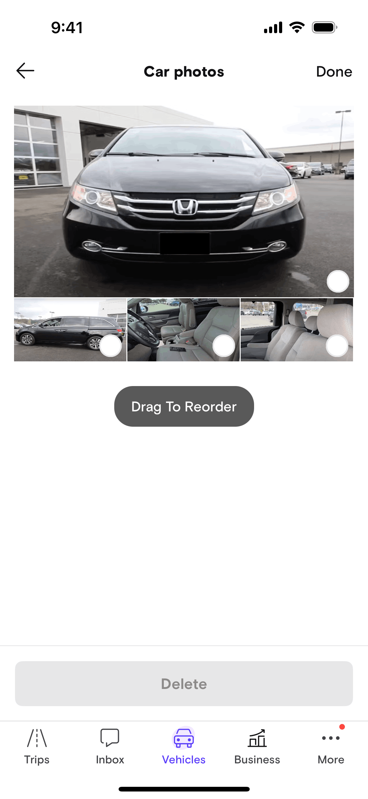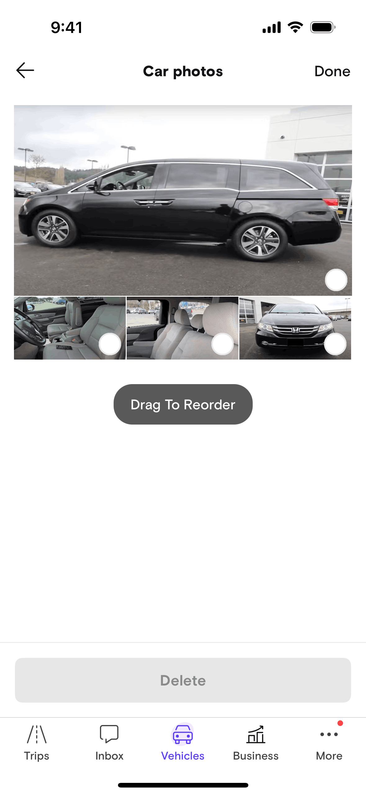 The user reorders car photos and then is given the option to add more photos. The flow showcases the reordering and subsequent addition of car photos.