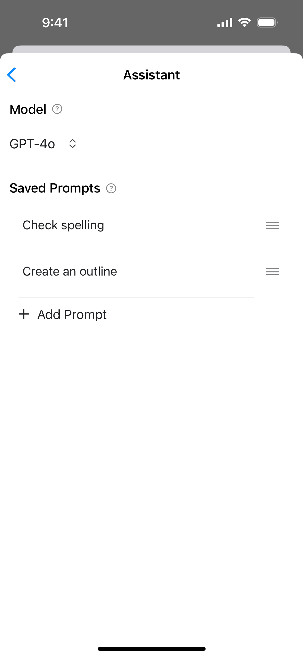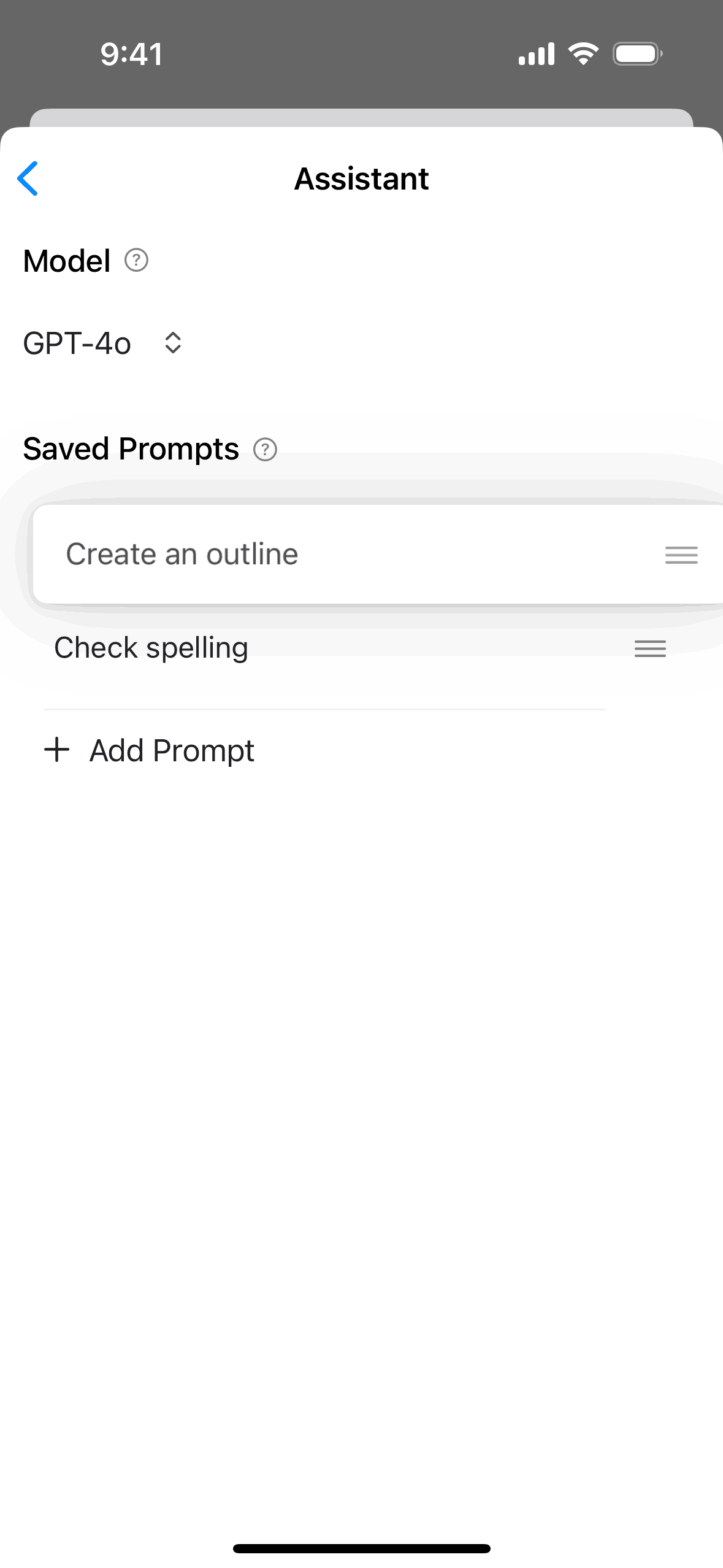 The user navigates to the assistant settings and reorders the saved prompts. The "Create an outline" prompt is moved to the top of the list.