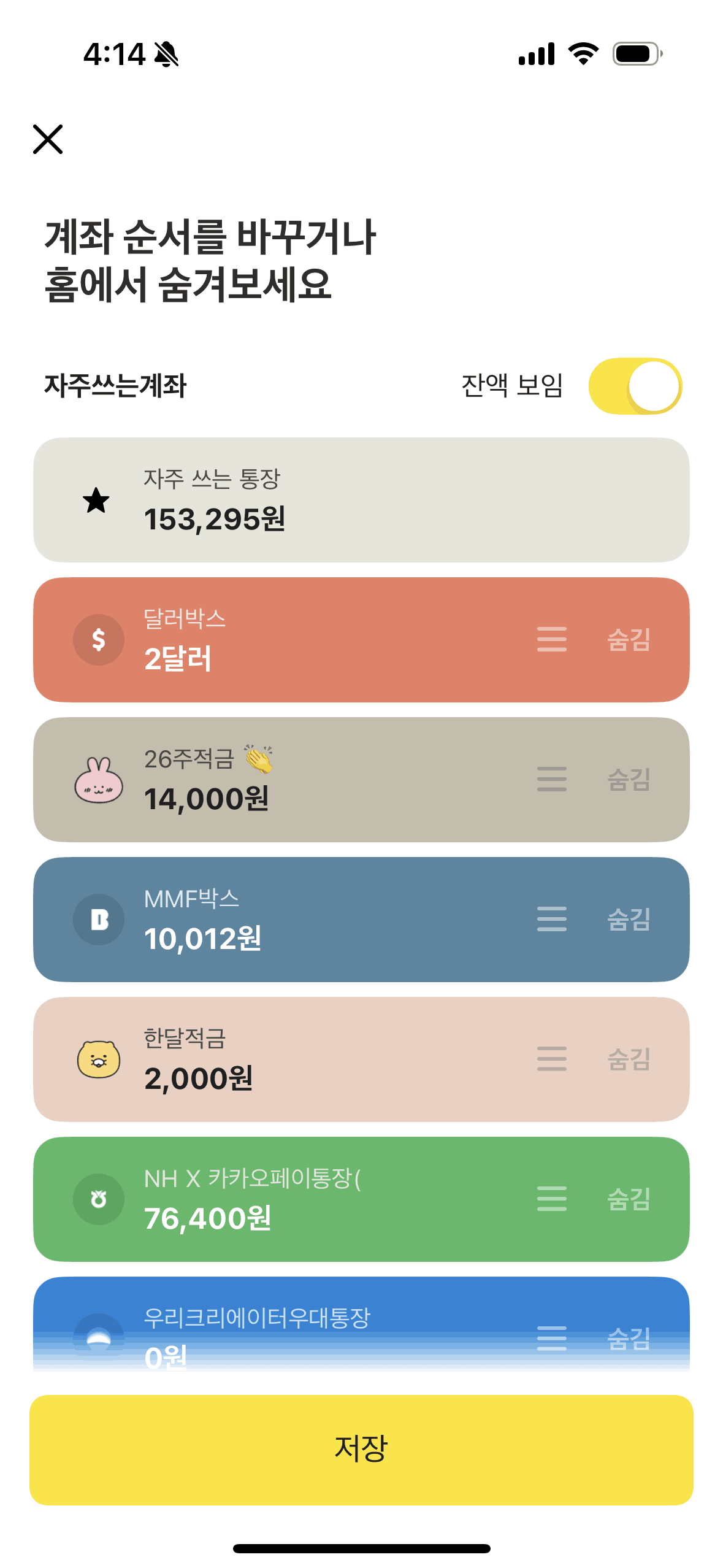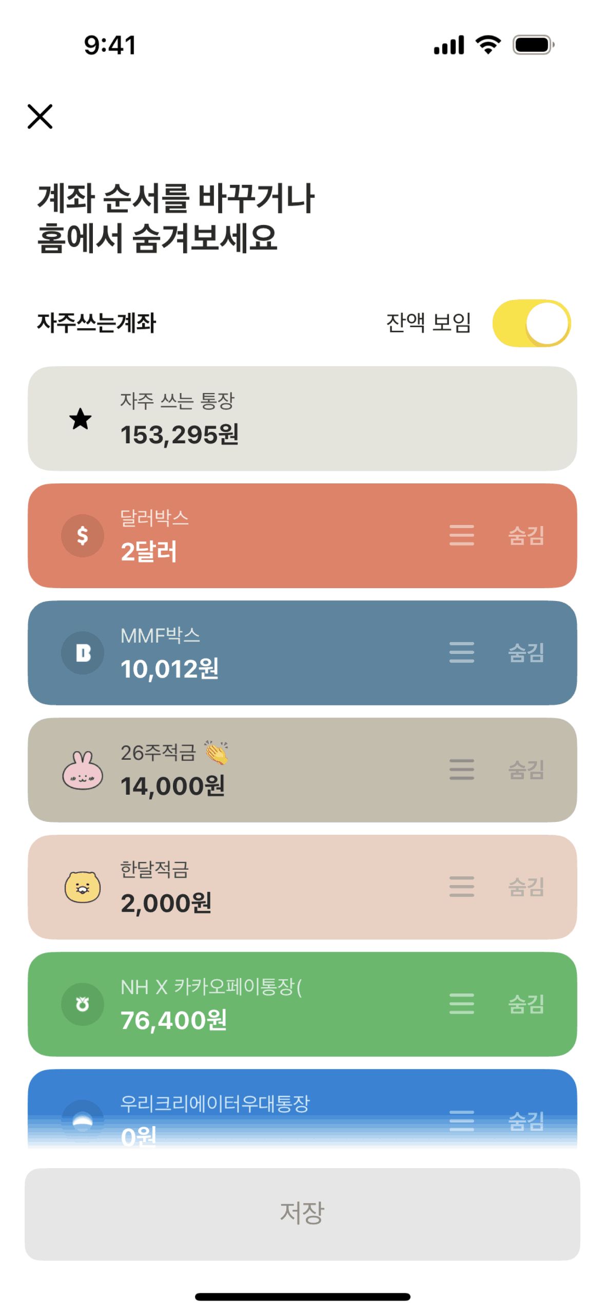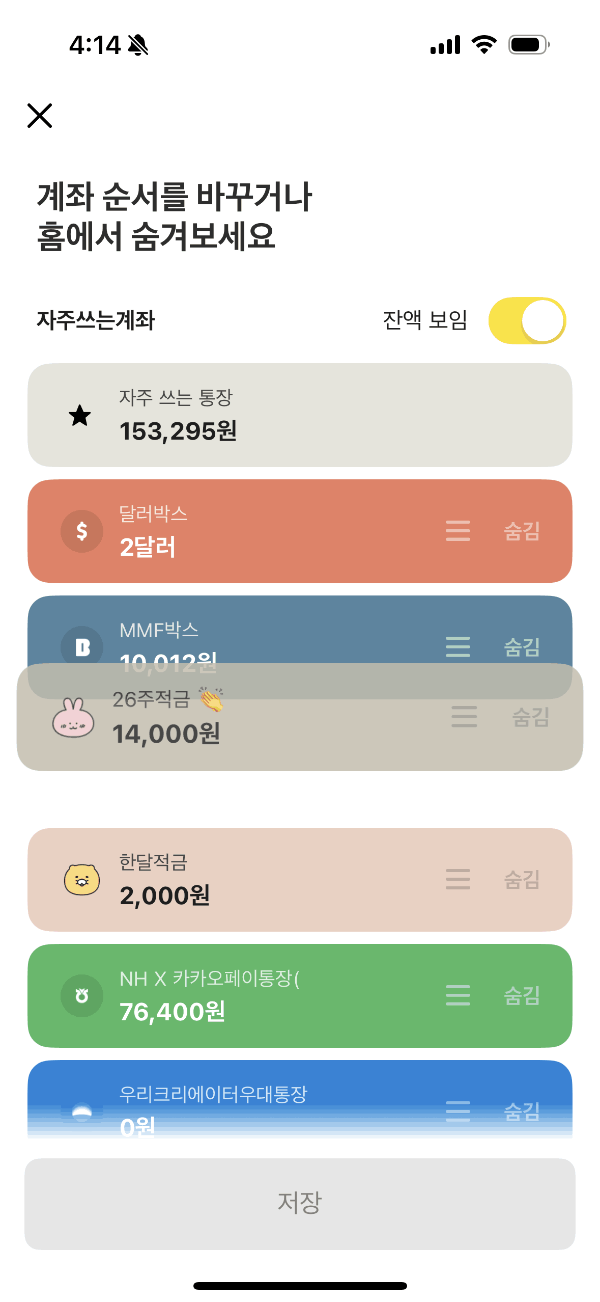 The user reorders their accounts in the banking app. They navigate to the reordering screen, drag and drop accounts, and then save the new order.