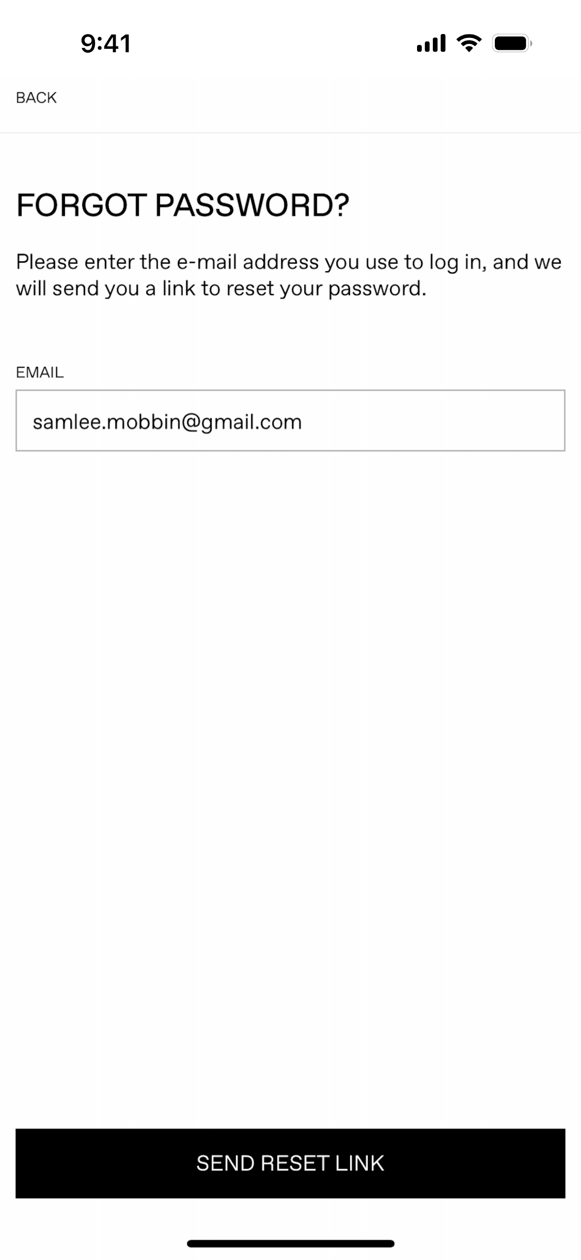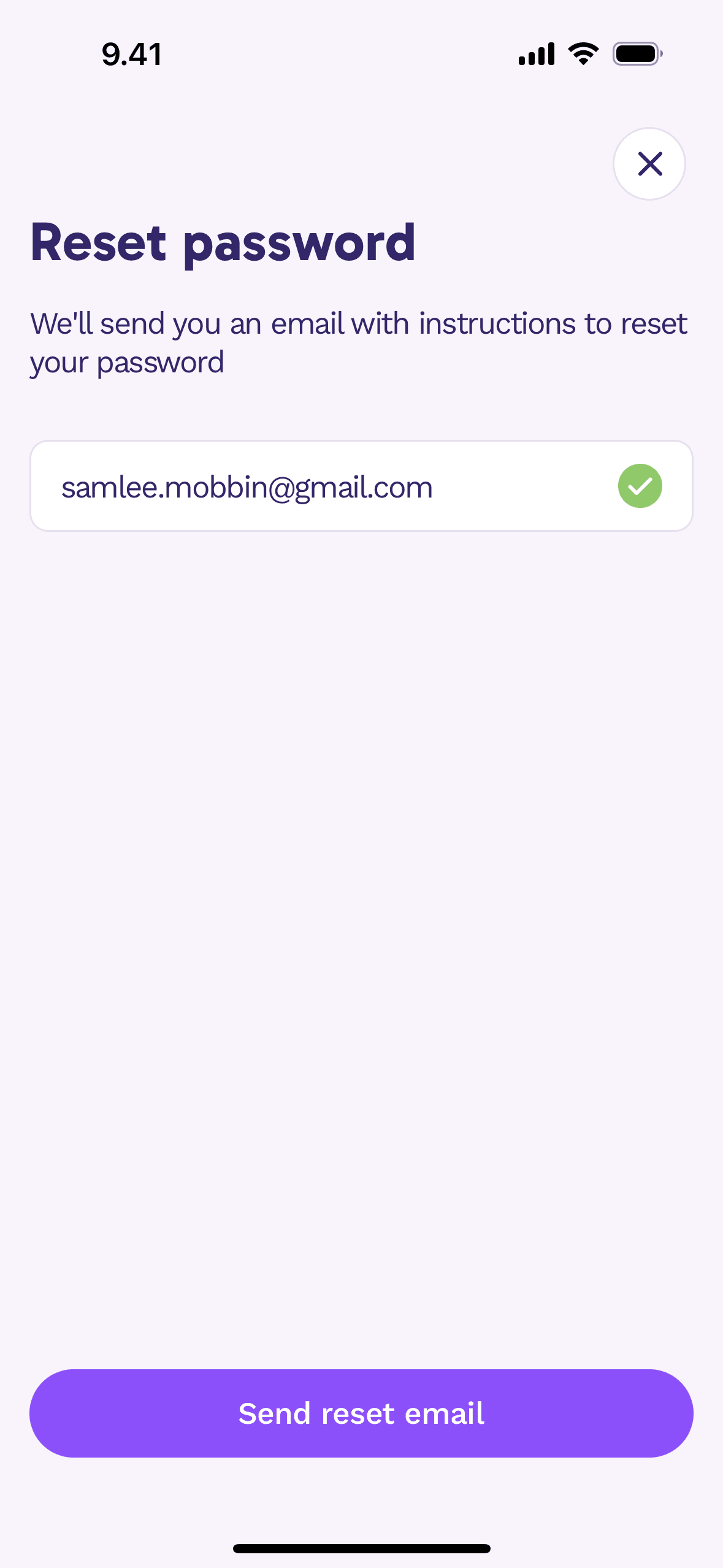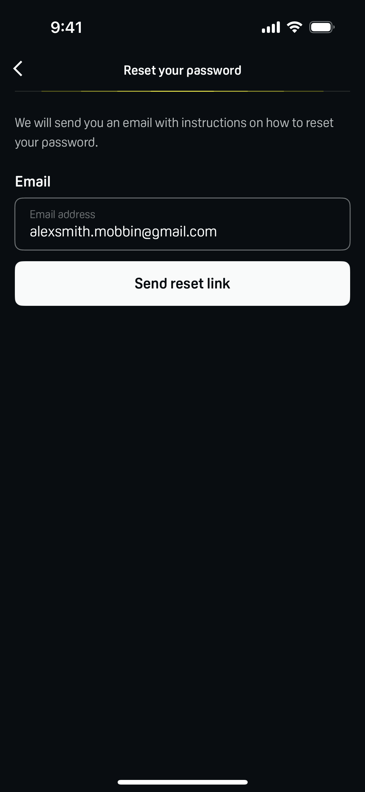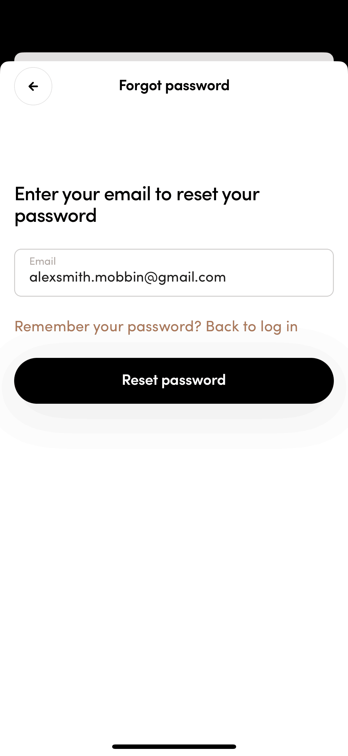 The user initiates a password reset flow from the login screen, enters their email, and receives a confirmation that a reset link has been sent.