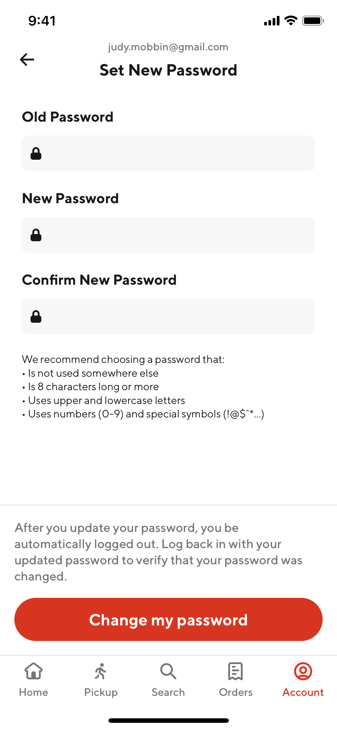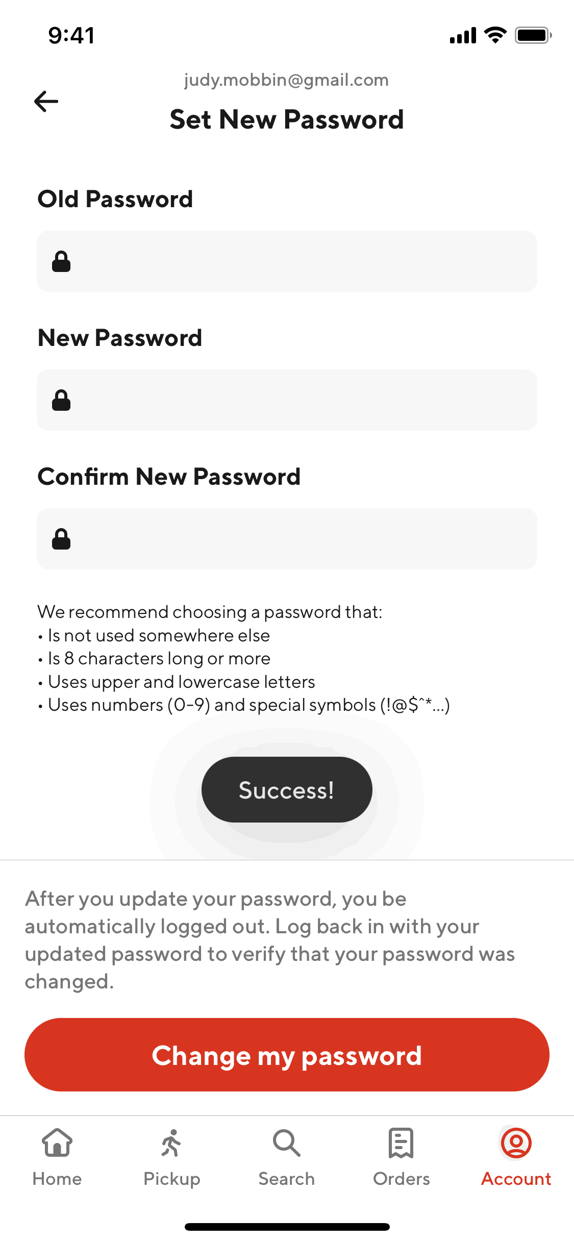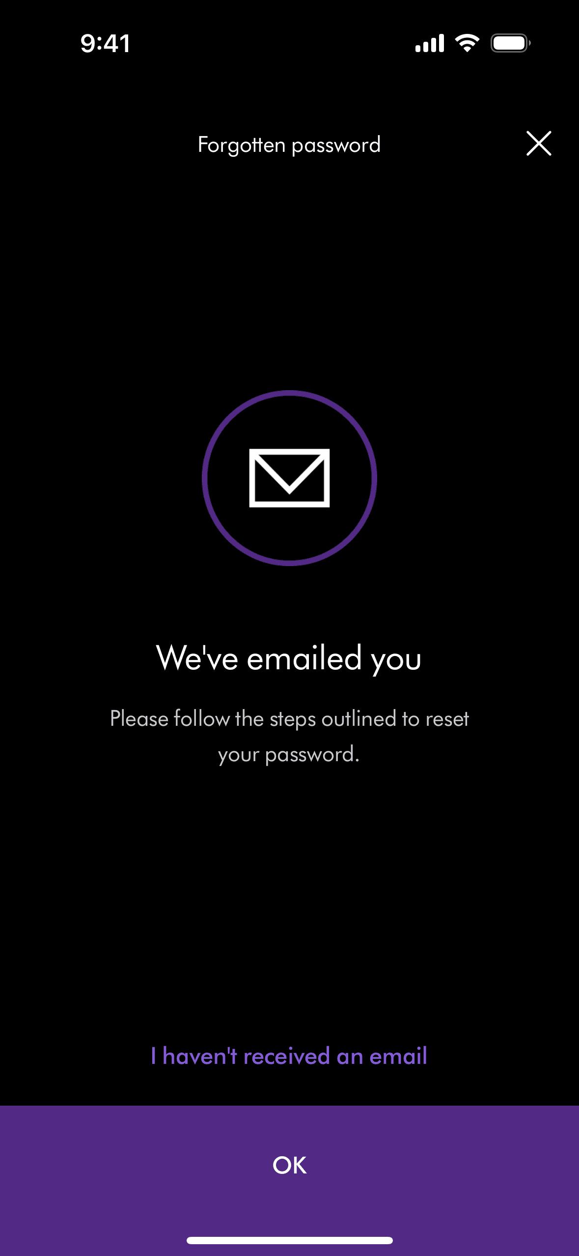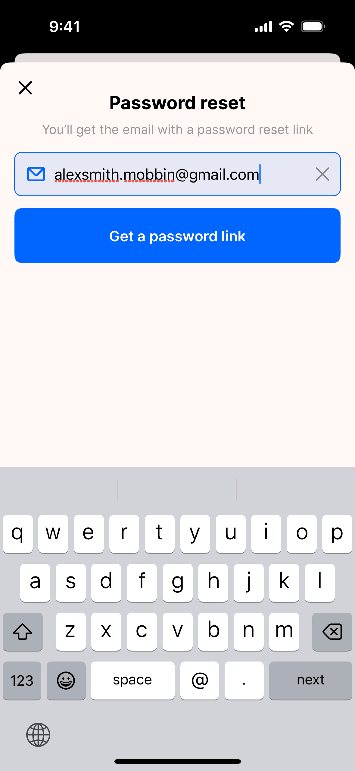 The user initiates a password reset flow from the login screen, enters their email, and receives a confirmation that a reset link has been sent.