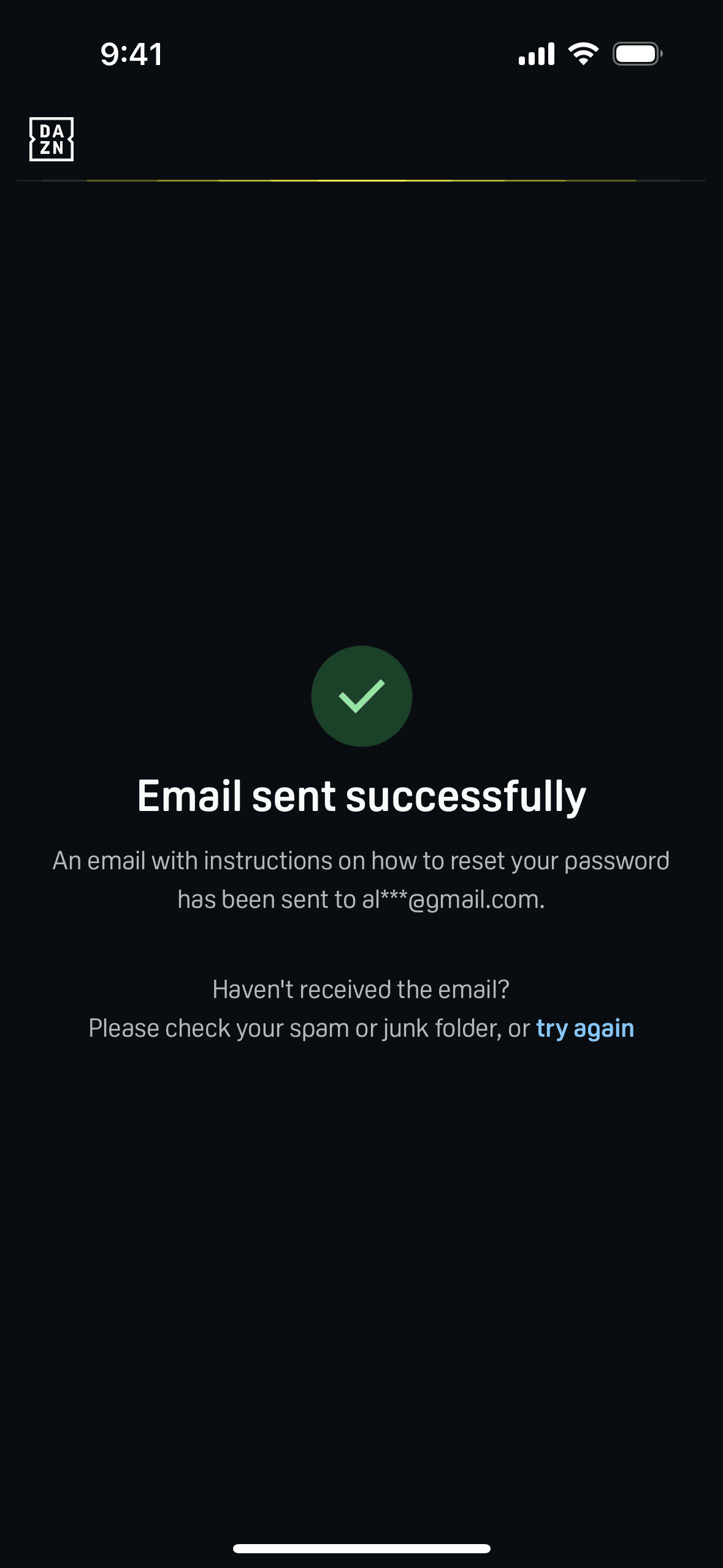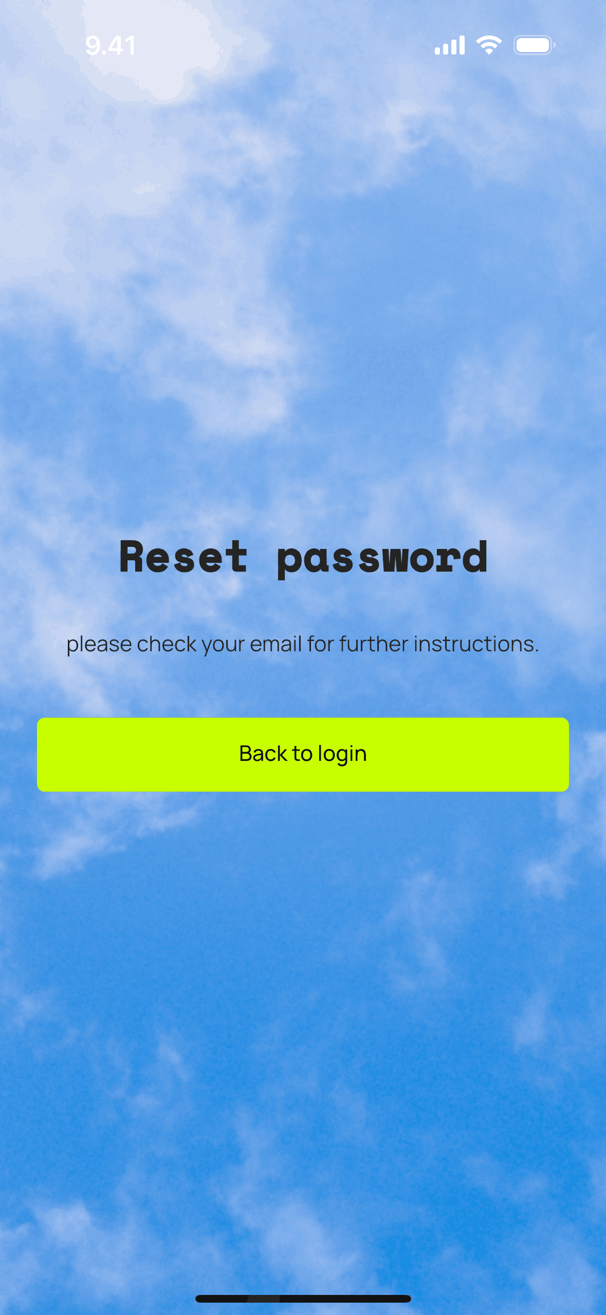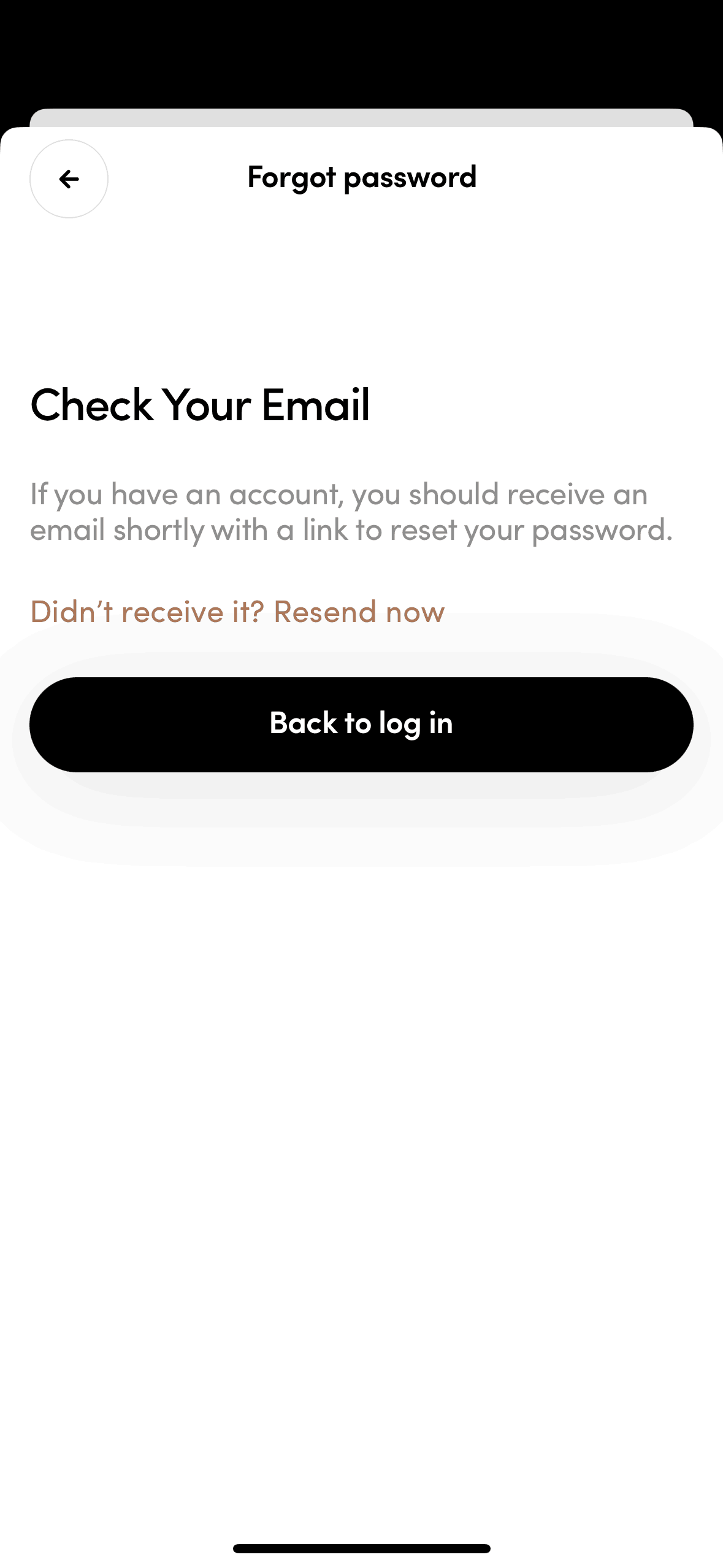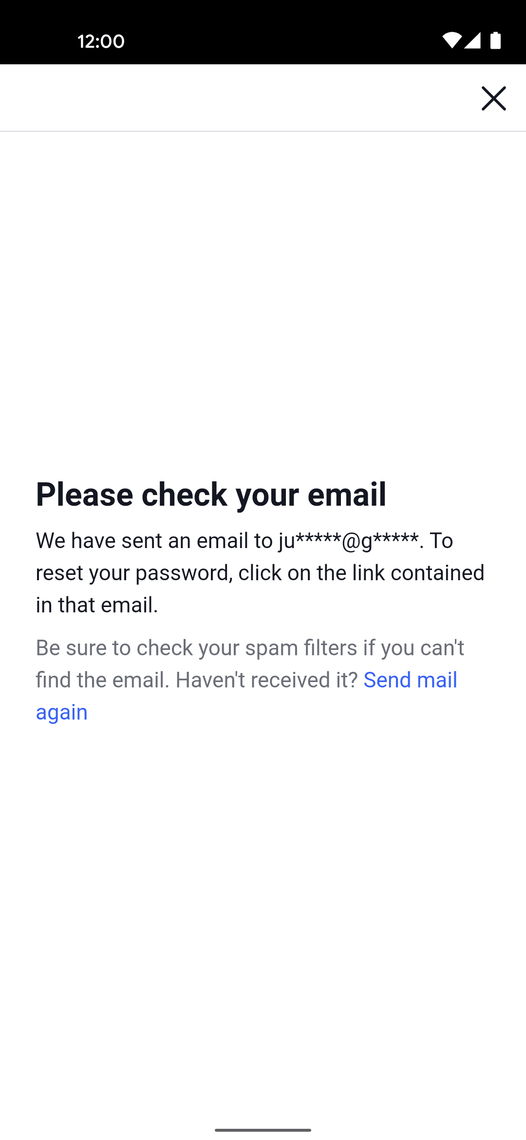 The user initiates a password reset flow from the login screen. A confirmation message appears after the reset link is sent.