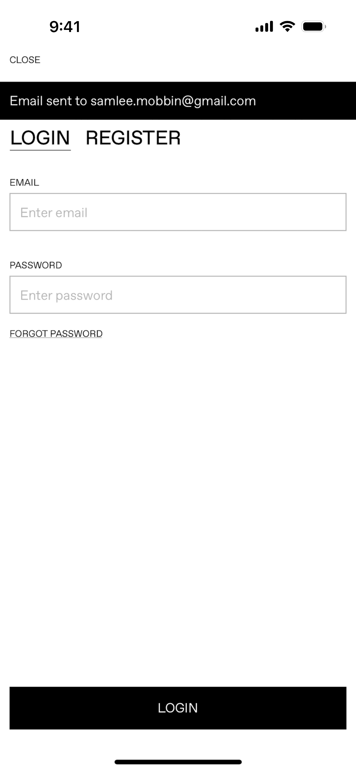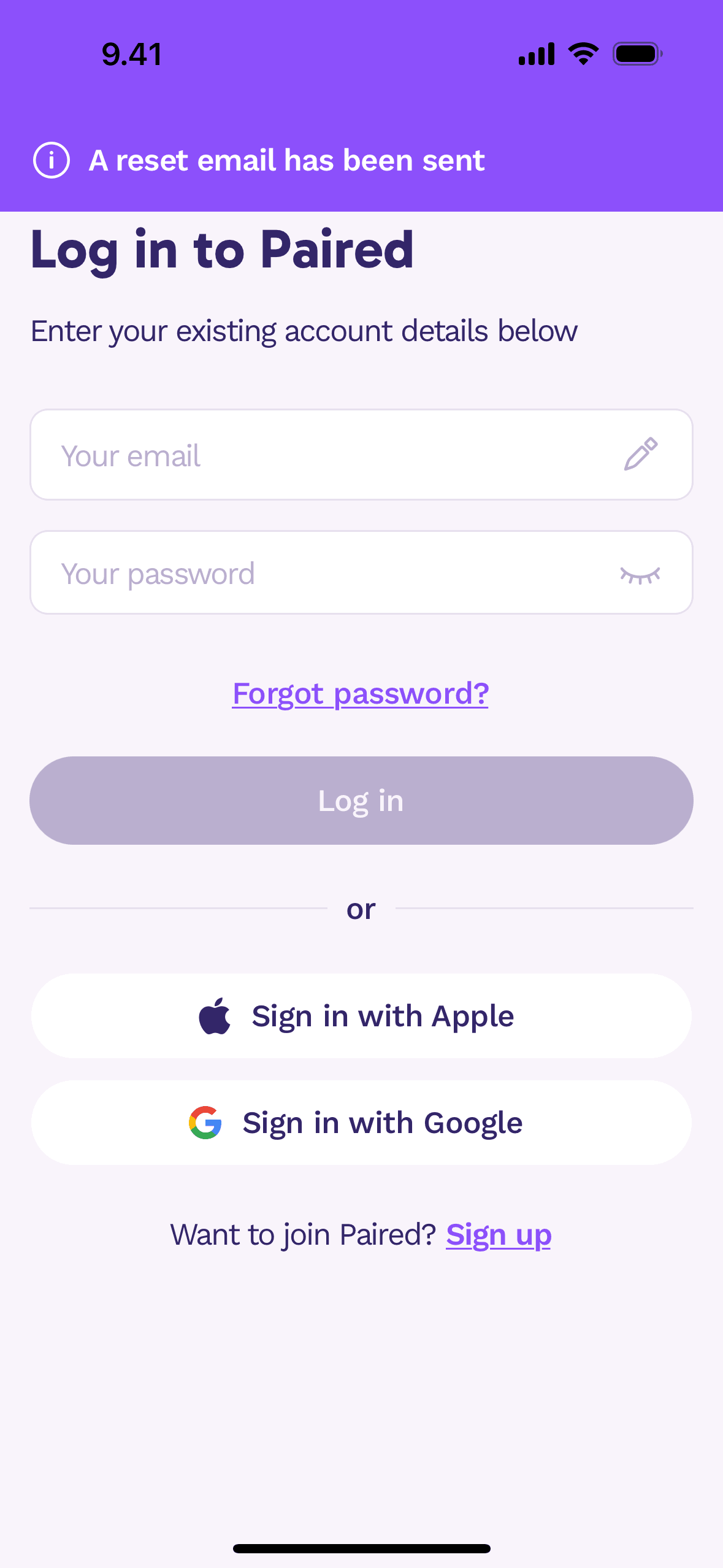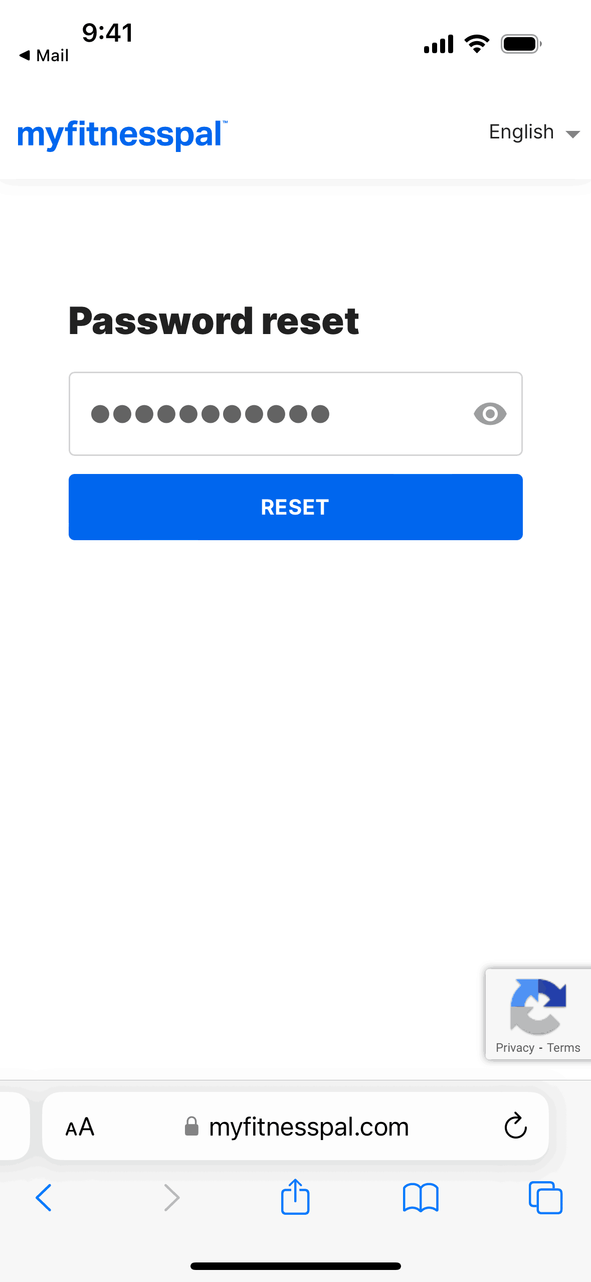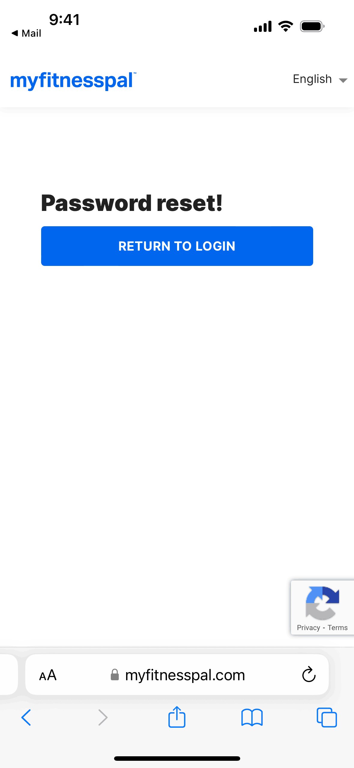 The user initiates a password reset flow from the login screen. A confirmation message appears after the reset link is sent.