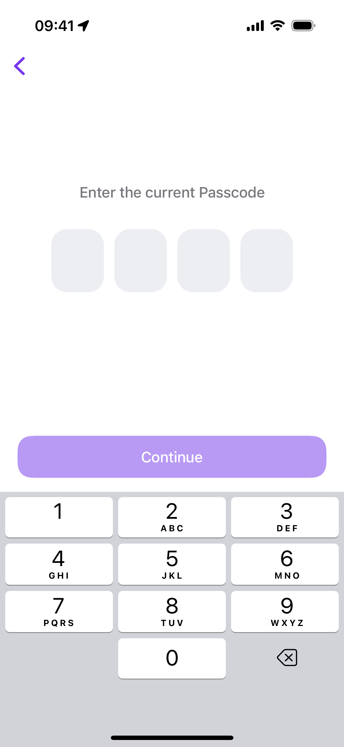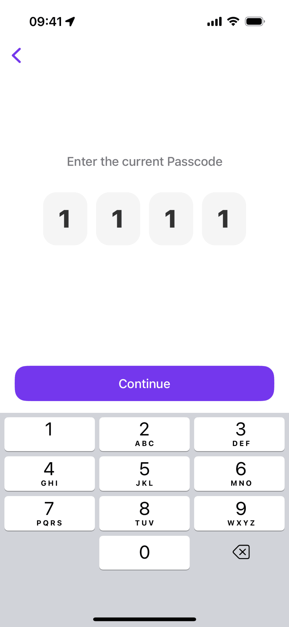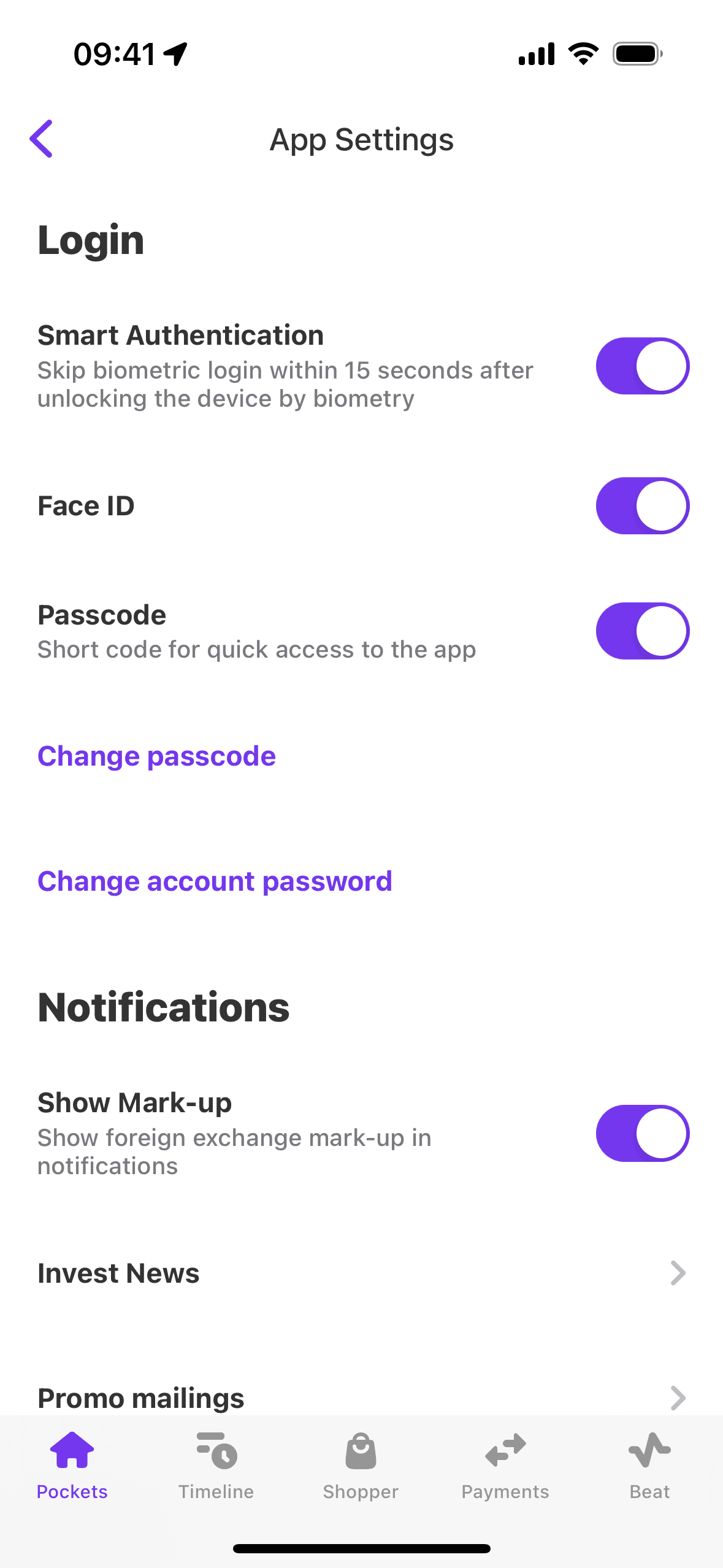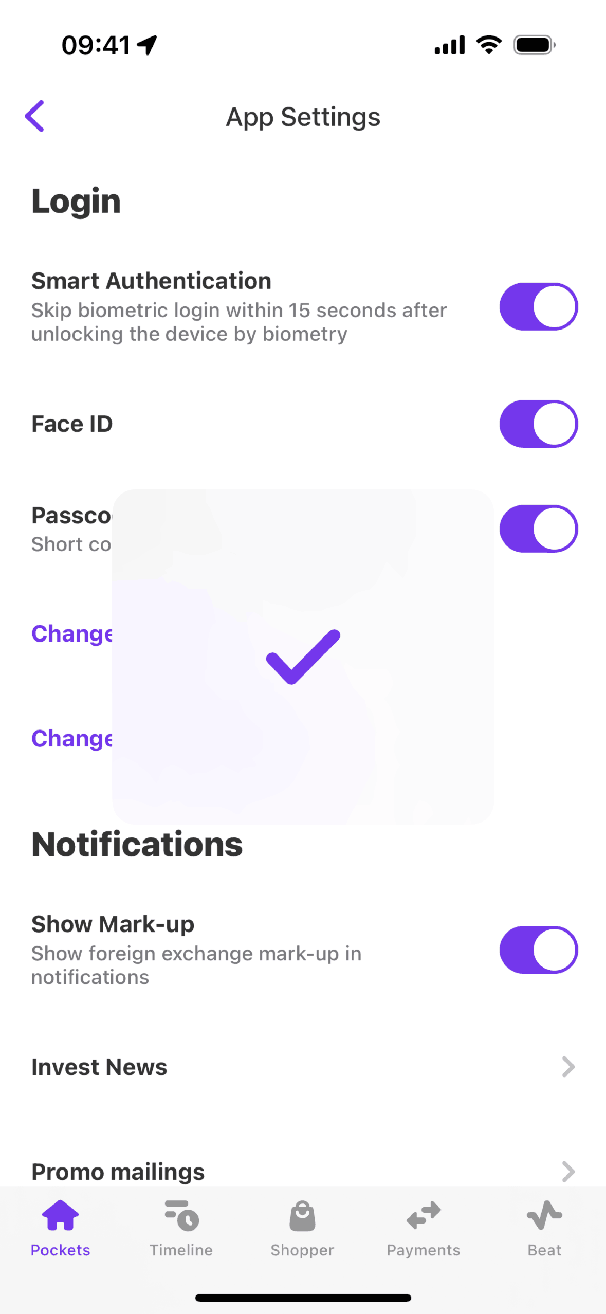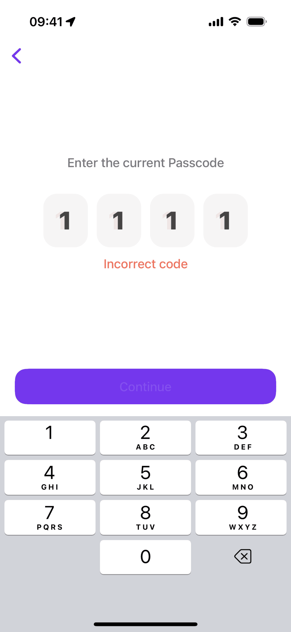 The user attempts to change their password, but enters an incorrect passcode. The flow ends by returning to the app settings with a success indicator.