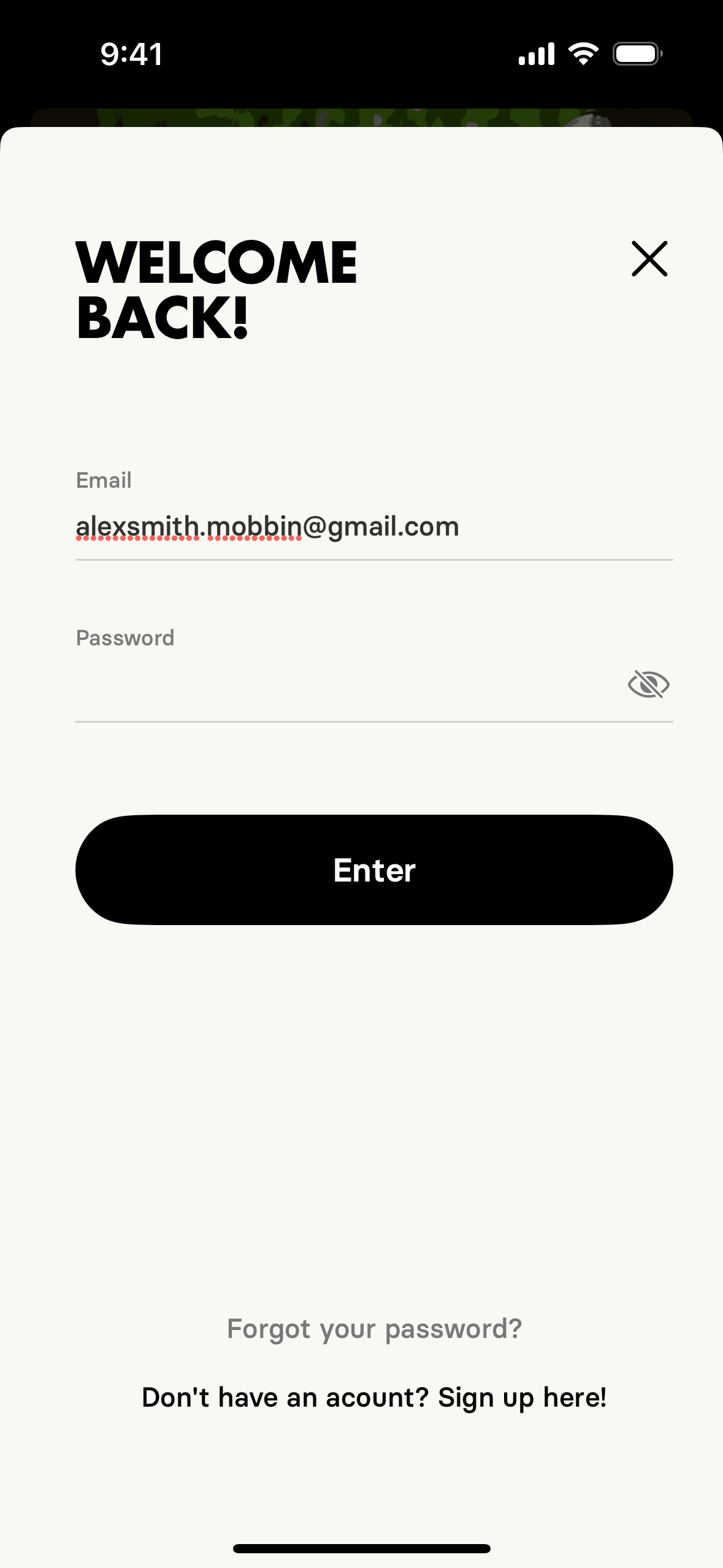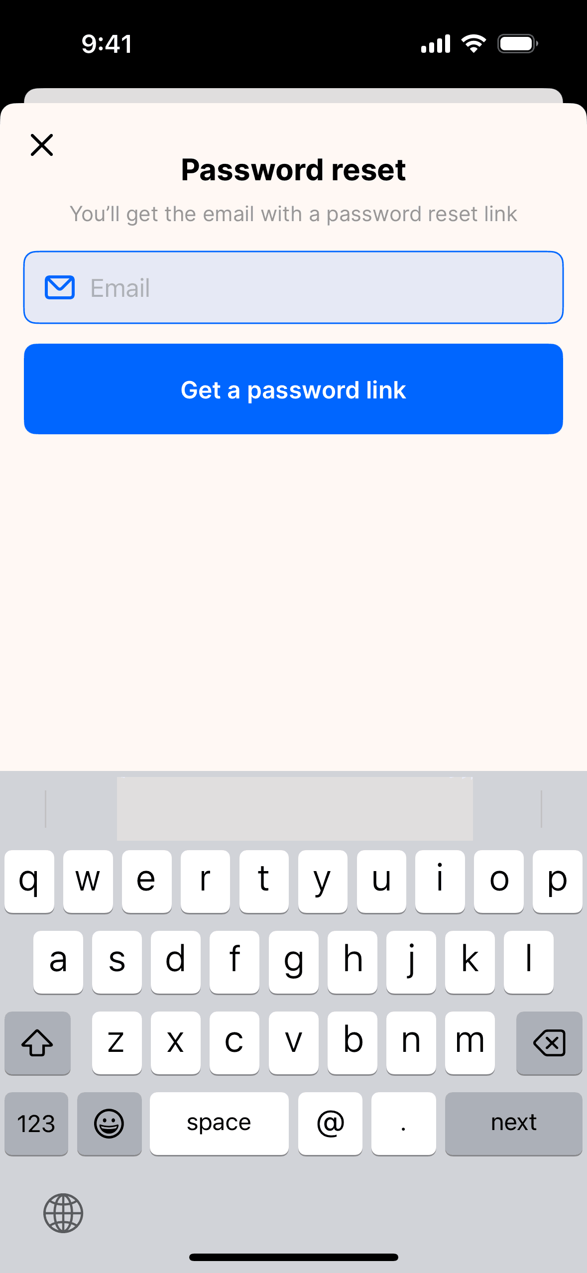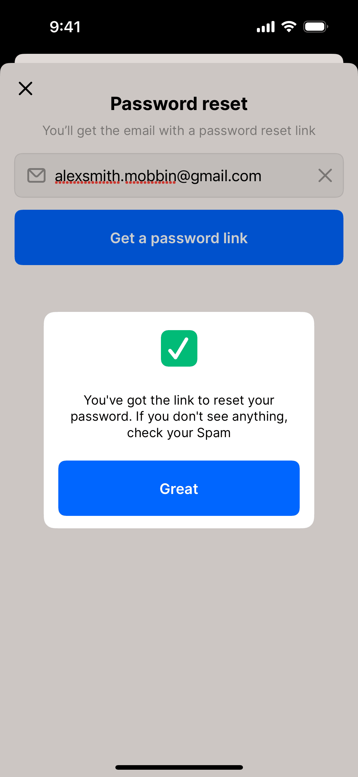 The user initiates a password reset by entering their email. They are then prompted to check their email for further instructions.