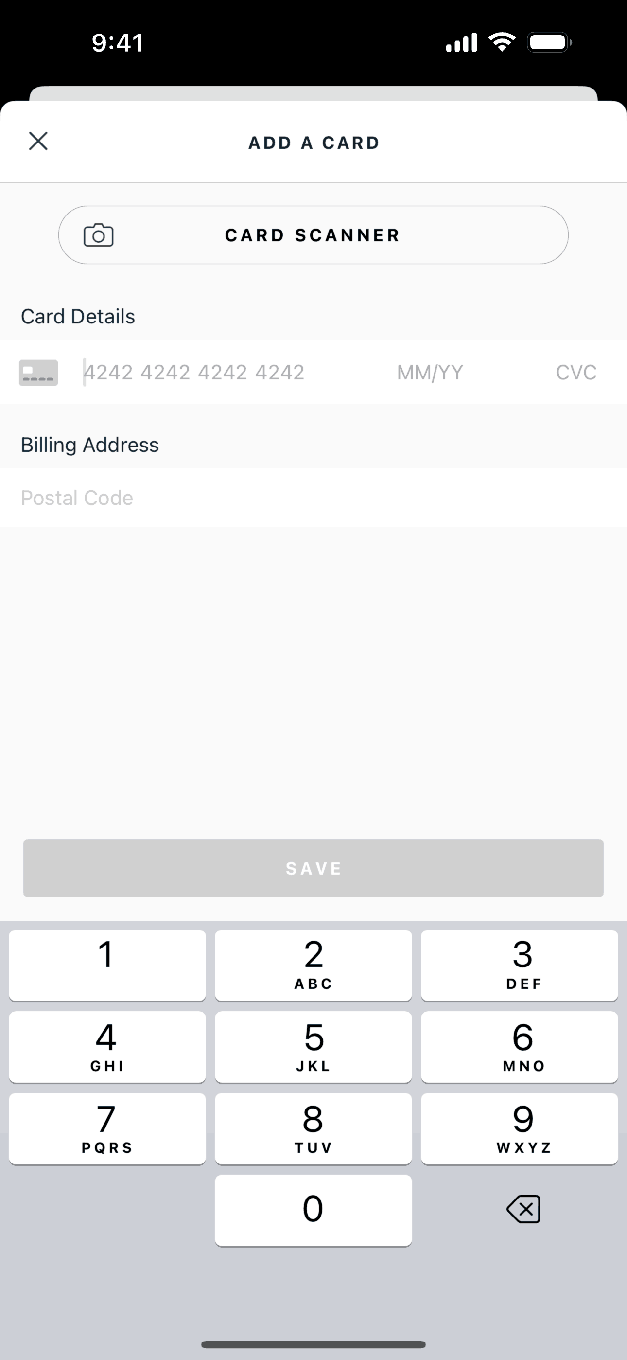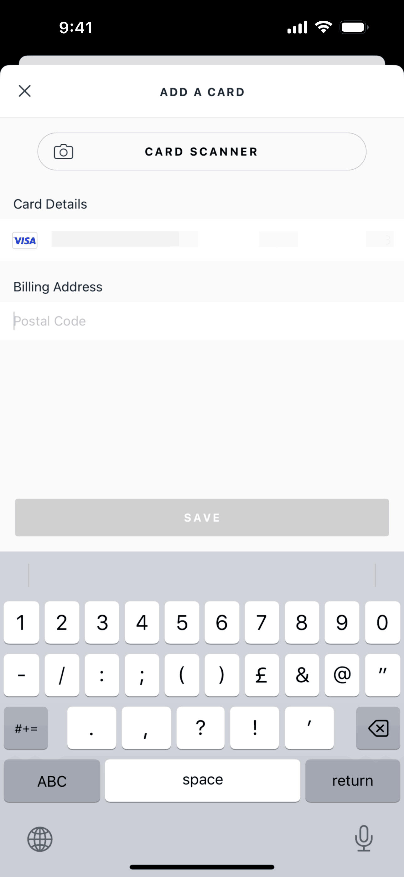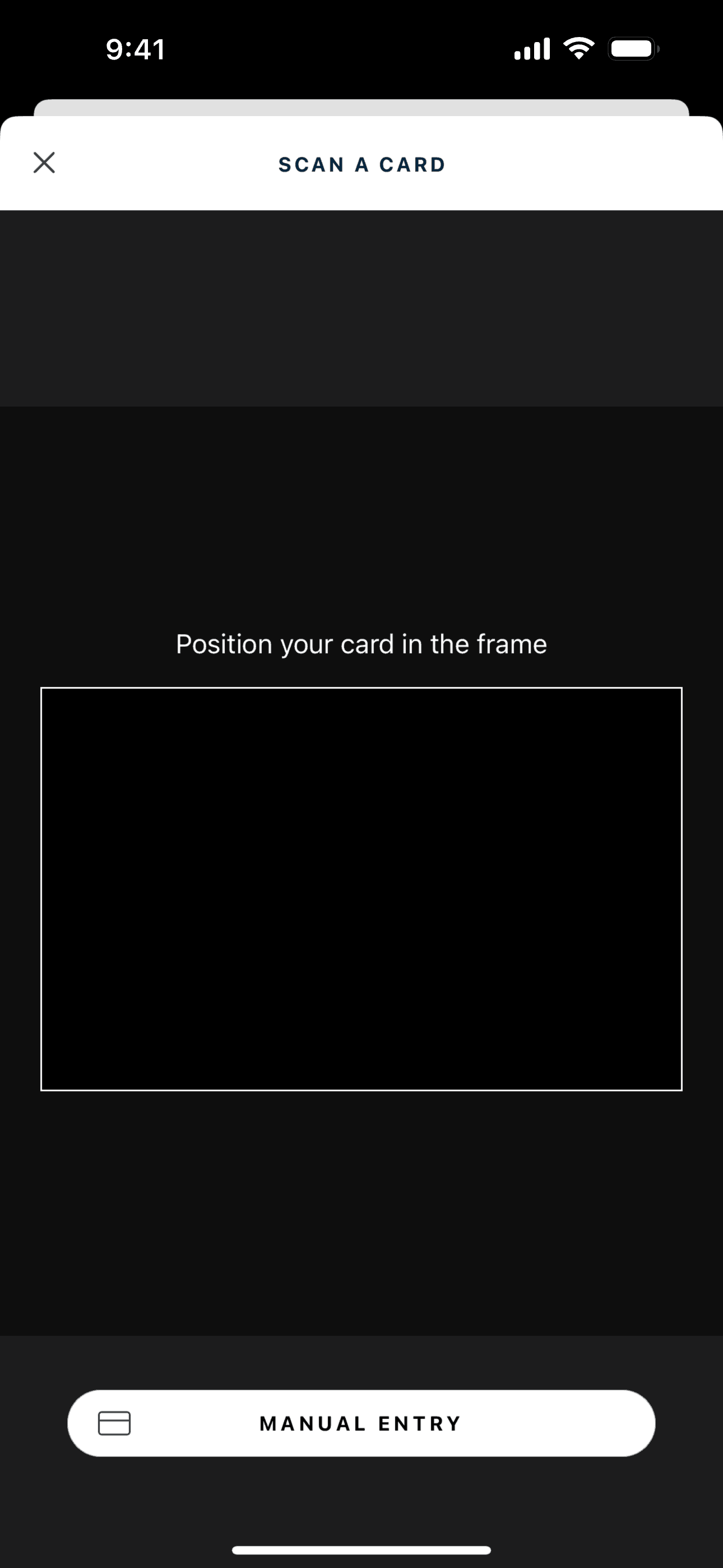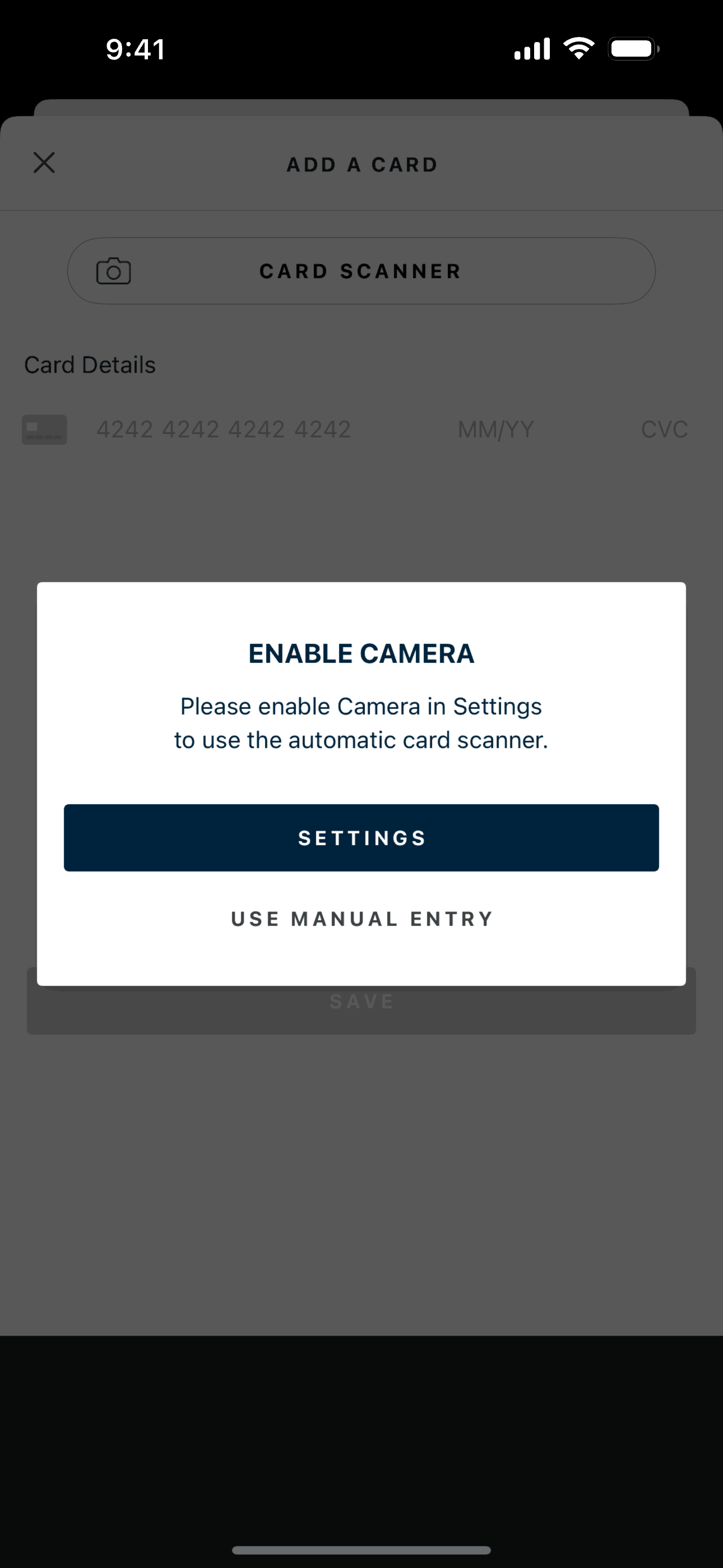 The user flow demonstrates scanning a card to pre-fill card details. It includes camera permission request and manual entry fallback.
