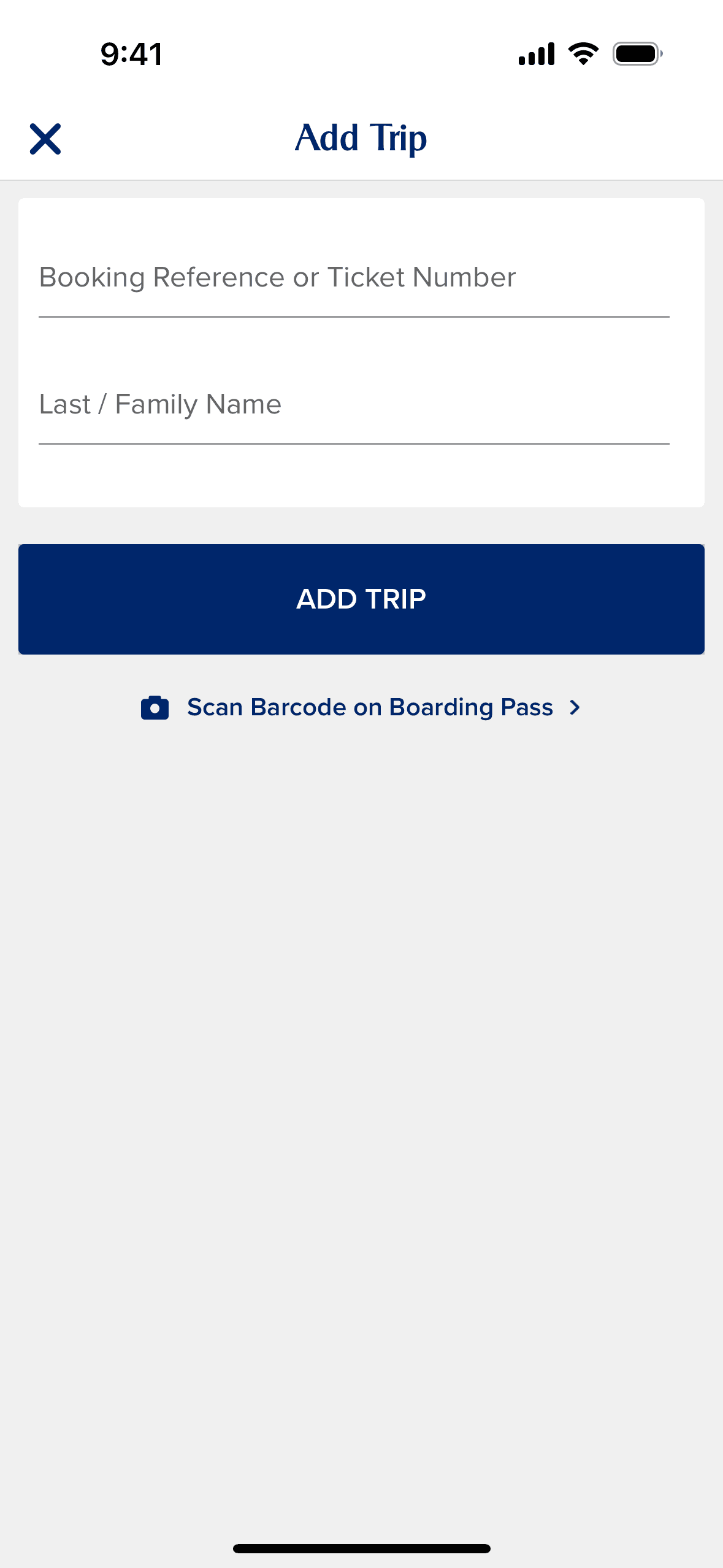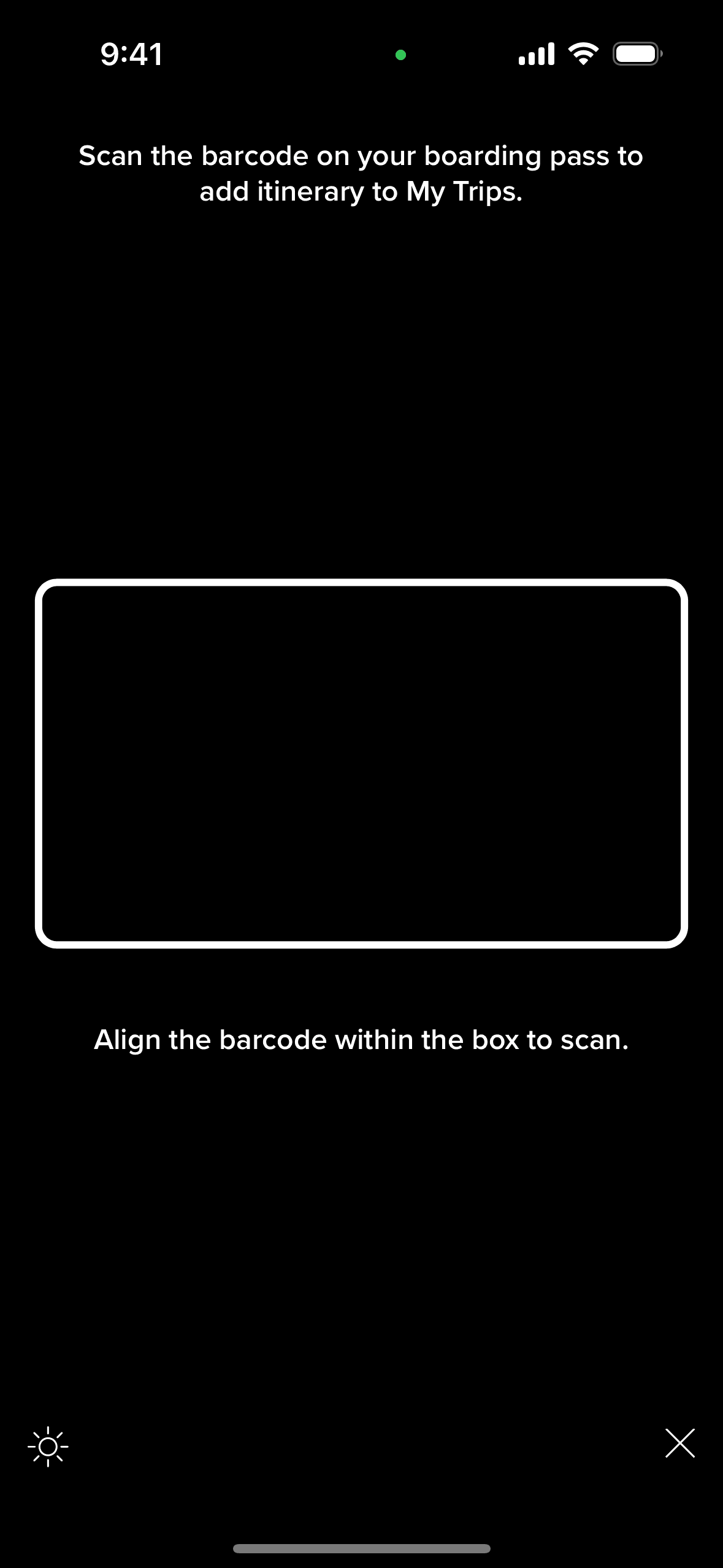 The user flow demonstrates scanning a boarding pass to add trip details. The user navigates to a barcode scanner after choosing to scan their boarding pass.