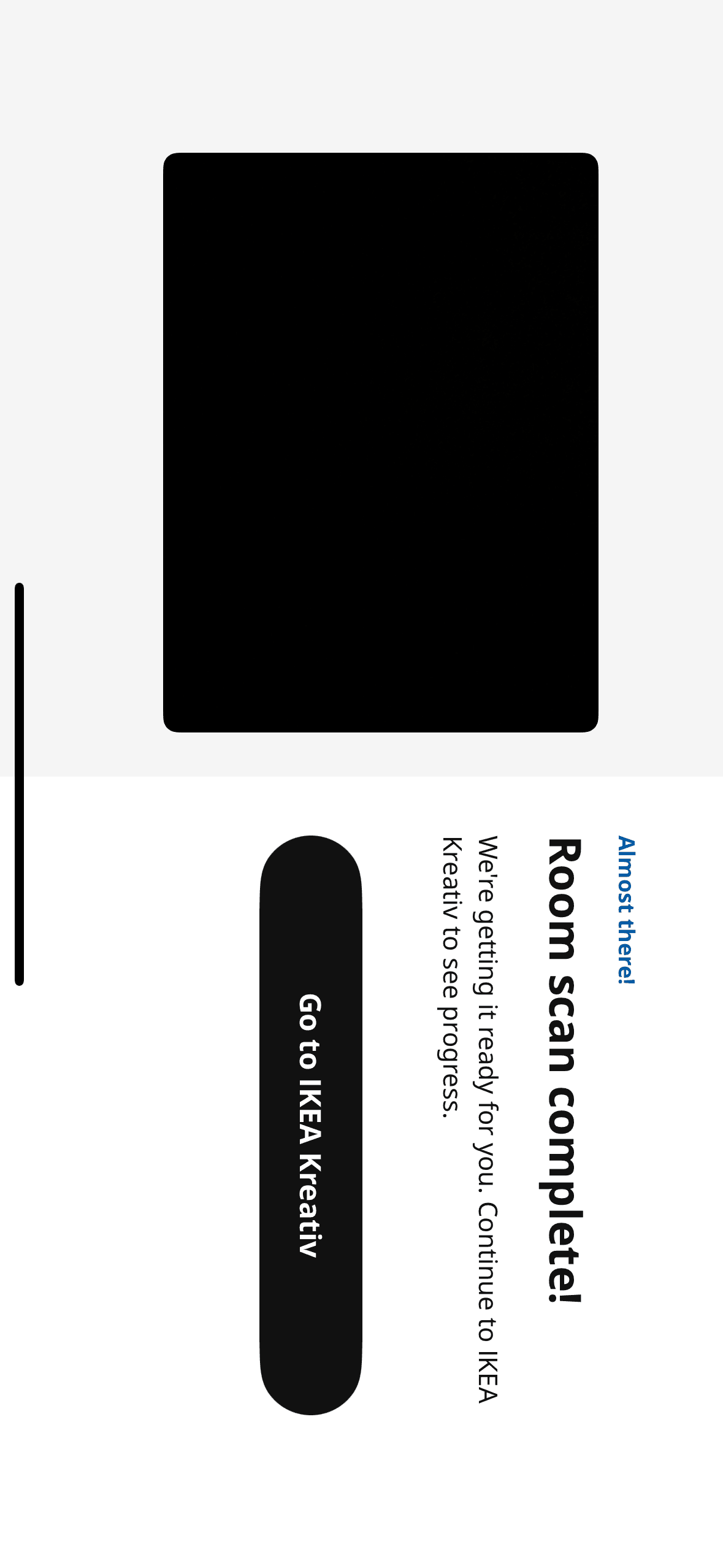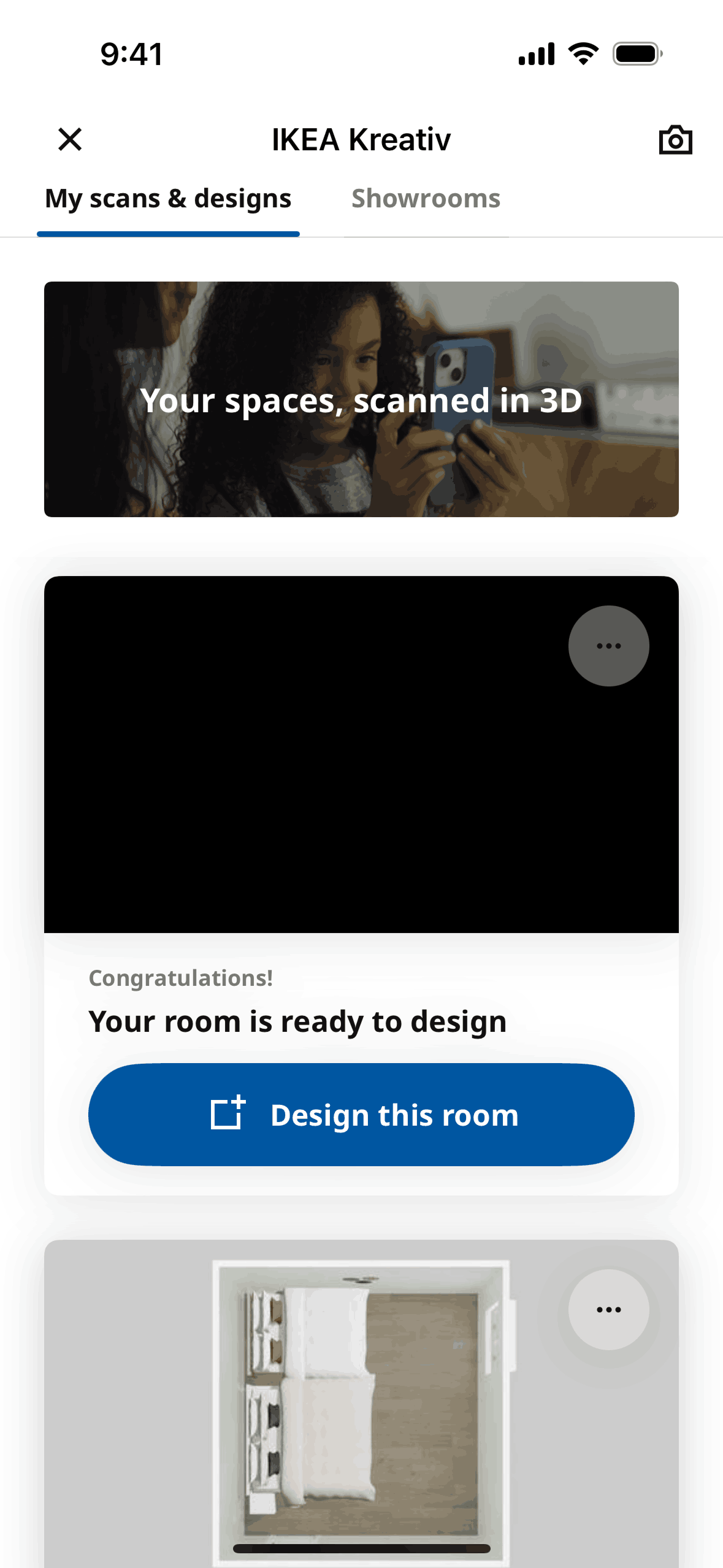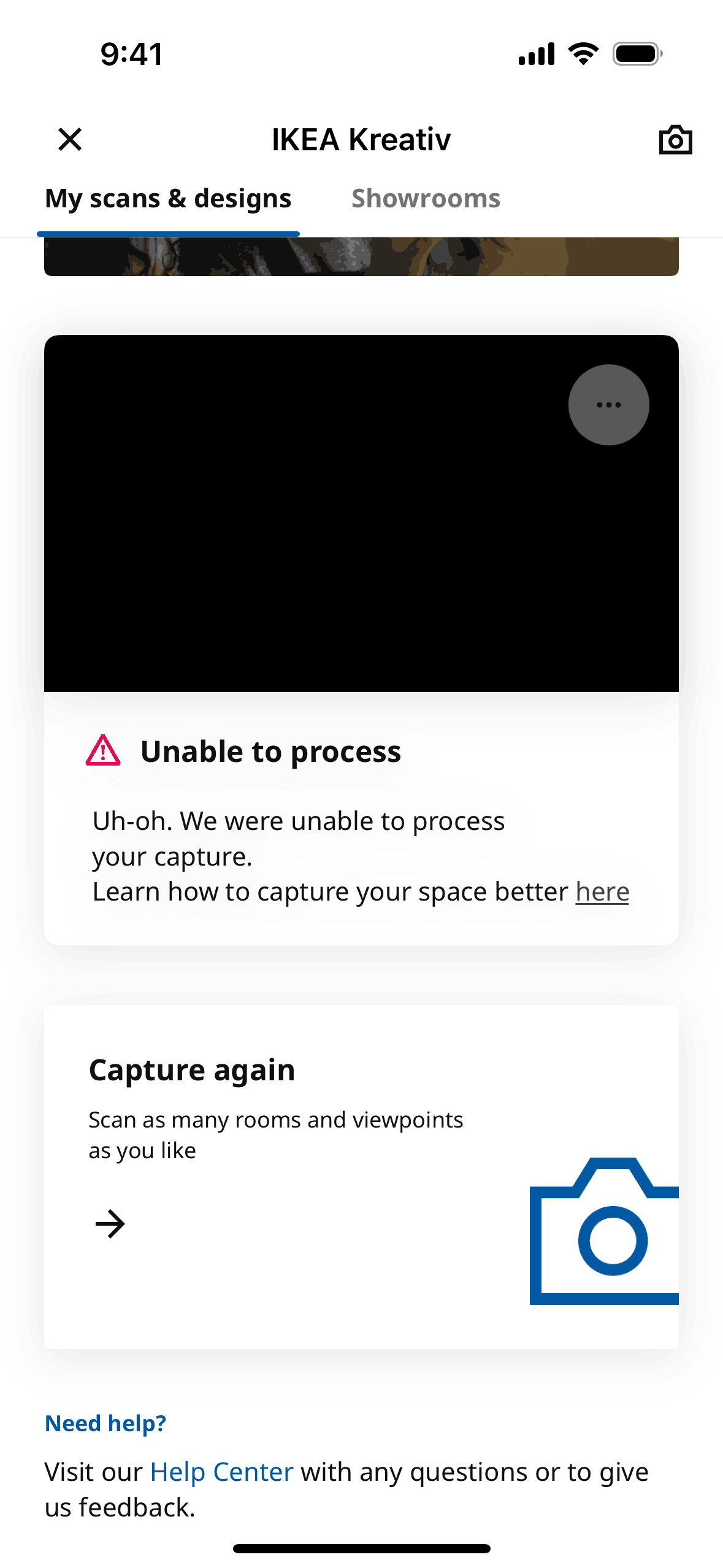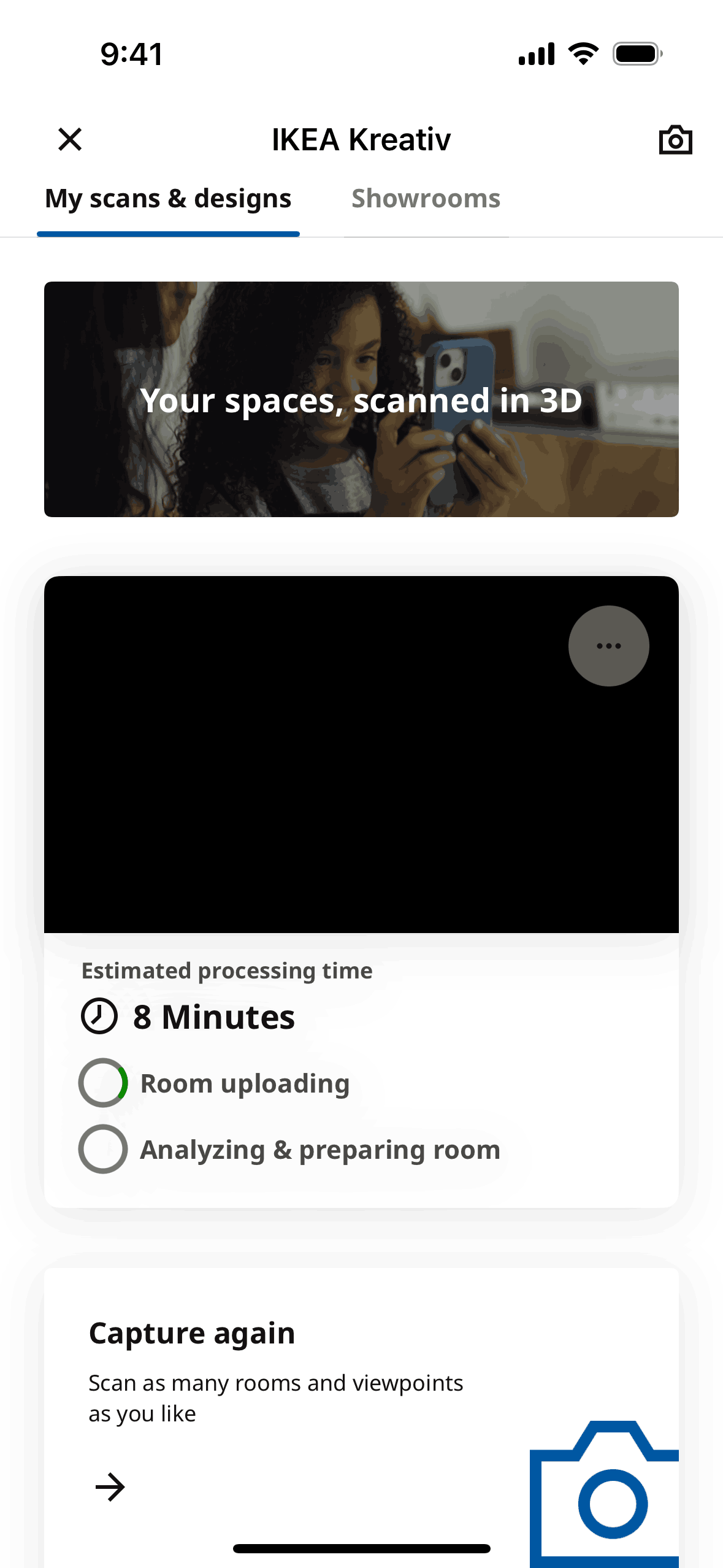 The user scans a room using the IKEA Kreativ app, following instructions to capture the space. The flow ends with either a processed room ready for design or a processing error.