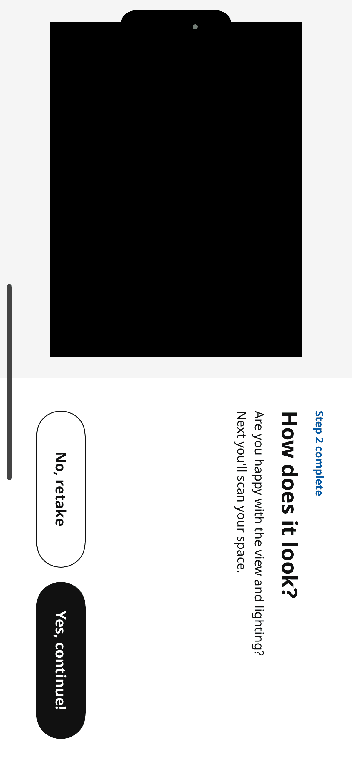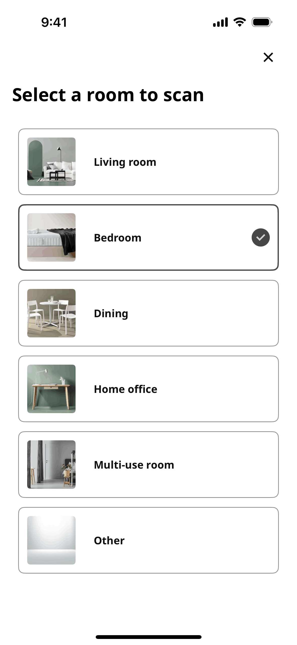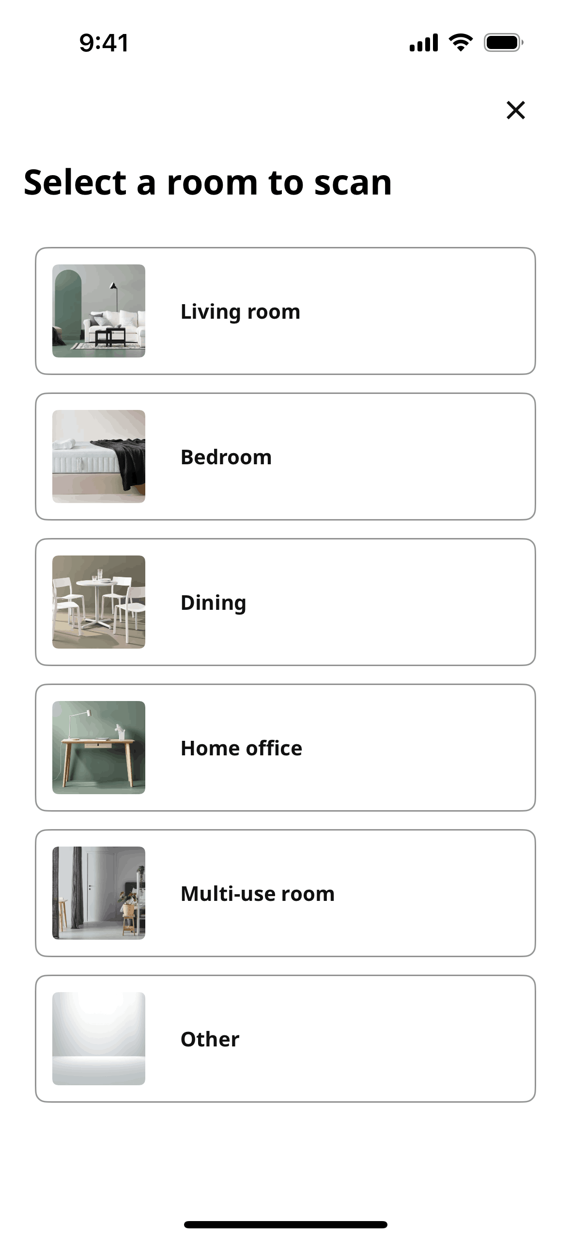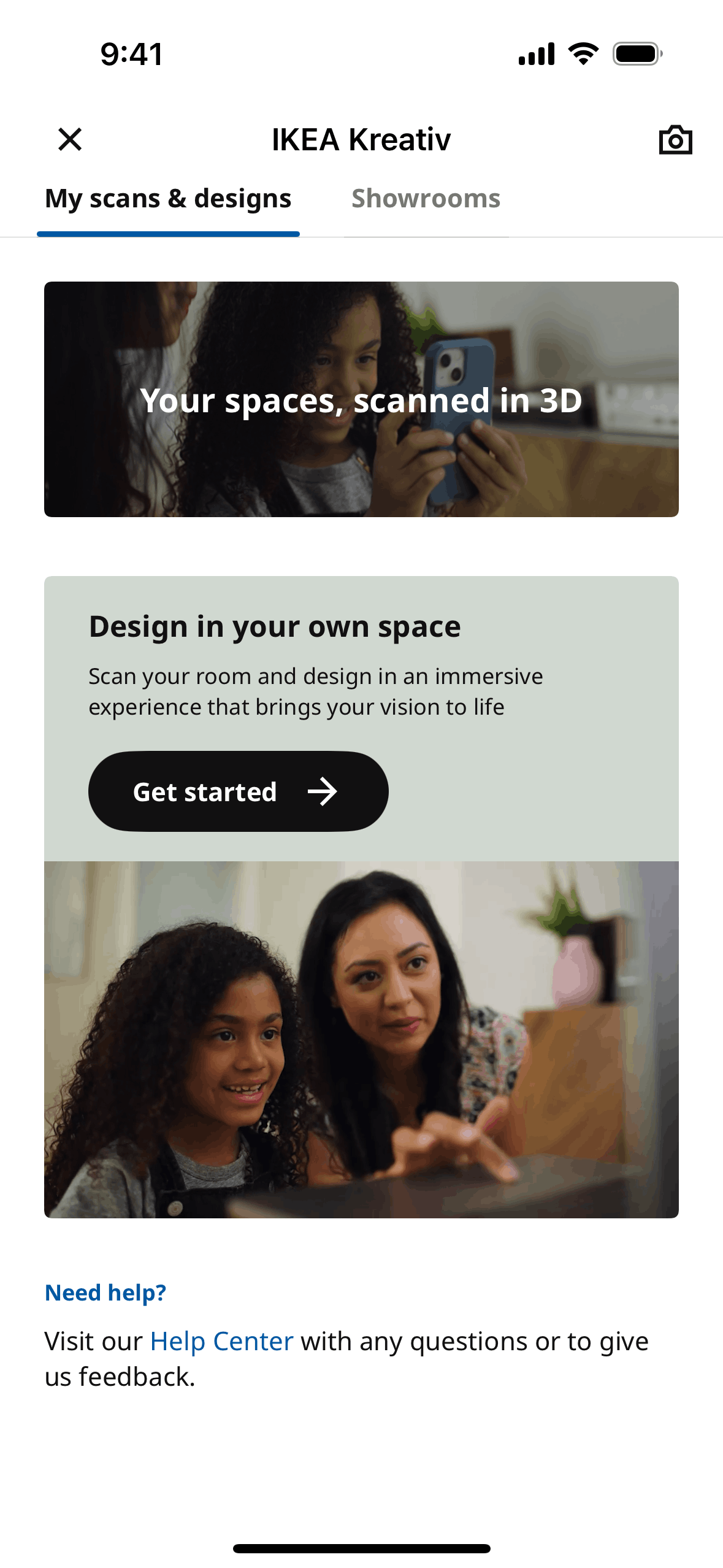 The user scans a room using the IKEA Kreativ app, following instructions to capture the space. The flow ends with either a processed room ready for design or a processing error.