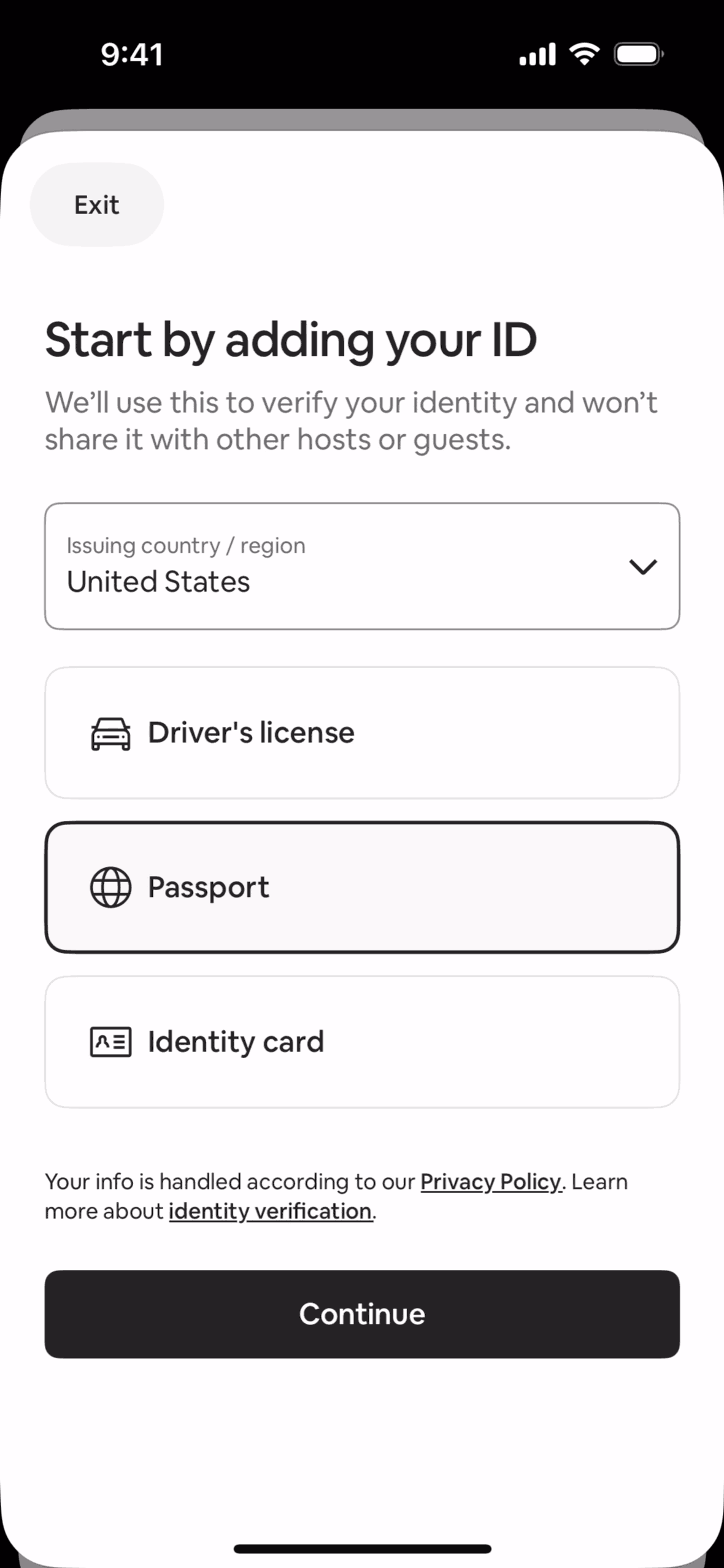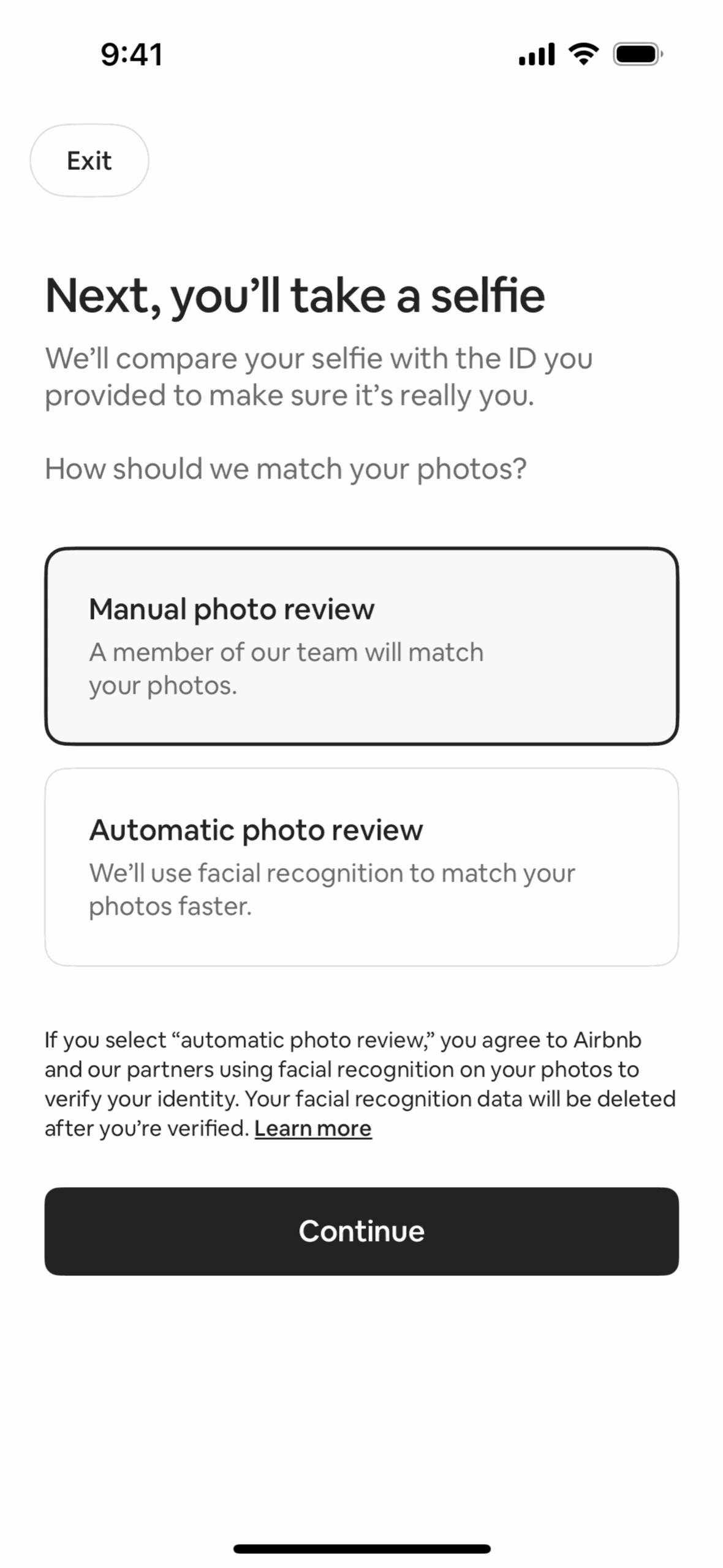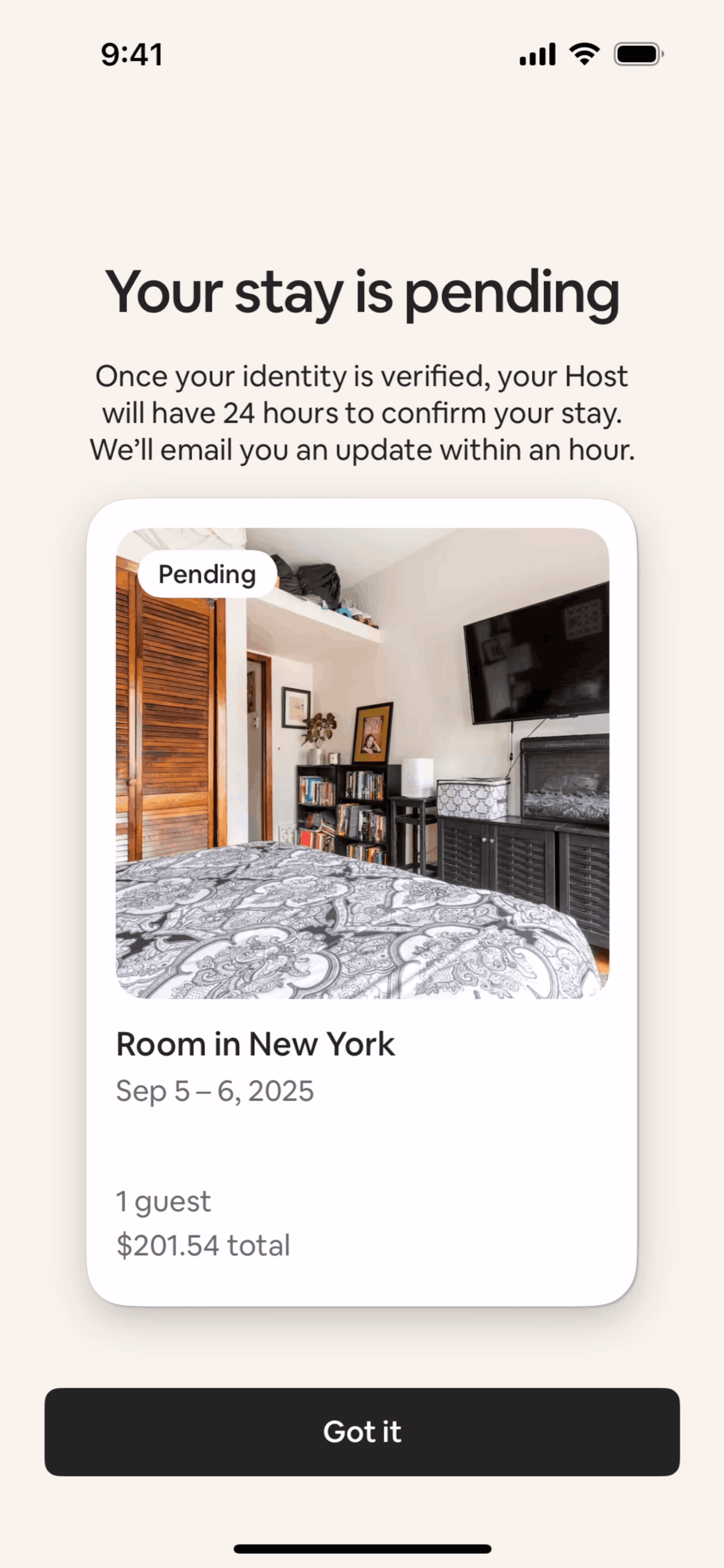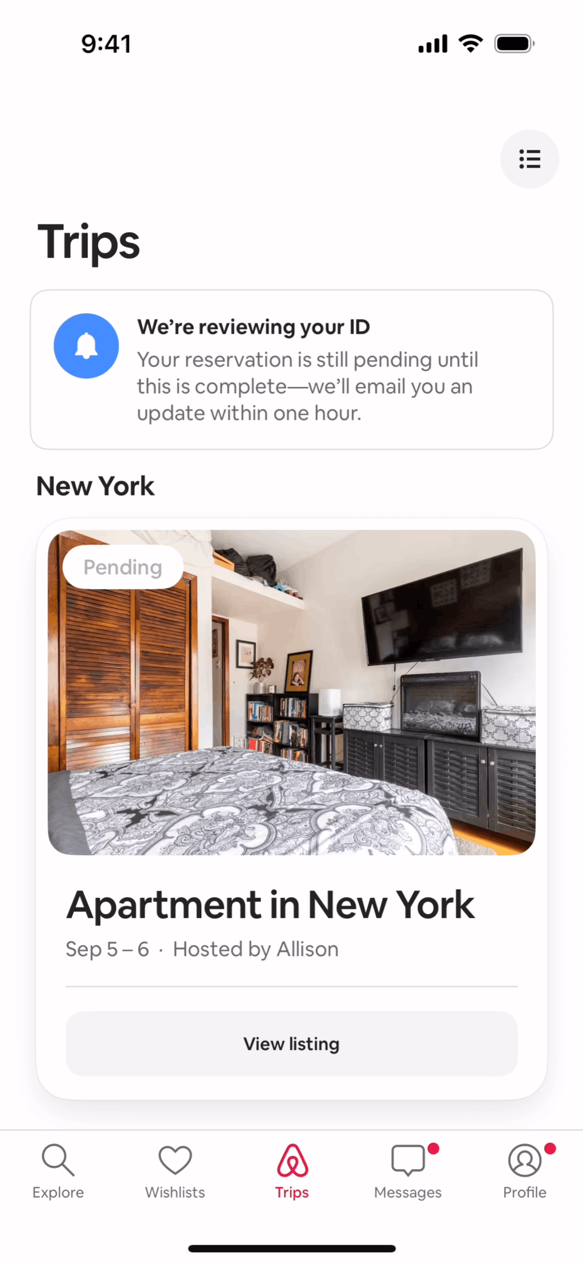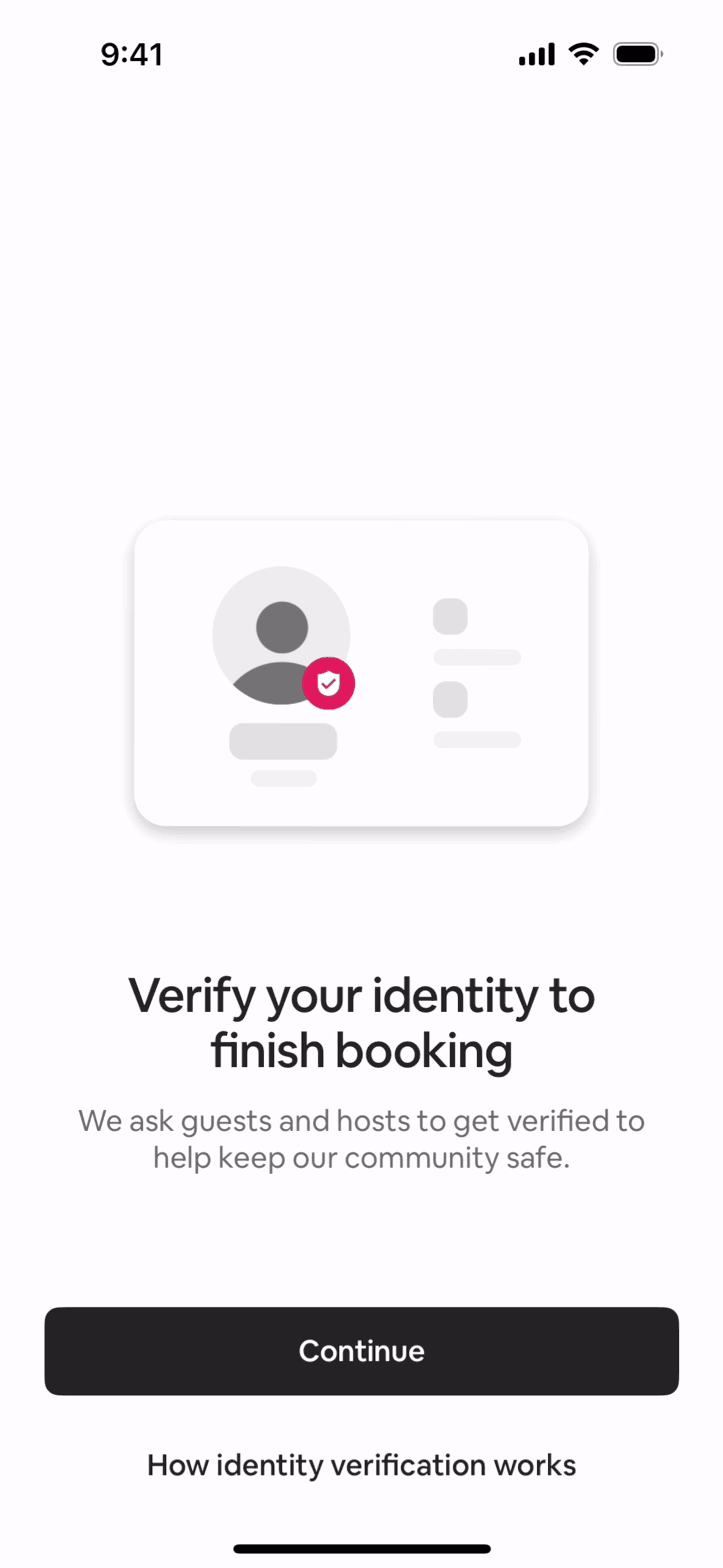The user verifies their identity by submitting a photo of their ID and a selfie. The booking is pending until the verification is complete.