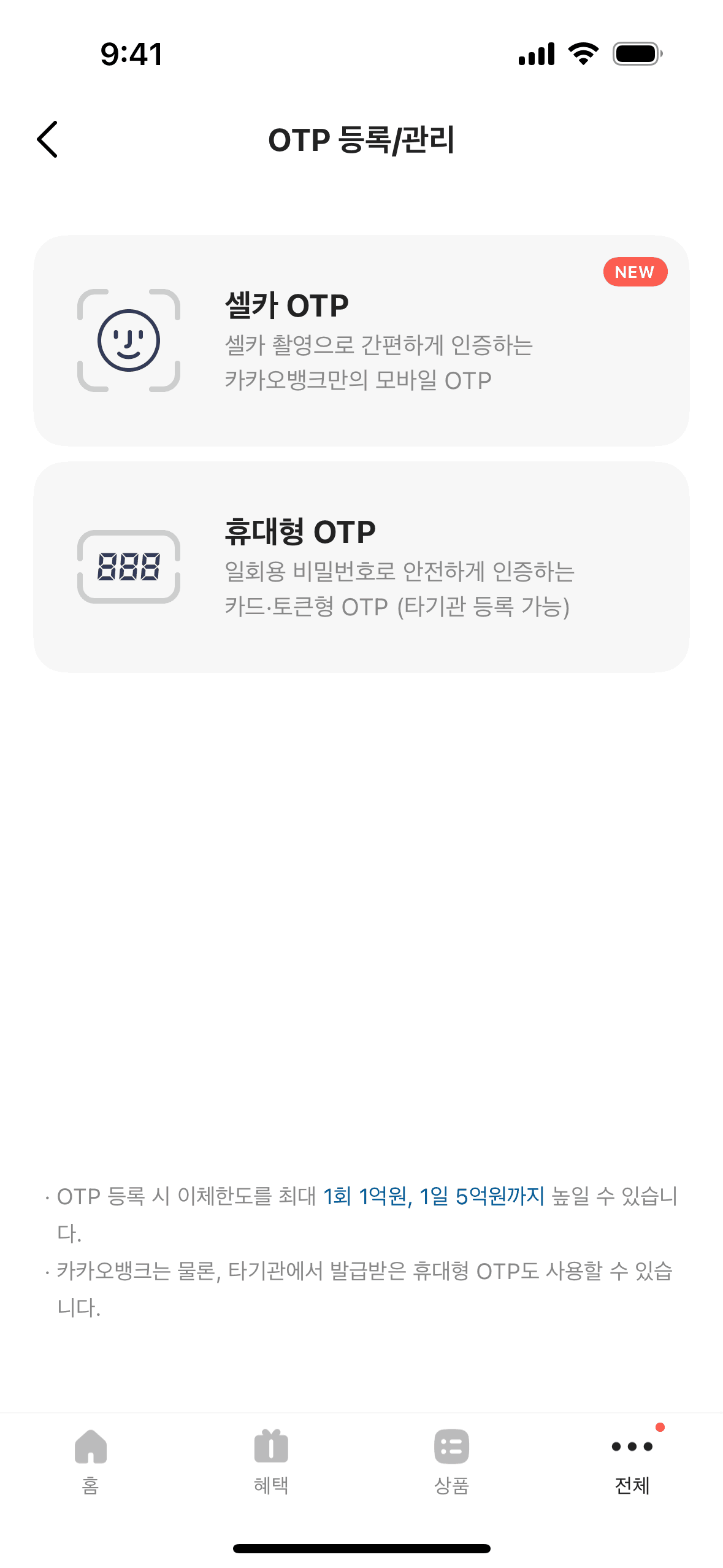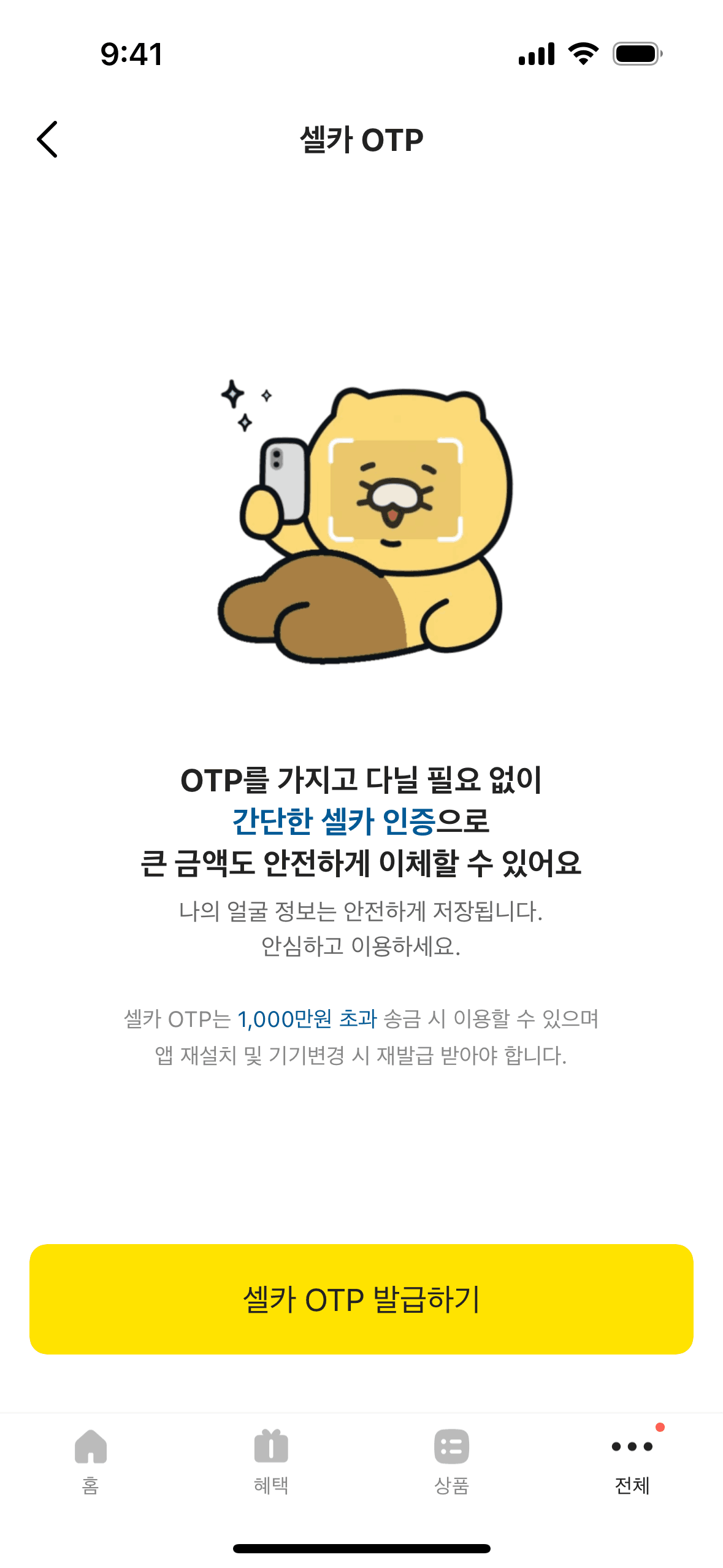 The user flow demonstrates setting up Selfie OTP by navigating through authentication options, agreeing to terms, taking a selfie, and confirming successful issuance. The user successfully sets up Selfie OTP.